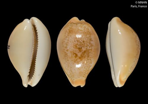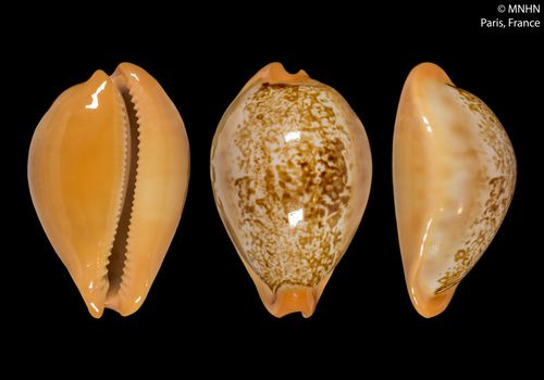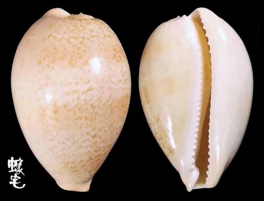 贝壳呈卵圆形,两端微凸出,背部隆起;壳面淡黄色或黄褐色,其上密布红褐色的斑点或花斑,两侧通常呈橙红色,无斑点。