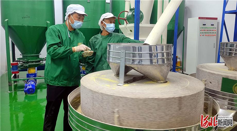 5月8日,在井陉县测鱼镇河北伟栋餐饮管理有限公司煎饼原料生产加工基地,高伟栋(左一)正在查看石磨杂粮的生产情况。河北日报记者董昌摄