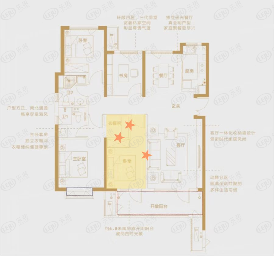 依据户型图来看,黄色区域一小部分作为主卧衣帽间,剩下的为南向次卧空间,这种设计适合居住人口多的家庭,既增加了储物空间又合理规划出居住空间。如果家住人口较少,可考虑将此位置直接改为大型衣帽间,拆掉五角星标注的非承重墙,瞬间扩大储藏空间。南侧连接双向阳台,无论是采光还是通风条件都是极佳的,也可保证衣物的干燥程度,顺便将梳妆台移入也是不错的选择,化妆的朋友们都懂,自然光下画出来的状最不容易翻车。