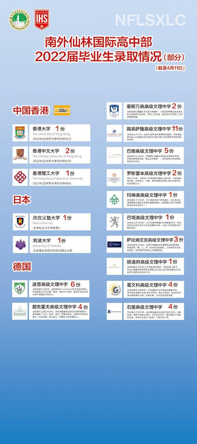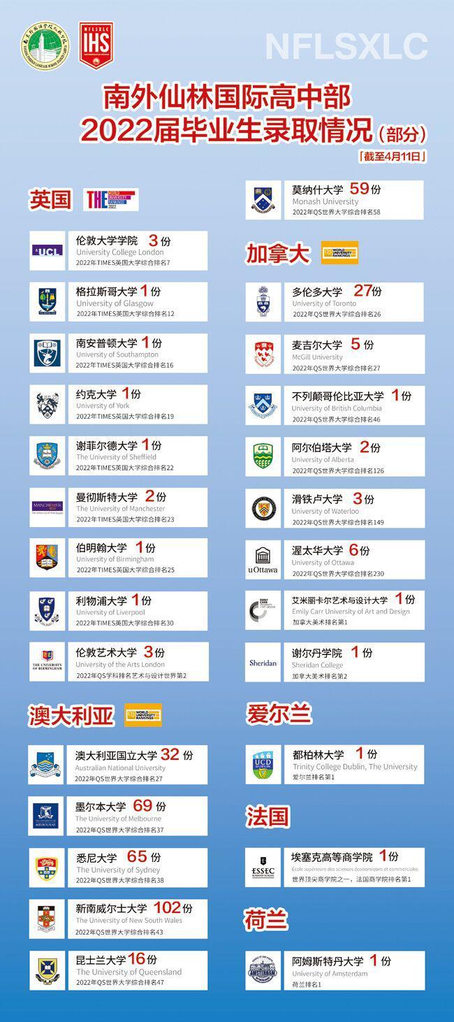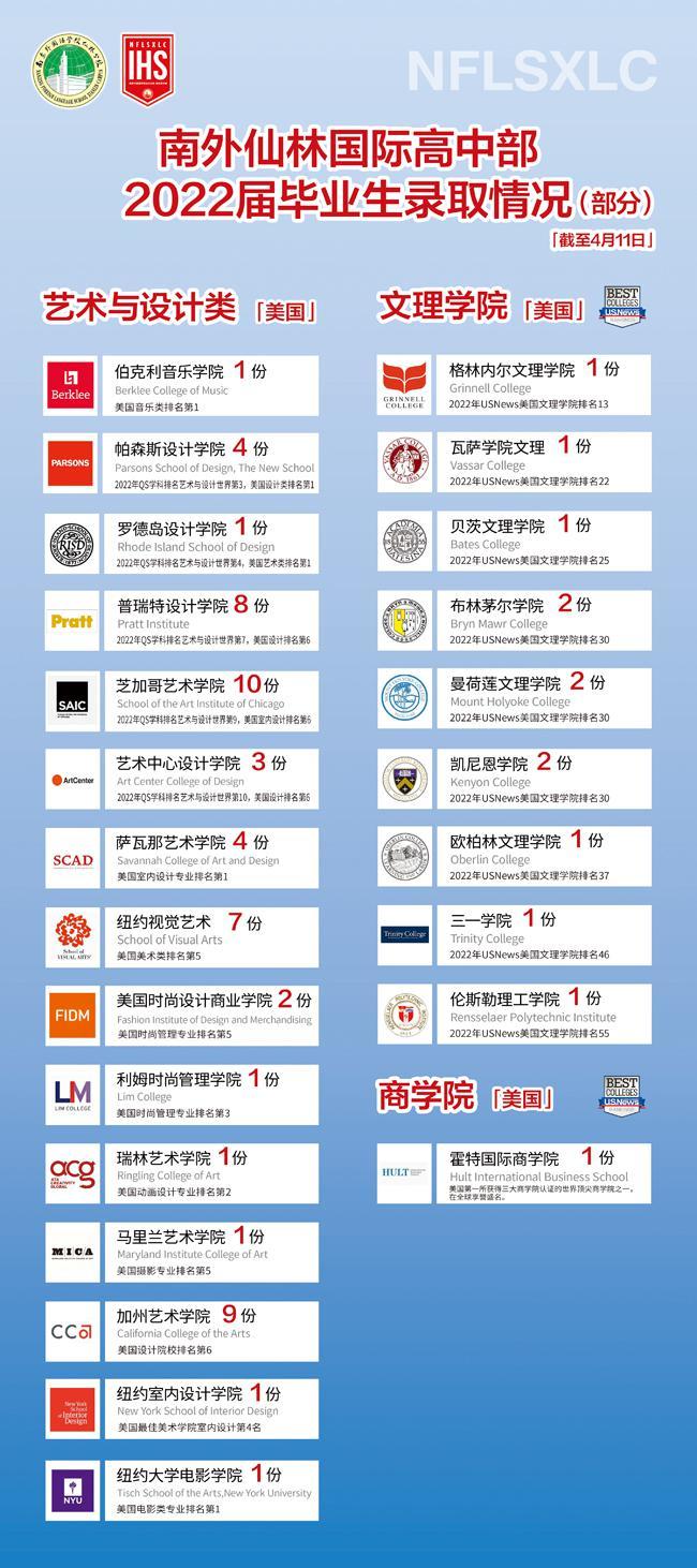 截至5月上旬,2022届国际高中毕业生已收到近900份录取通知书,包括芝加哥大学、范德堡大学、圣路易斯华盛顿大学、康奈尔大学、加州大学伯克利分校、卡内基梅隆大学、纽约大学、罗德岛设计学院、帕森斯设计学院、加州艺术学院、伯克利音乐学院等;以及伦敦大学学院、香港大学、庆应义塾大学、多伦多大学、澳大利亚国立大学等世界名校,共收获奖学金 230 余万美元。