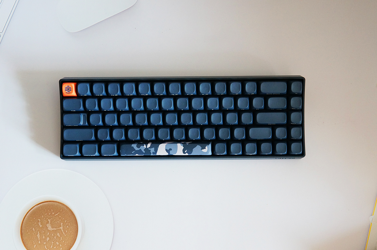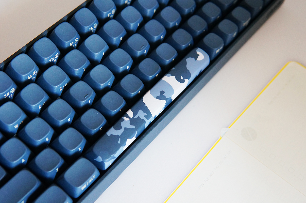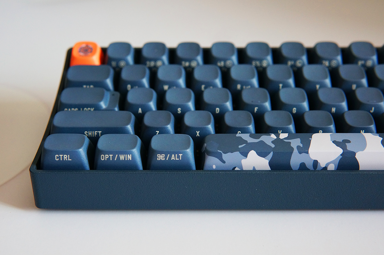 下面来看看键盘的外观,洛斐小翘的尺寸为310*109*51.5mm,重量720g。由于采用的是68键的设计,没有独立的数字键盘,所以整体显得非常小巧。配色方面,虽然它以暗夜蓝为主,但也不是千篇一律,橘红色的ESC键和迷彩涂装的空格键,让这把键盘的颜值拔升了不少。