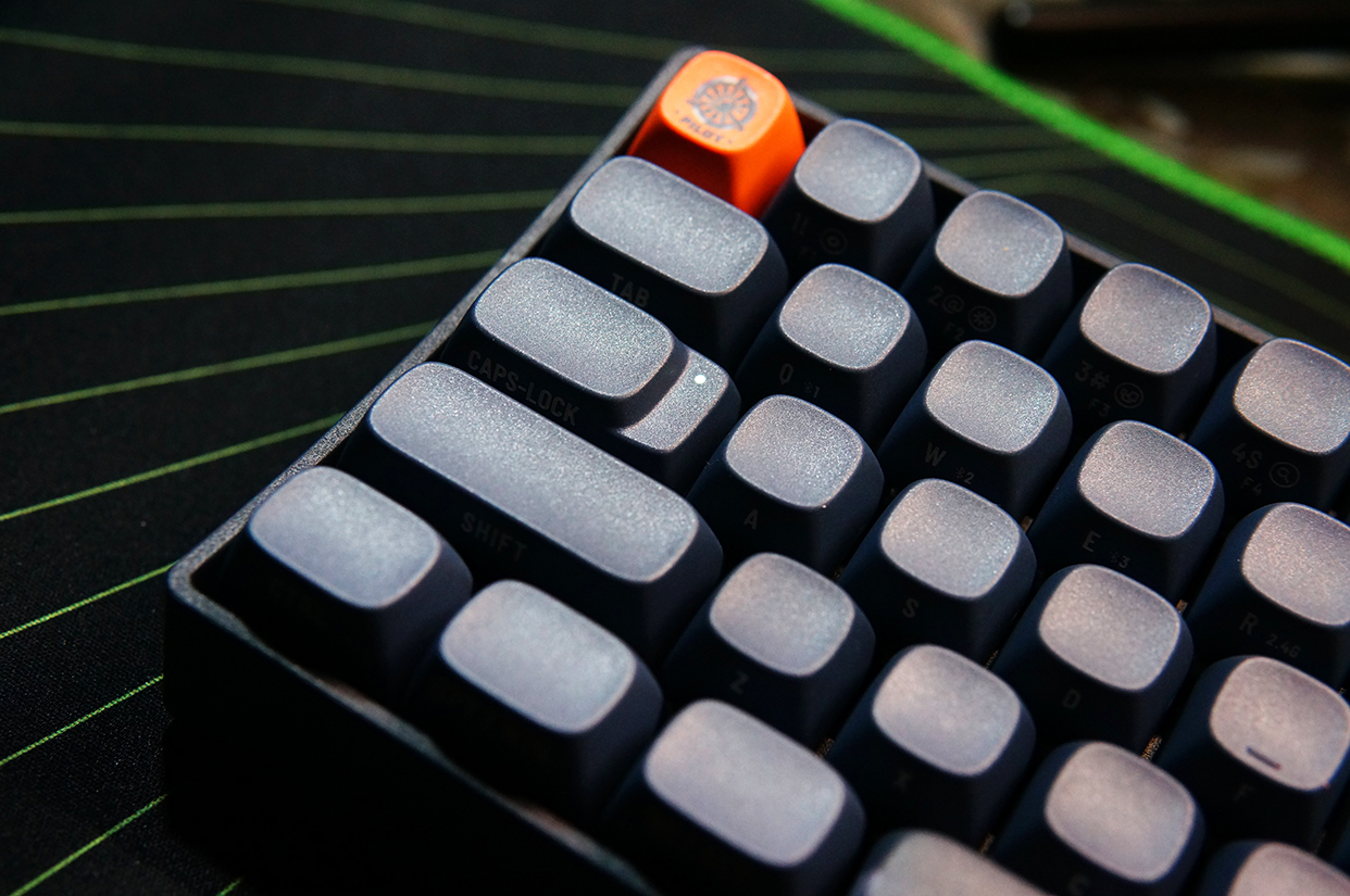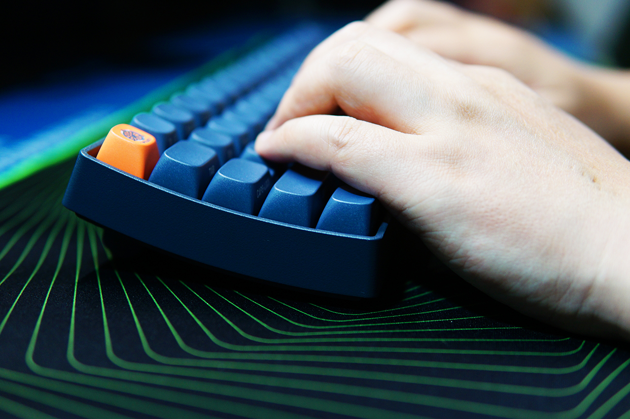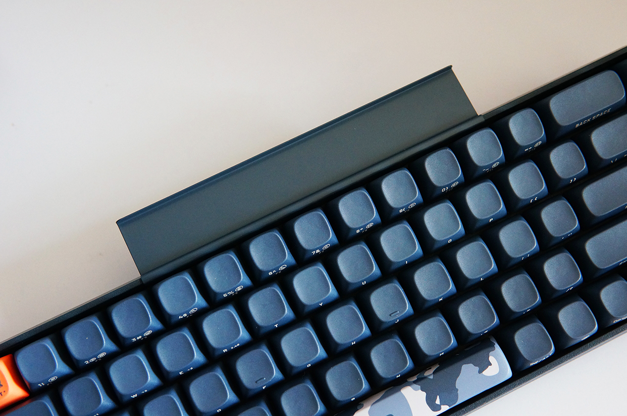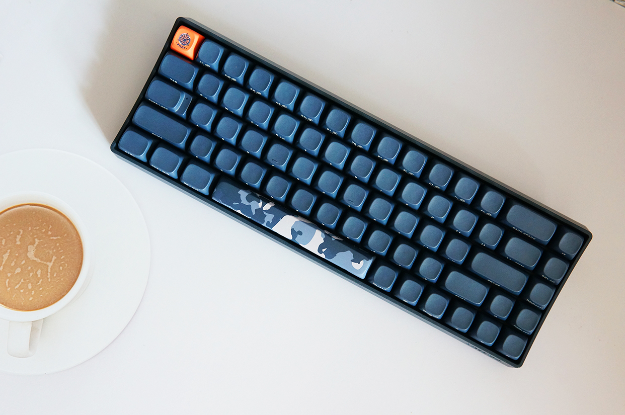 下面来看看键盘的外观,洛斐小翘的尺寸为310*109*51.5mm,重量720g。由于采用的是68键的设计,没有独立的数字键盘,所以整体显得非常小巧。配色方面,虽然它以暗夜蓝为主,但也不是千篇一律,橘红色的ESC键和迷彩涂装的空格键,让这把键盘的颜值拔升了不少。