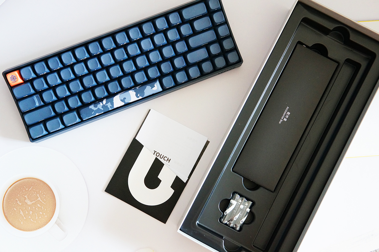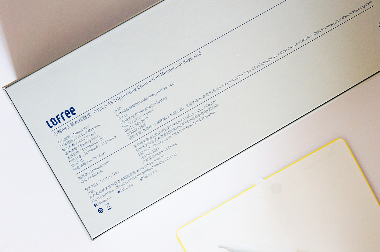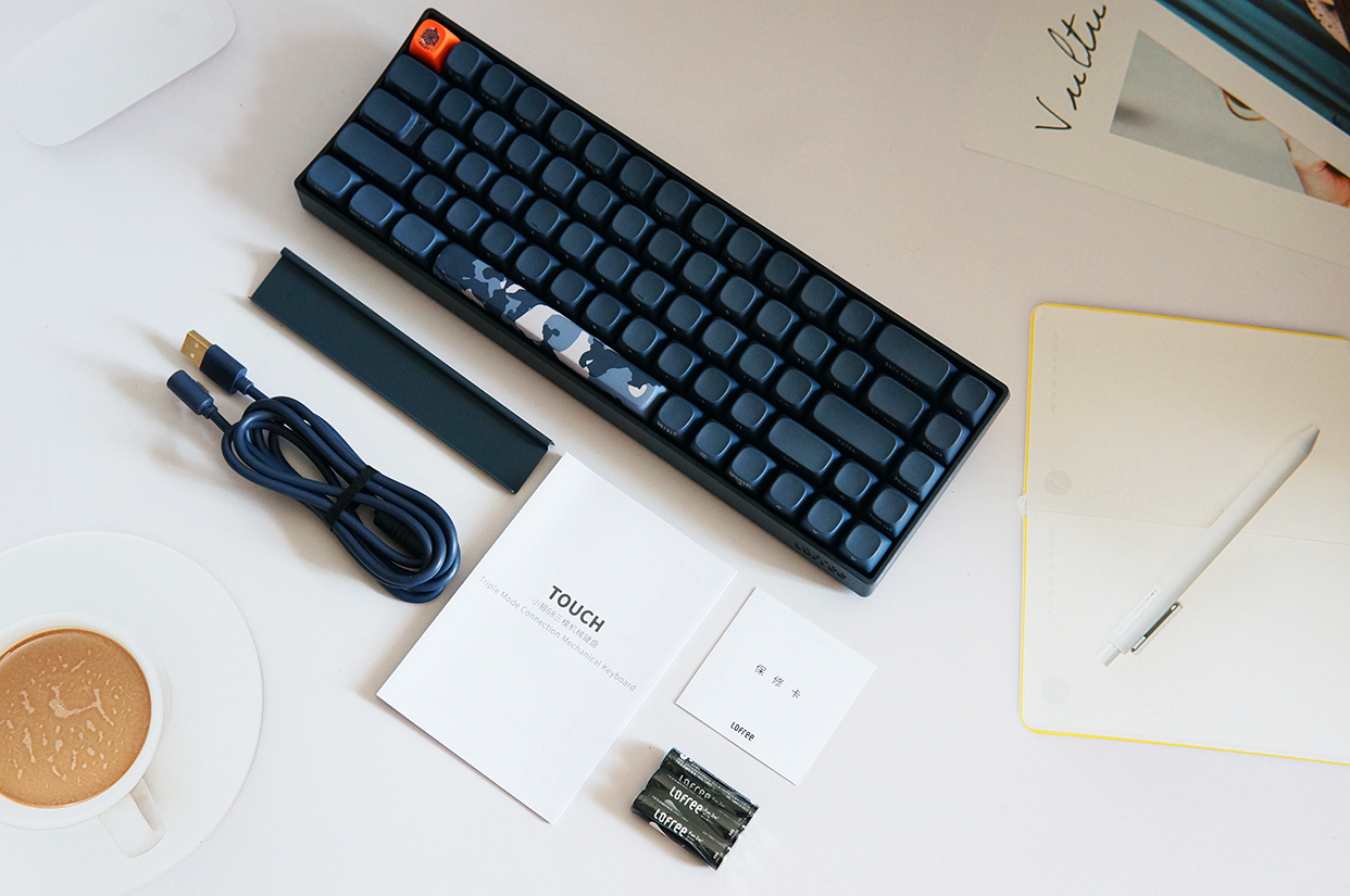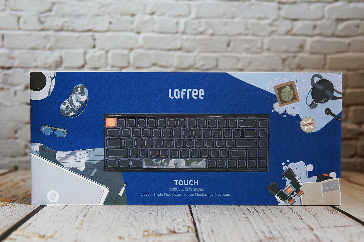 我这把洛斐小翘机械键盘的配色是暗夜蓝,包装盒上也是以蓝色为主调,再搭配迷彩等元素,看上去还挺有运动感的。