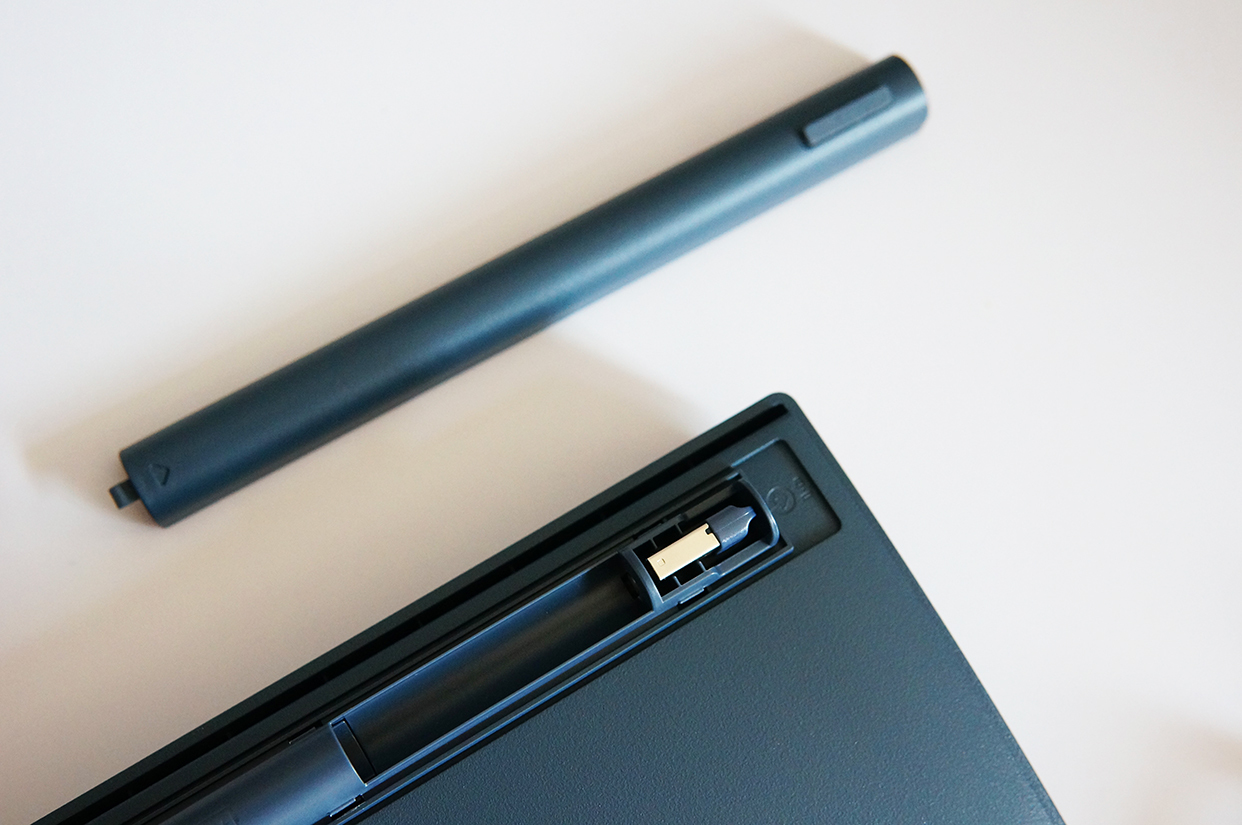 洛斐小翘机械键盘没有内置锂电,而是采用3节7号电池供电,打开电池仓,可以看到里面还收纳了2.4G的无线接收器。