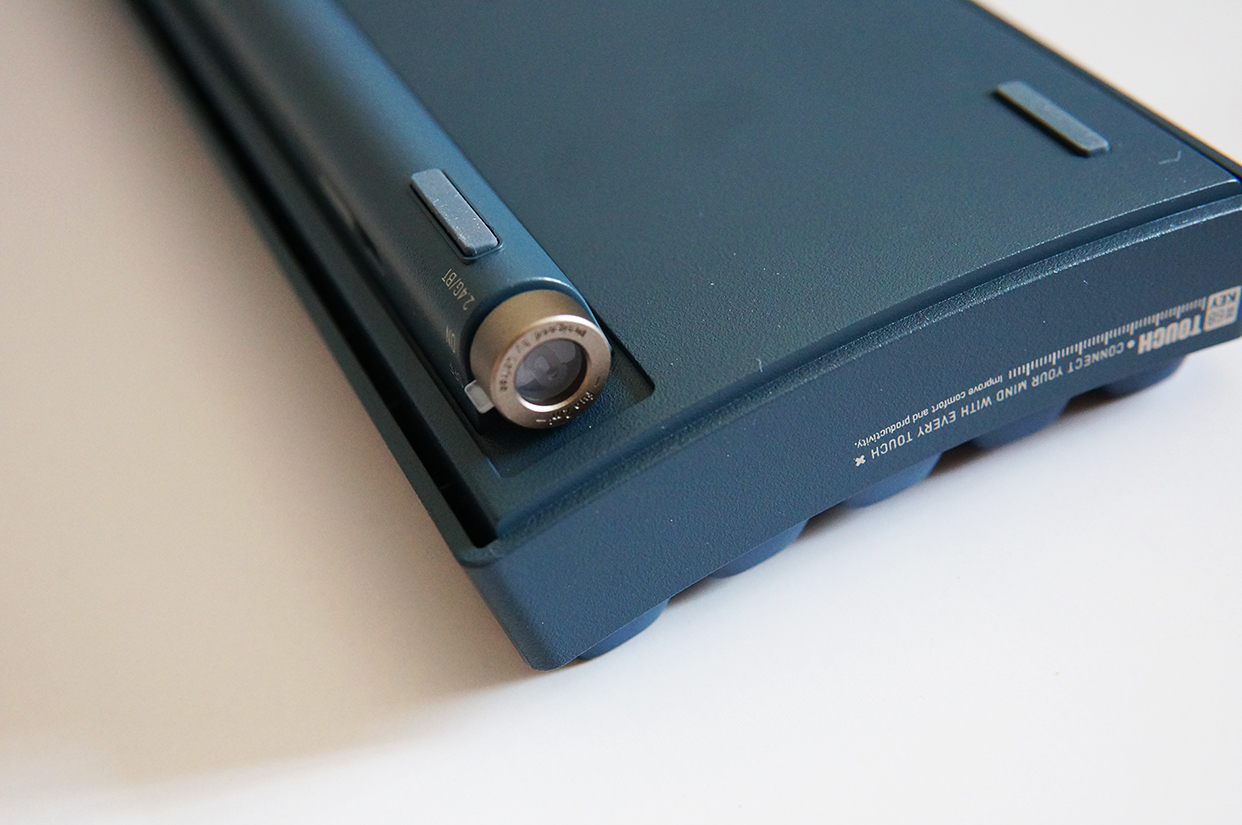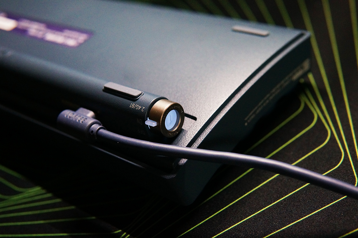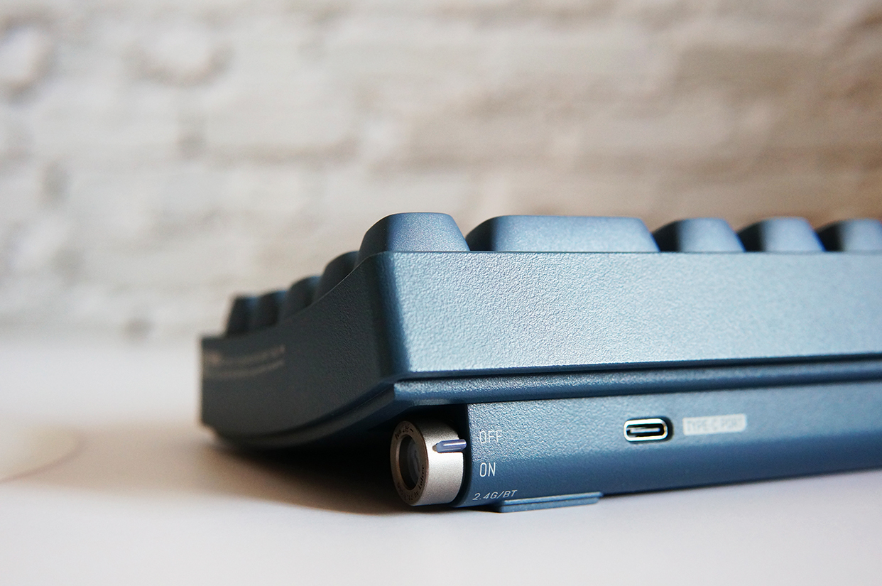 键盘的开关比较有意思,采用的是两档拨钮设计,第一档是有线模式,第二档是无线模式,包括2.4G和蓝牙。