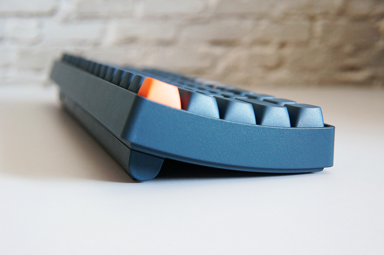 这把键盘的键帽表面看不到任何印字,而是别出心裁地把字母都印在了前侧,这样的好处在于手指不会接触到印字,所以就不会出现字迹磨损的情况。