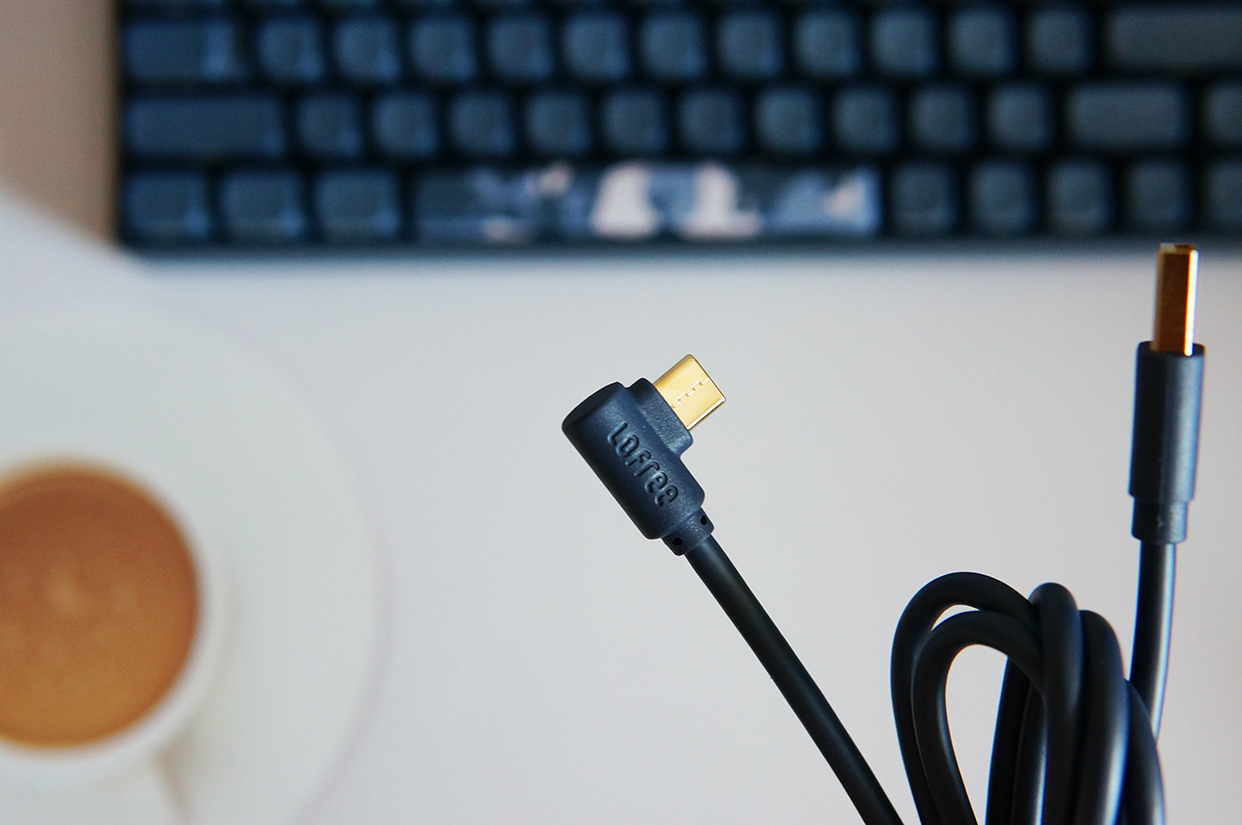键盘附送的Type-C连接线接口设计成了直角,这样插上去后,会显得更加美观。