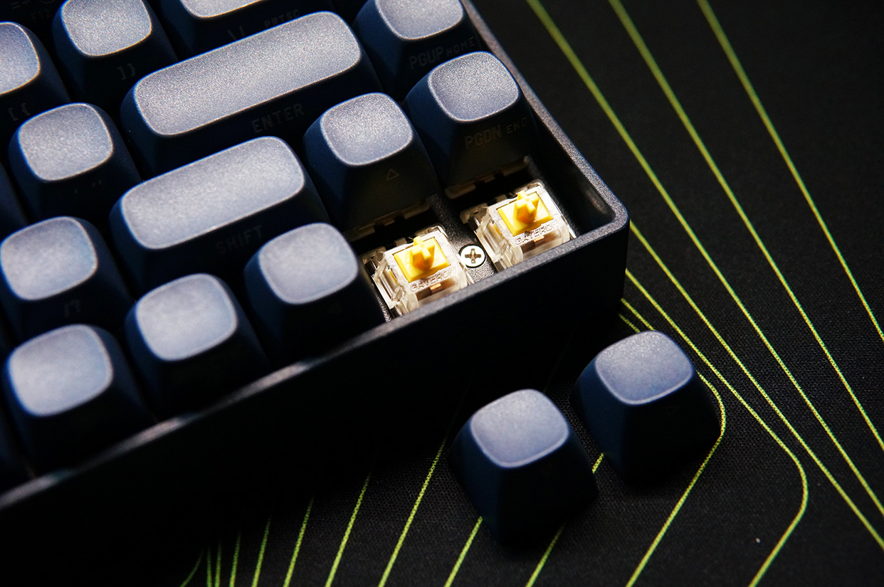 轴体是机械键盘最关键的部位,下面拔下键帽来看看。洛斐并没有随机附送拔键器,不过作为电脑玩家来说,家里自然少不了这个,当然还是希望厂家能够送一个最好。看到黄色的轴体了吗,小翘采用的正是佳达隆的黄轴Pro,这算得上是一种万能轴,手感丝滑,能够兼具办公和游戏用途,而且每颗轴体都具备8000万次的输入寿命。