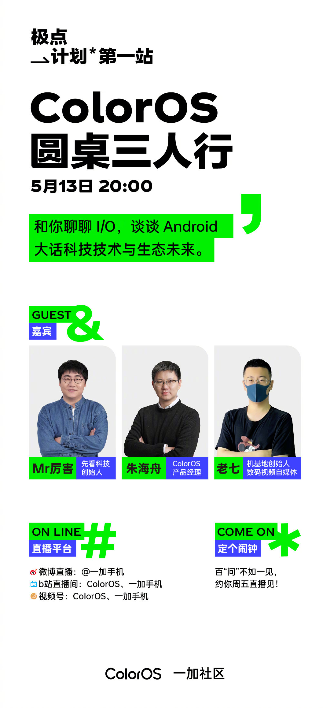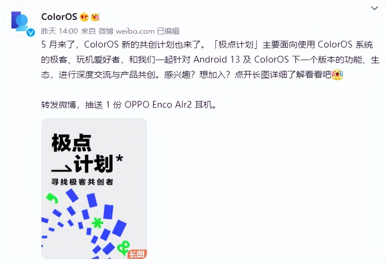 现在直至5月20日,ColorOS官方微博将不定时发布「极点计划」的互动收集或共创议题,想参与的朋友及时留意相关内容并参与即可。