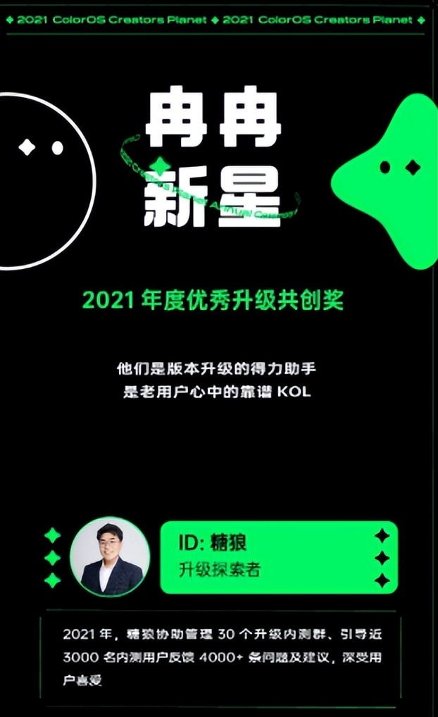 「共创者星球盛典」是为了表彰一年辛勤付出的优秀共创者们所举行的盛典,比如在去年OPPO就授予了不少共创者奖项。在2021年度ColorOS优秀共创者表彰名单中,就包括ID为「糖狼」的共创者,据悉在2020年8月,该共创者就被邀请担任升级测试项目的管理员,简单来说就是工程师与用户之间沟通的中介。而在2021年,「糖狼」就协助管理了30个升级内测群,引导了近3000名内测用户反馈4000+条问题及建议。