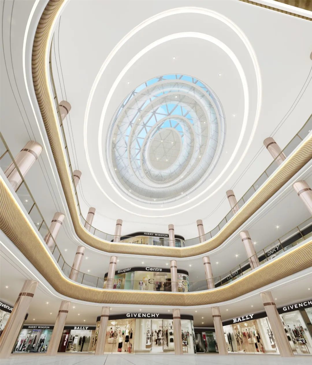 为了营造更舒适休闲的购物环境, 同安爱琴海购物公园通过挑高设计,让整个项目的空间更加空旷、视野更加开阔。半透明玻璃装饰的超大穹顶、云线状的空间切割,让同安爱琴海购物公园沉浸感十足,营造一种自由、灵动、通透又朦胧的梦幻体验氛围。