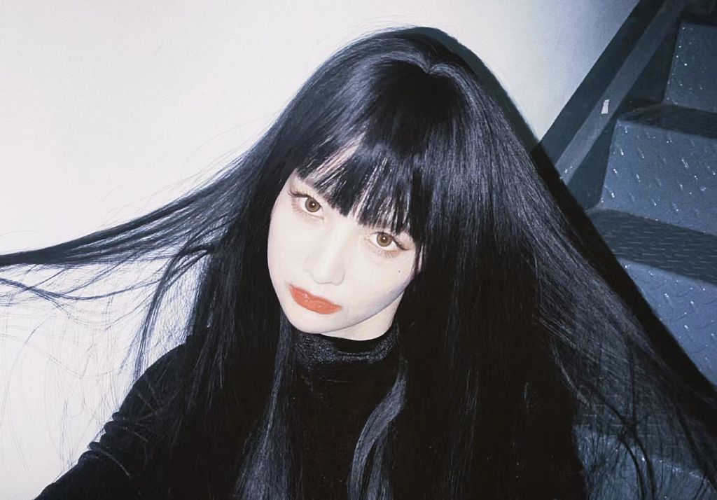 赵粤晒齐刘海造型写真 黑发红唇变鬼马少女