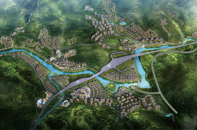 以山体作为大的景观背景,结合现有水系、基地形态、村庄形态和植被现状,将温泉浴场和其它休闲、娱乐设施有机结合,形成水系、山体、建筑、植被和村落的自然统一。规划区以滨水、近山、生态为特点,娱乐游憩活动与景观开放空间有机结合,使得内外生态系统更加整体化。