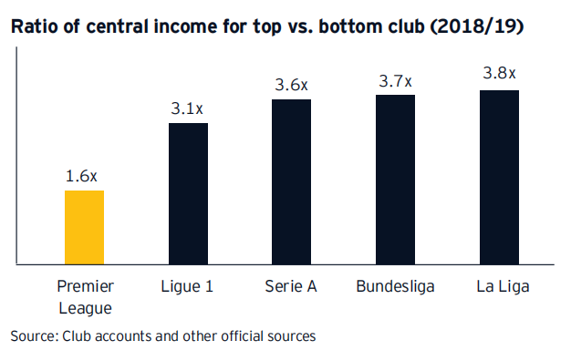 版权收入高的另一好处是,英超头部俱乐部和底部俱乐部的“贫富差距”在五大联赛中最低。这反映到比赛本身,就是拉近了球队之间的阵容差距,并让比赛变得更富悬念。