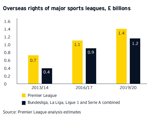 而在海外版权的销售方面,英超更是一骑绝尘。由于常年与其他四大联赛拉开巨大差距,在对比图中安永直接使用了西意德法四大联赛相加的数据,来和英超对比。结果显示,英超在海外转播收入上,对四大联赛总和长期保持优势。在19/20赛季,英超联赛海外转播收入14亿英镑,其他四大联赛相加为12亿英镑。