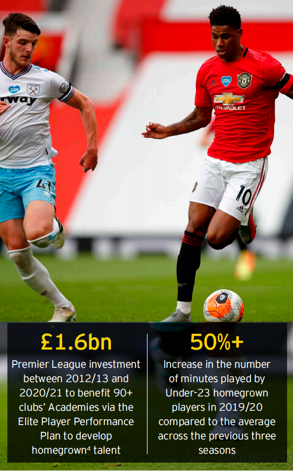 此外,虽然并未出台强制规定,但英超联赛的U23球员出场时间在19/20赛季依然比此前三个赛季的平均值提高了50%。在12/13赛季至20/21赛季期间,英超对超过90所青训学院累计投入高达16亿英镑,并最终逐渐收获成果。