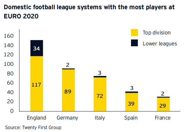 报告中同时提到,在2020欧洲杯中,各参赛国国家队成员,来自英超的最多,为117人,英冠贡献的国脚总数则为34人,在全欧次级别联赛中一骑绝尘。英冠这一数字甚至超过了法国整个联赛体系的国脚人数,并逼近了西班牙整个联赛体系的国脚人数。英冠联赛在全欧次级别联赛中,依然是领头羊的存在。