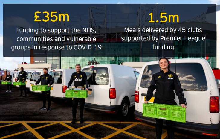 报告显示,在新冠疫情期间,英超联赛累计向英国卫生部门、社区和社会团体捐赠了约3500万英镑,提供了150万份膳食。在抗击疫情中,发挥了体育界的社会公益作用。