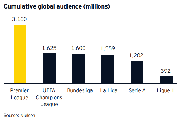 报告援引尼尔森的数据显示,英超全球累计收视人数达到了惊人的31.6亿,几乎两倍于欧冠的16.25亿,遥遥领先其他四大联赛(德甲16亿、西甲15.59亿、意甲12.02亿、法甲3.92亿)。