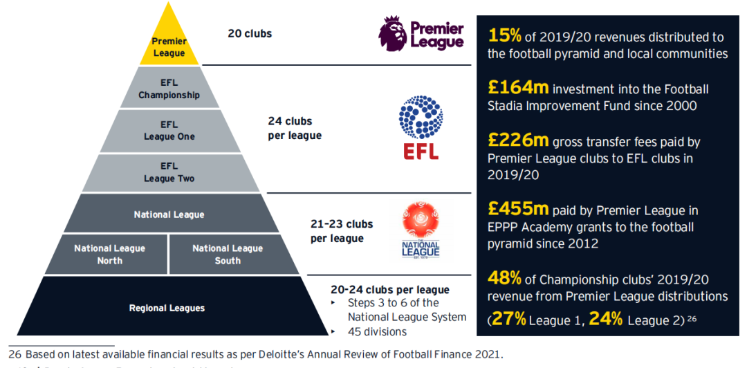 而根据英超一直以来,转播收入的一部分,会被用于扶持低级别联赛和草根足球。19/20赛季这一比例为15%左右。2012年以来,4.55亿英镑被用于扶持足球金字塔底层的国家联赛。