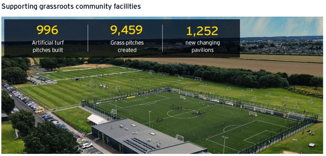 英超联赛在社区基础建设中,同样发挥着重要作用,累计投入3.84亿英镑到公共基金,参与了996个人造草皮球场、9459个塑胶草皮球场的建设。