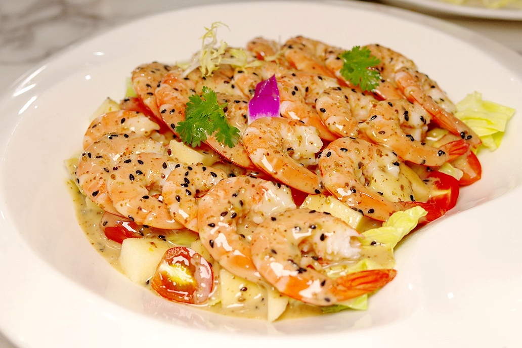 沙拉基围虾:相对于常见的白灼,这里的做法让人眼前一亮。剥壳垫了苹果和小番茄,淋芝麻沙拉酱,孩子们最高兴了,吃起来毫不费劲,一口一个比平时吃虾积极许多。