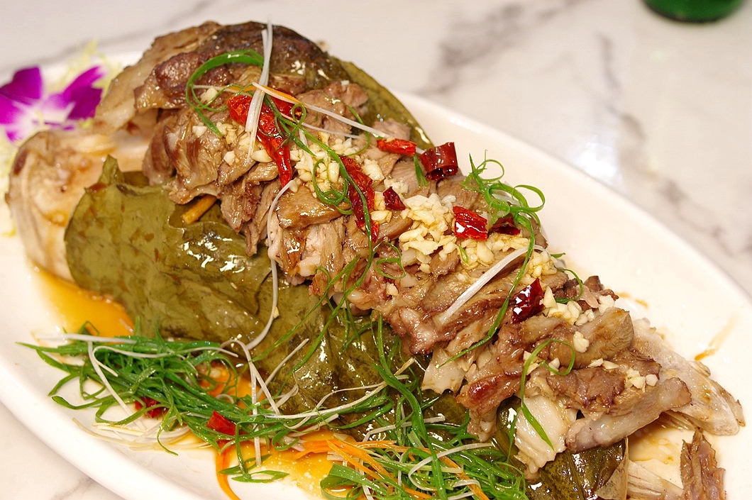 鸿运当头:猪头肉结缔组织丰富也就带来了多层次的咀嚼口感,可能脱骨后再包荷叶重新蒸过,所以吃起来一点不觉得腻。上菜的观感也很大气,对得起“鸿运当头”这个好听的名字。