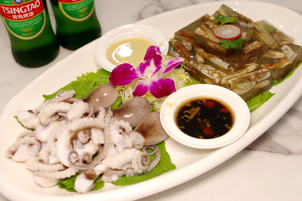 章鱼拼士笋冻:土笋冻,白灼章鱼,搭配传统土芥末和油醋汁,经典的闽南本土特色海鲜拼盘,招待外地朋友必点菜。那个土笋冻我可以留了一小块在碗里,过段时间后软化消融的程度让我确定应该比较地道。