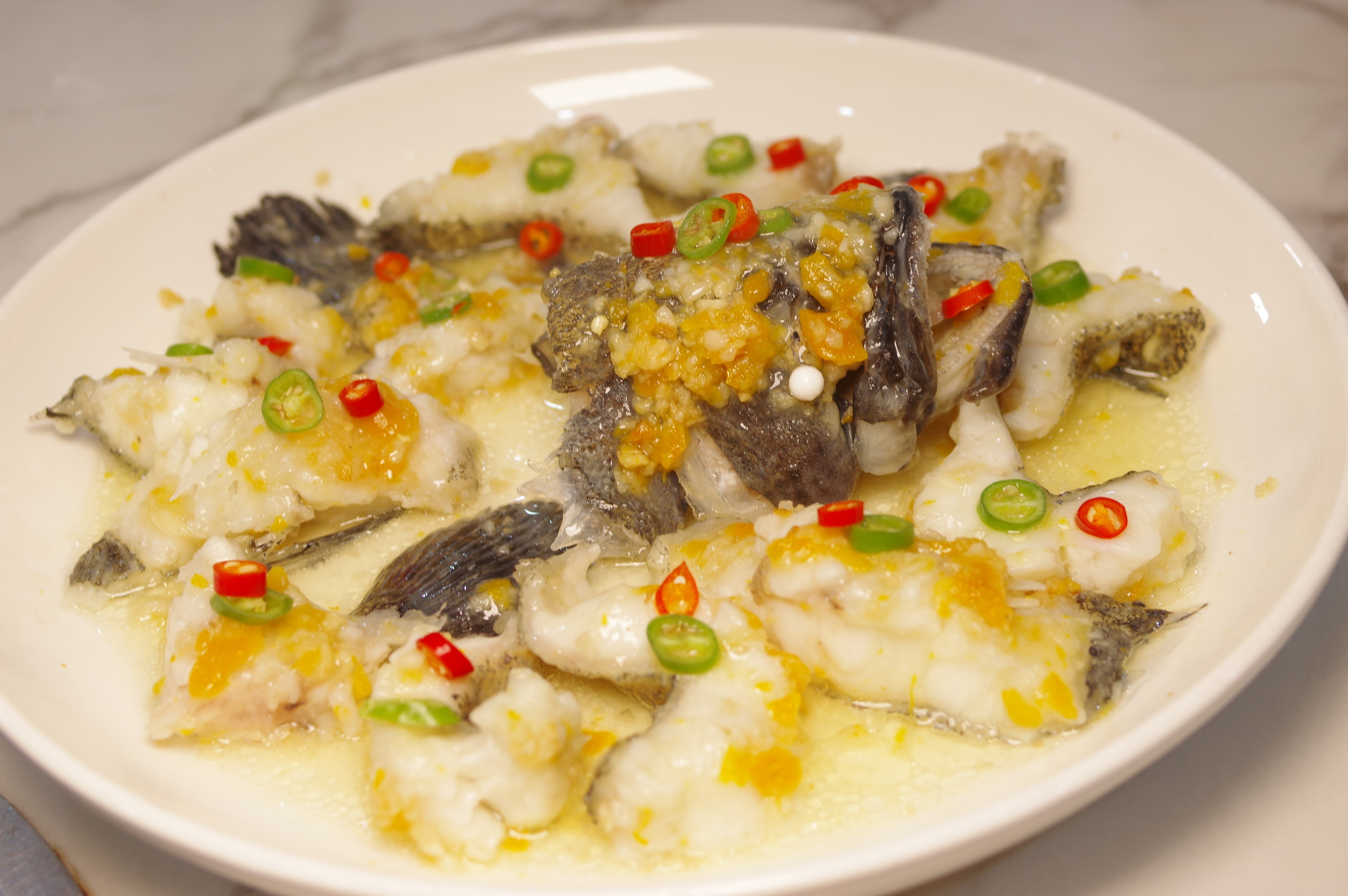 椒麻蒸老虎斑:口味和口感上都没问题,石斑鱼肉比较结实,解刀分块后再蒸容易确保口感一致,如果造型上再有所提升就更完美了。