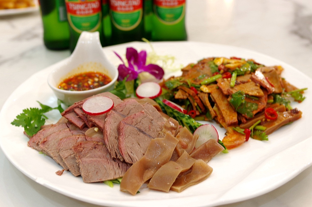 驴肉拼盘:五香和香辣口味的两款驴肉一浓一淡、香辣与咸鲜两种风味相互衬托,充分体现低脂肪驴肉质地细腻的特点。