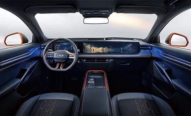 进入车内,2945mm轴距打造近5米(4920mm)黄金比例车身,让福特EVOS拥有近5.5平米的超豪华座舱空间及550L的后备箱容积,宽裕的腿部与头部空间可带来自由伸展的宽适驾乘体验。行业首创的12.3英寸高清仪表盘+27英寸超大真4K中控屏组成的1.1米超广域巨幅屏,可呈现导航、娱乐、路况模式等多种信息,满足各种信息与休闲娱乐需求。同时,也可让副驾分担驾驶任务,整屏、分屏切换,真正懂得每个人的感受,让驾驶员专注驾驶本身,让副驾更有参与感。