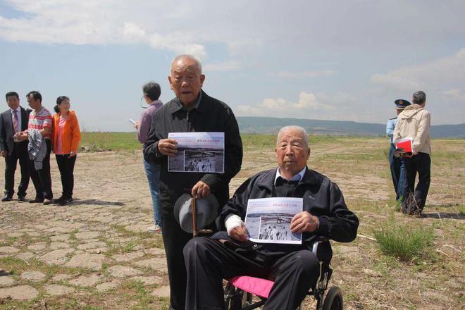 2016年6月,东北老航校飞行三期学员王天保、机械二期指导员胡溪涛寻访牡丹江东北老航校旧址,在老航校使用的跑道上留影 (摄/陈龙狮)