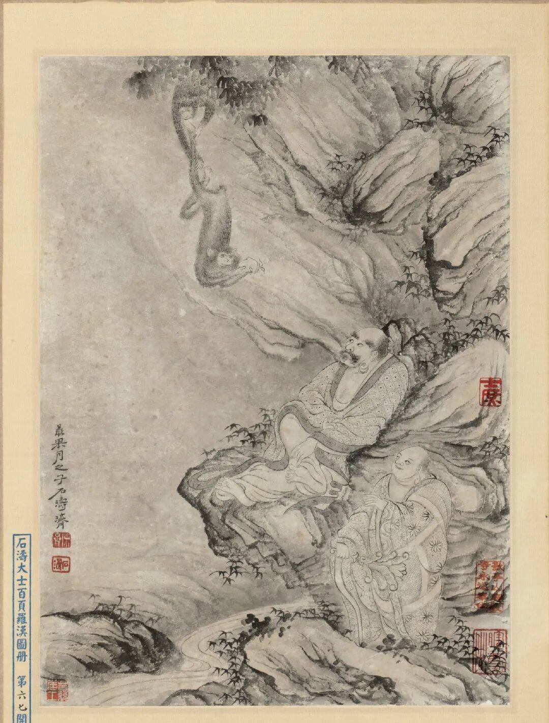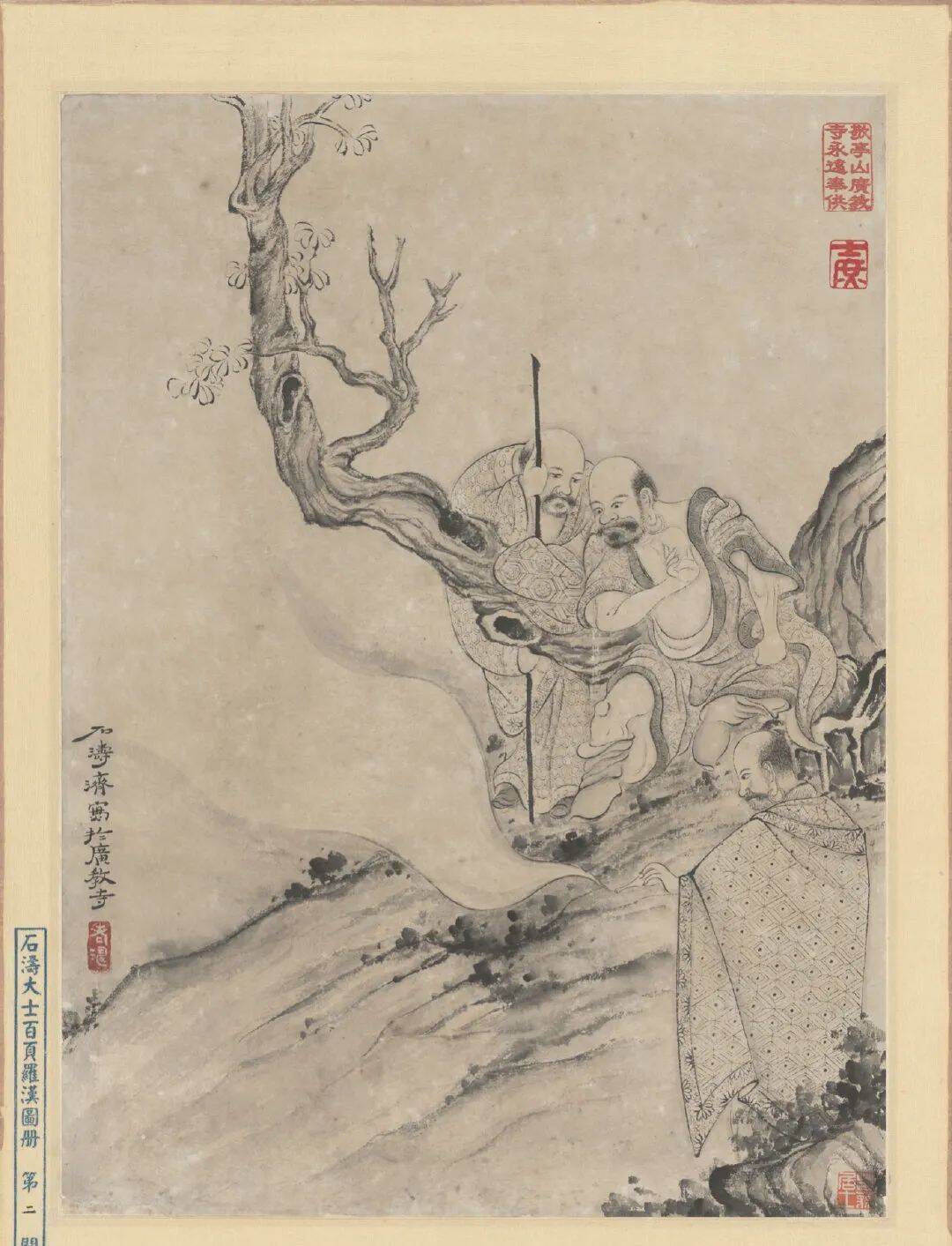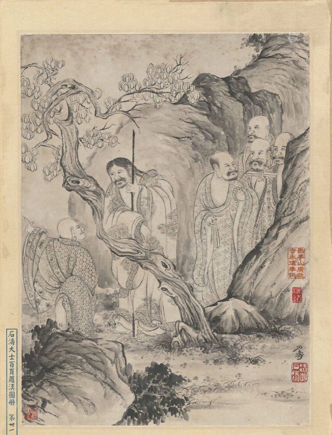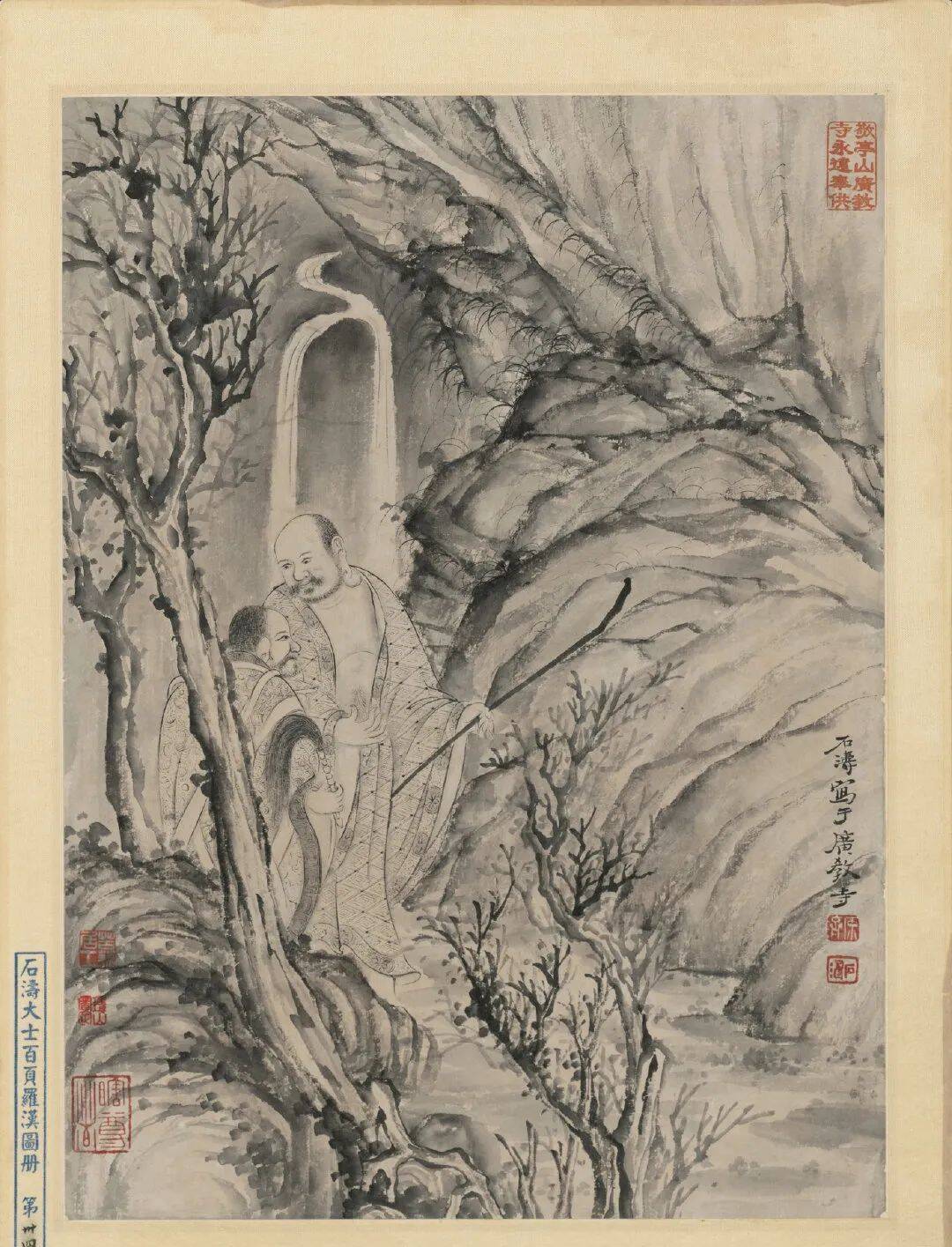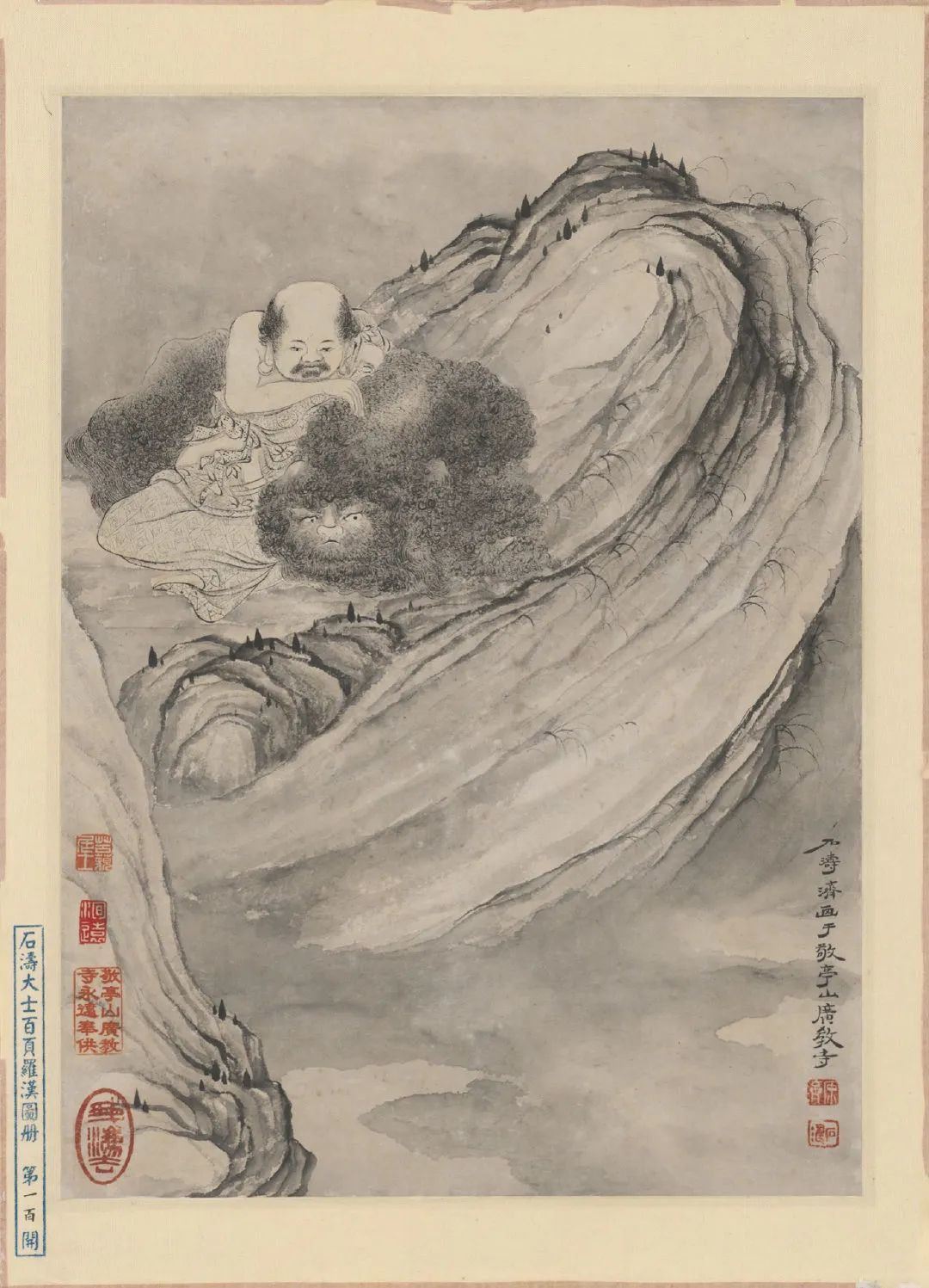 石涛《百开罗汉图册》是石涛青年时期绘制的工笔人物作品,为完整一百开册页,共画山水背景中的罗汉人物310位,各册页中罗汉左右分别陪饰众多人物及似龙、 虎、鹿、狮等神兽形象。根据石涛在画中自题,最早一开创作于“丁未” (1667 年),石涛时年26岁。整套册页作品分别作于1667年、1669年、1670年,1672年,即从石涛的26岁至31岁,历时6年之久,实为石涛倾力之作。