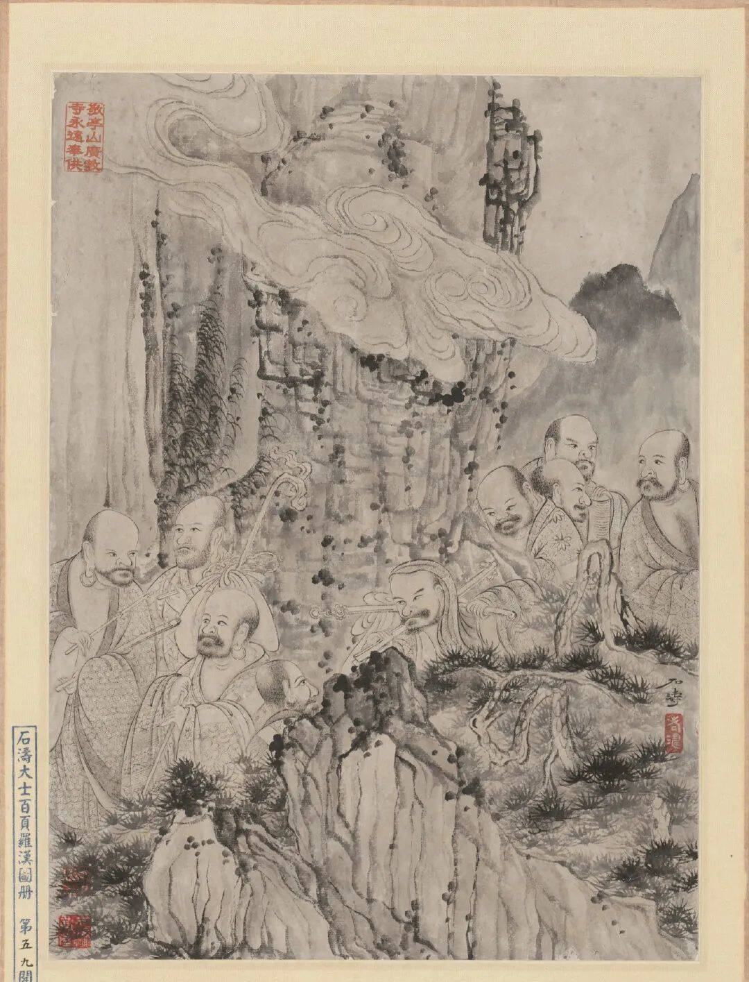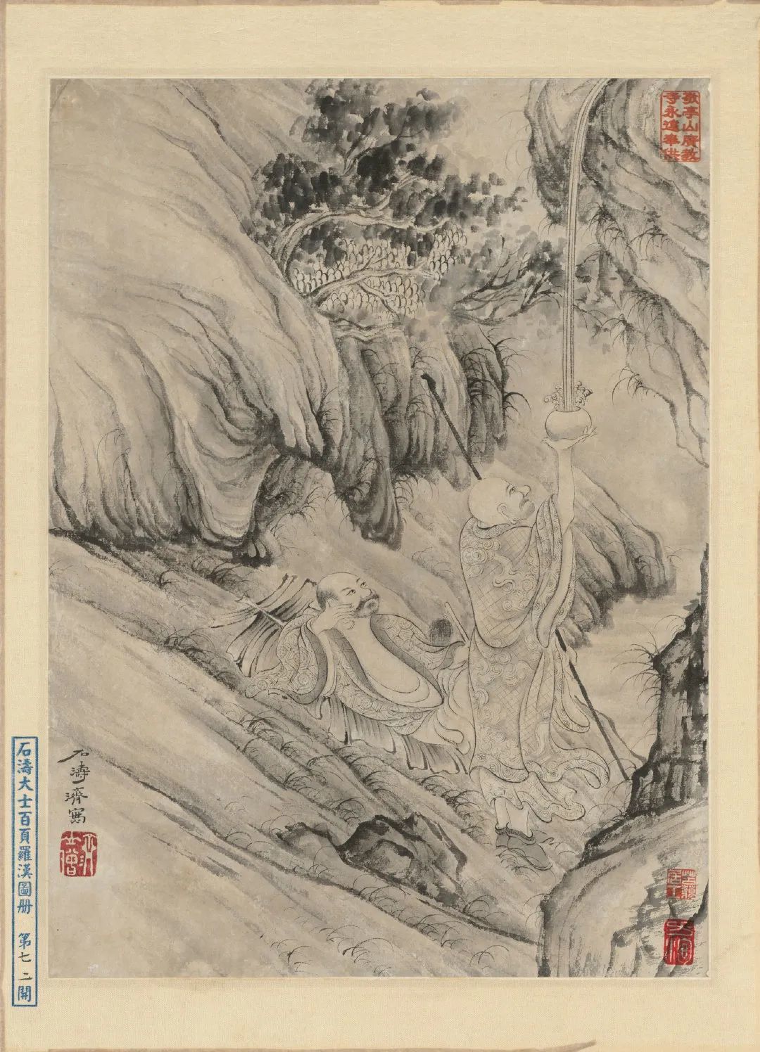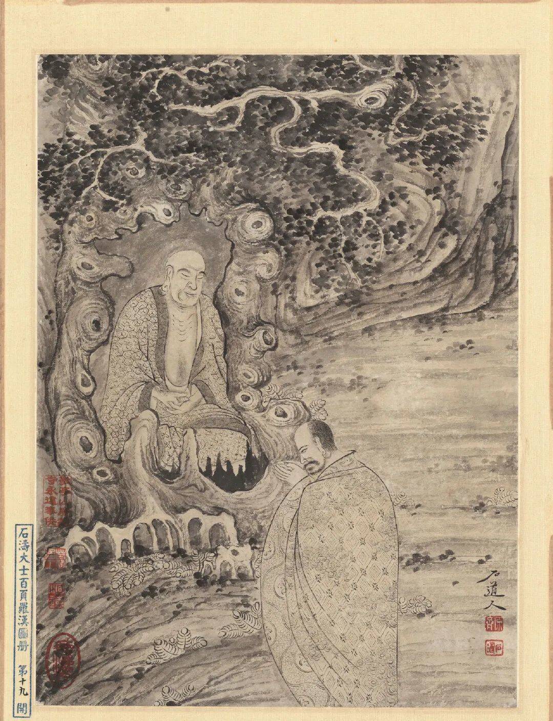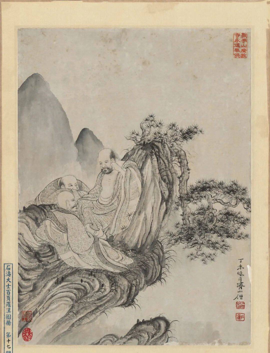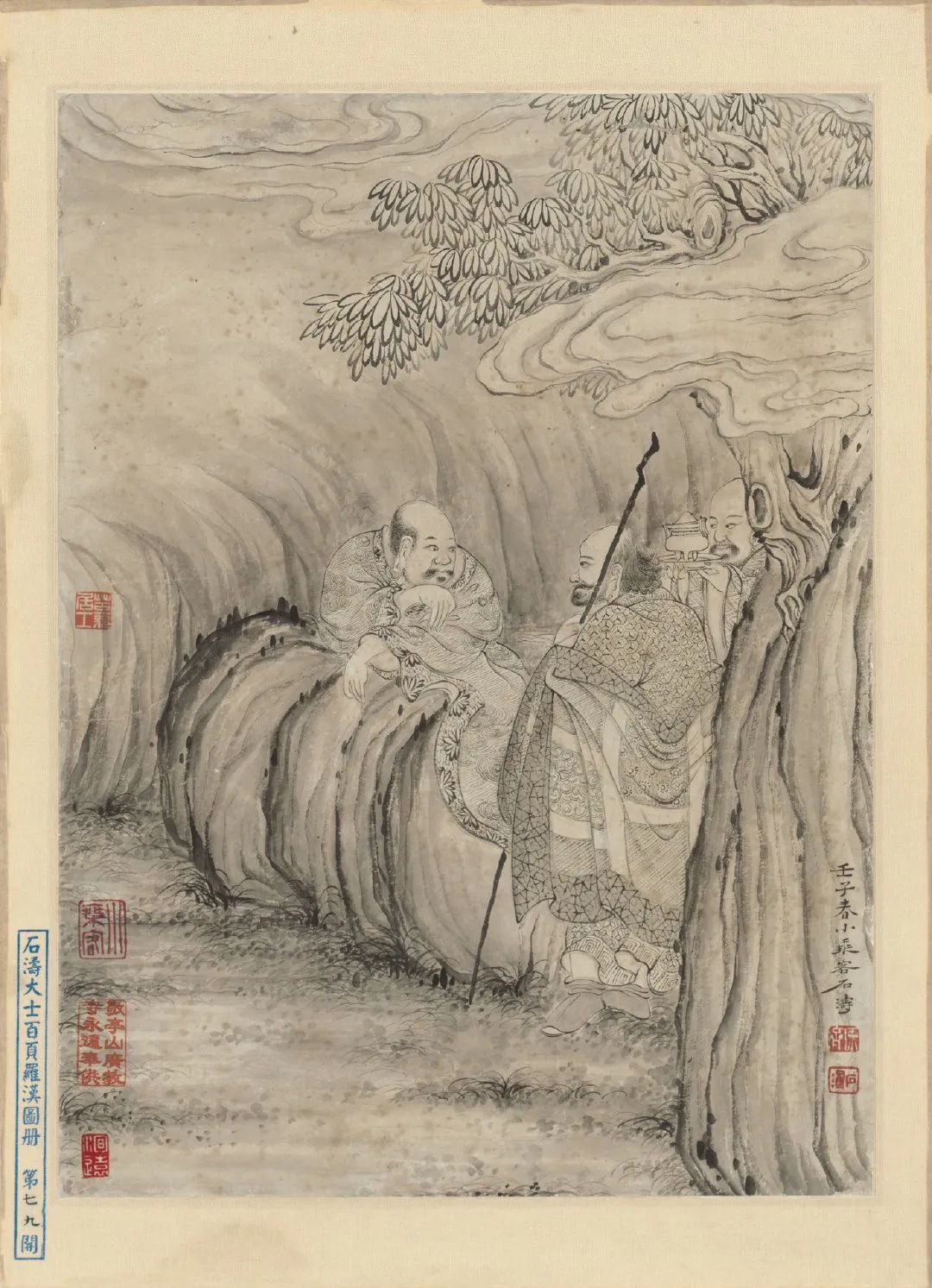 石涛《百开罗汉图册》是石涛青年时期绘制的工笔人物作品,为完整一百开册页,共画山水背景中的罗汉人物310位,各册页中罗汉左右分别陪饰众多人物及似龙、 虎、鹿、狮等神兽形象。根据石涛在画中自题,最早一开创作于“丁未” (1667 年),石涛时年26岁。整套册页作品分别作于1667年、1669年、1670年,1672年,即从石涛的26岁至31岁,历时6年之久,实为石涛倾力之作。