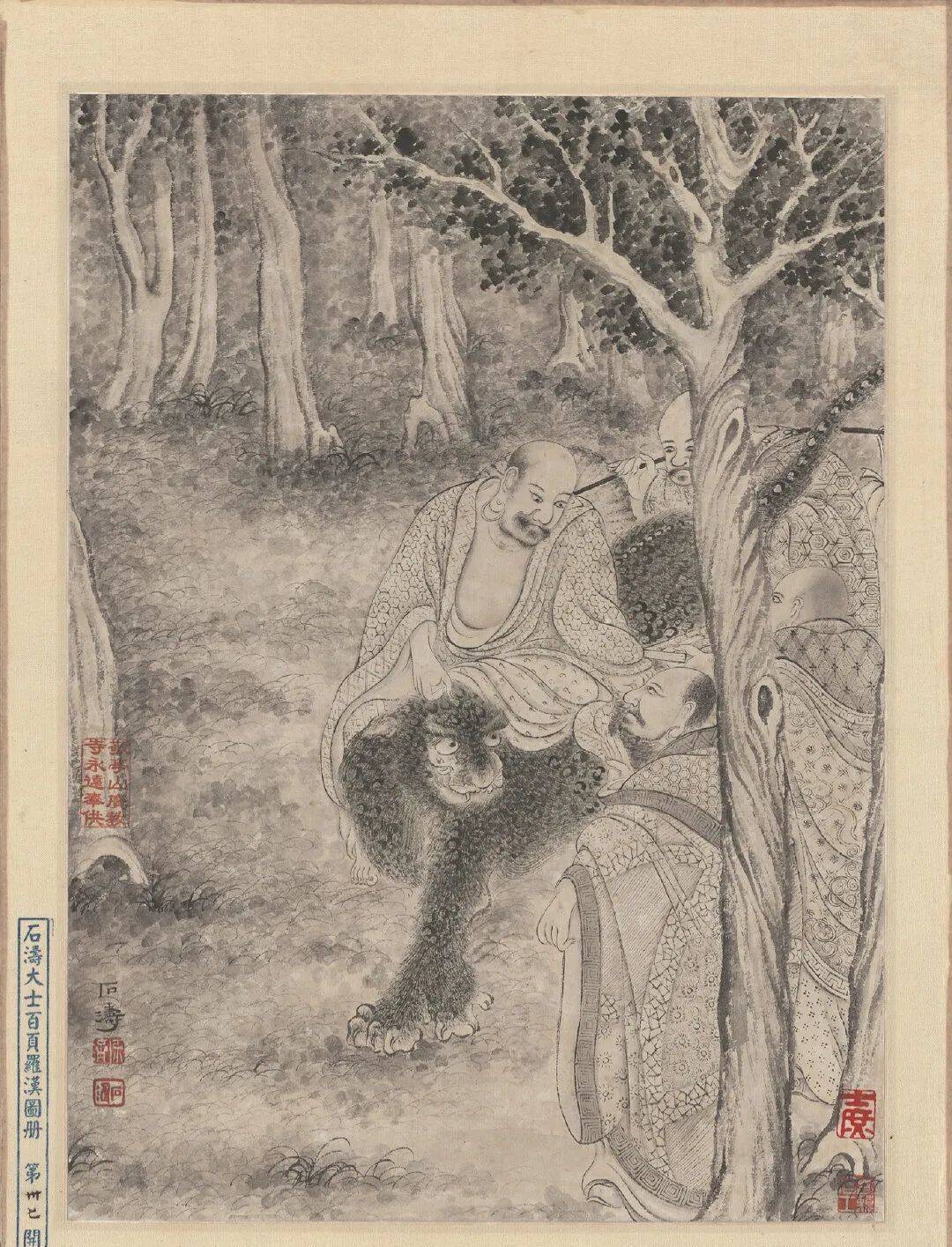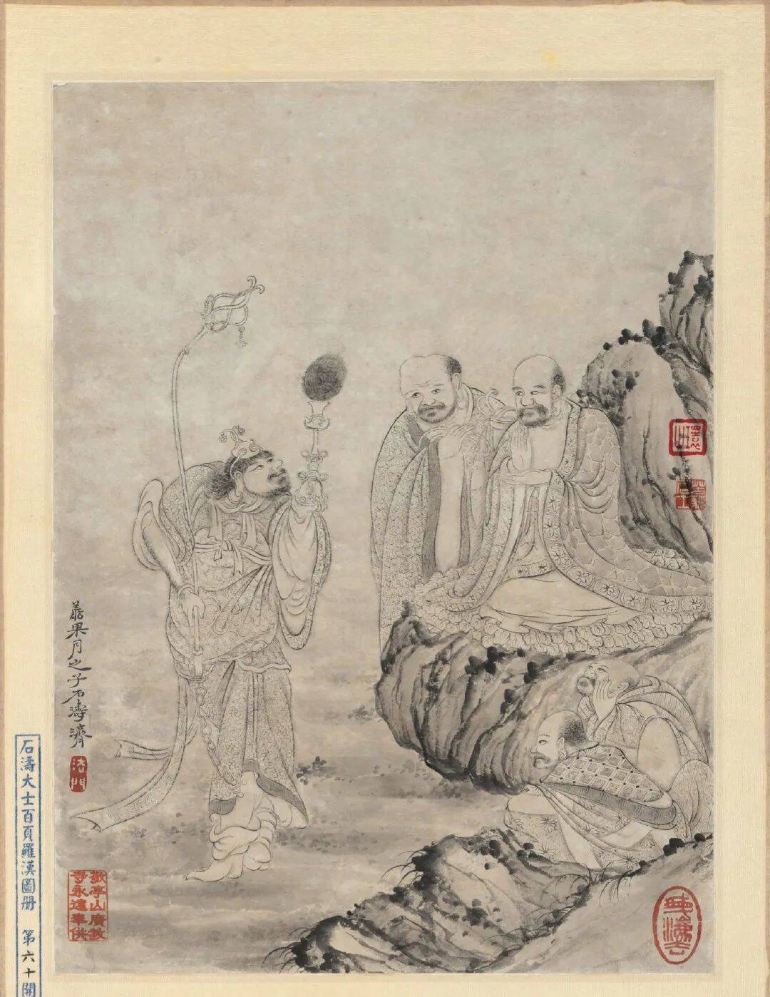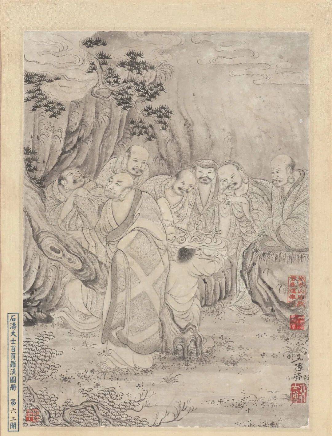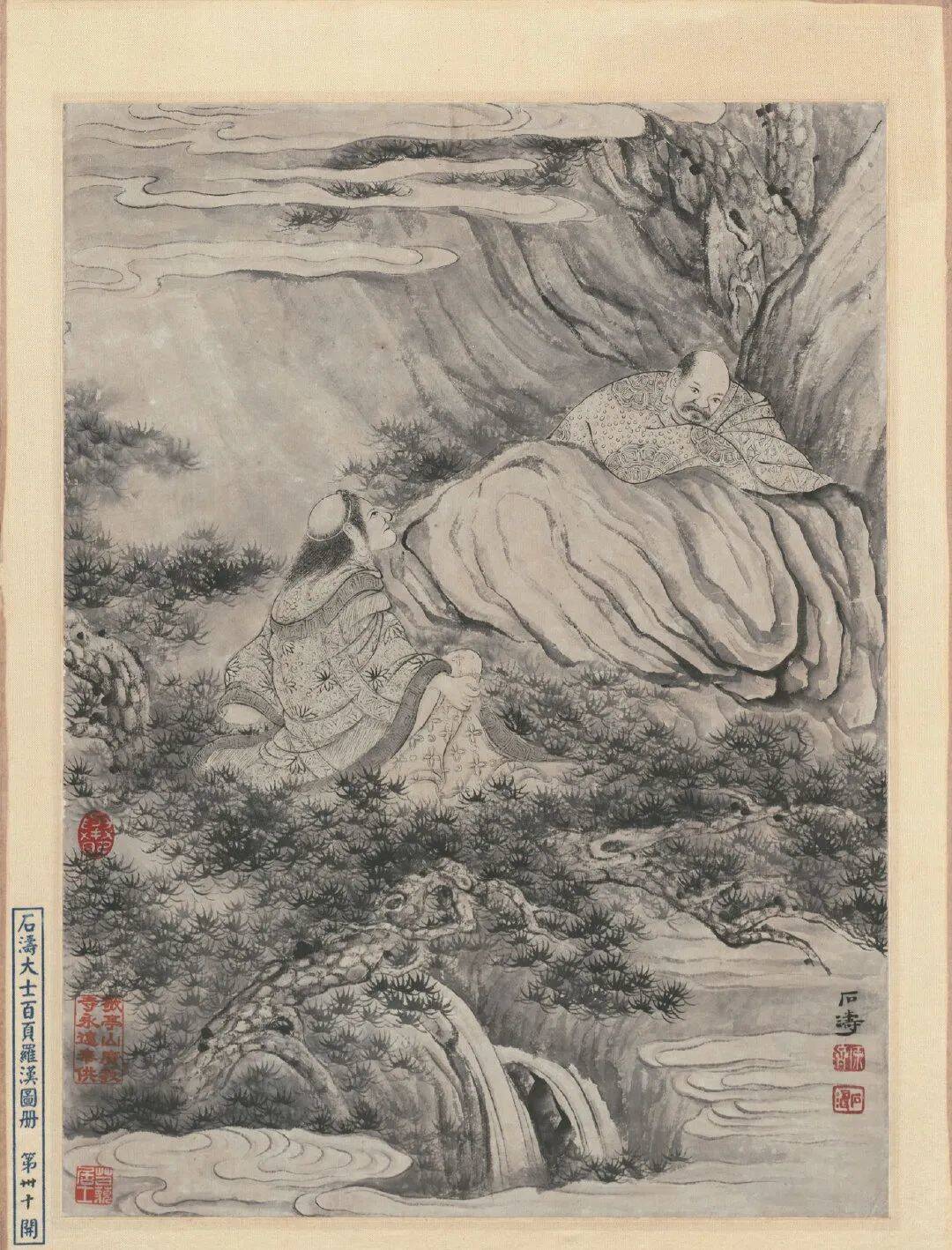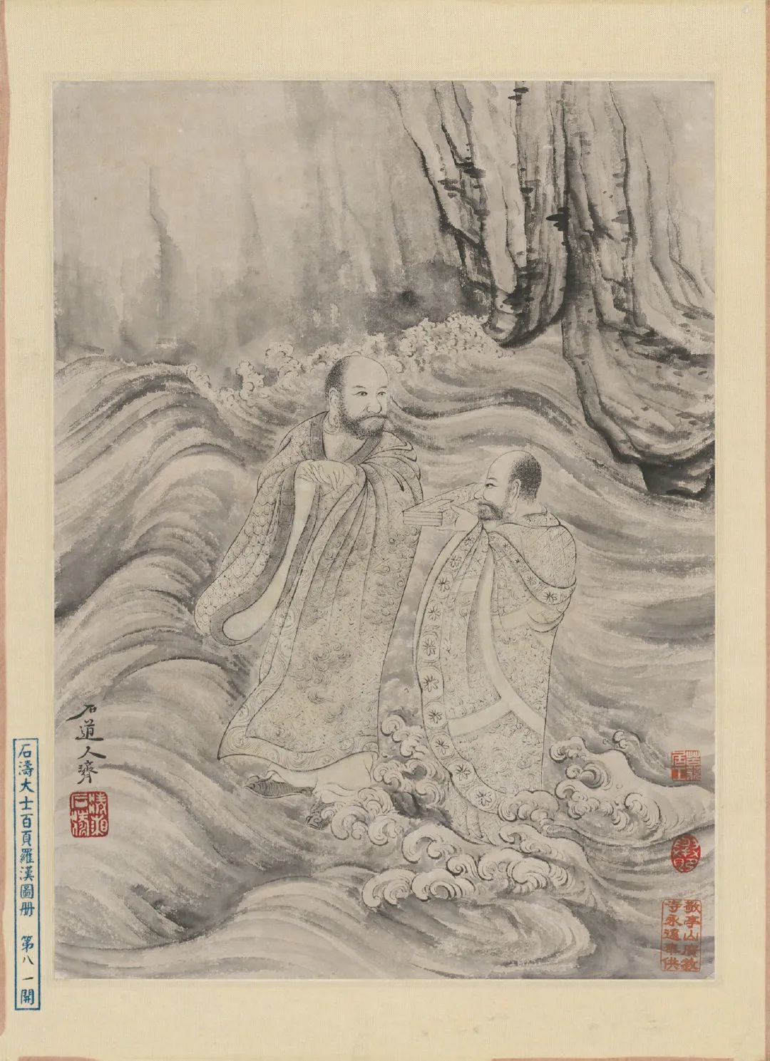 石涛《百开罗汉图册》是石涛青年时期绘制的工笔人物作品,为完整一百开册页,共画山水背景中的罗汉人物310位,各册页中罗汉左右分别陪饰众多人物及似龙、 虎、鹿、狮等神兽形象。根据石涛在画中自题,最早一开创作于“丁未” (1667 年),石涛时年26岁。整套册页作品分别作于1667年、1669年、1670年,1672年,即从石涛的26岁至31岁,历时6年之久,实为石涛倾力之作。