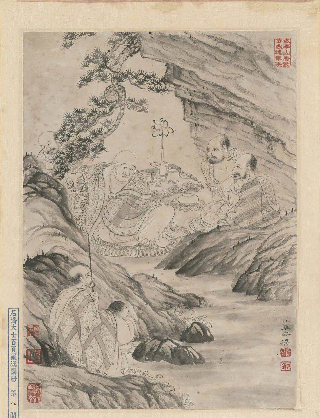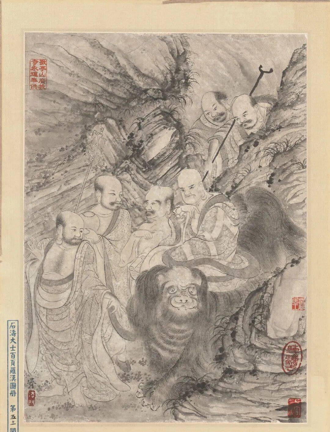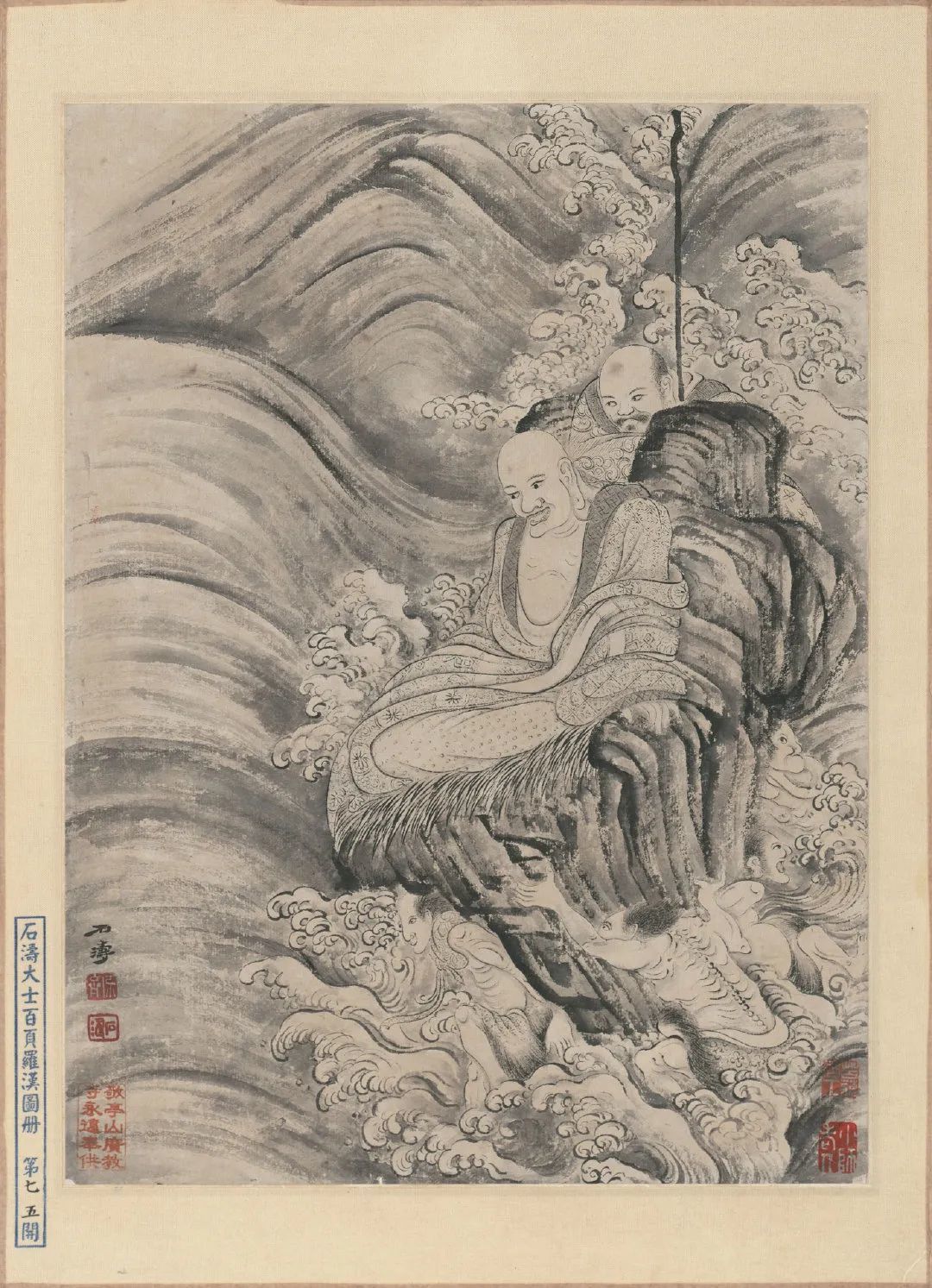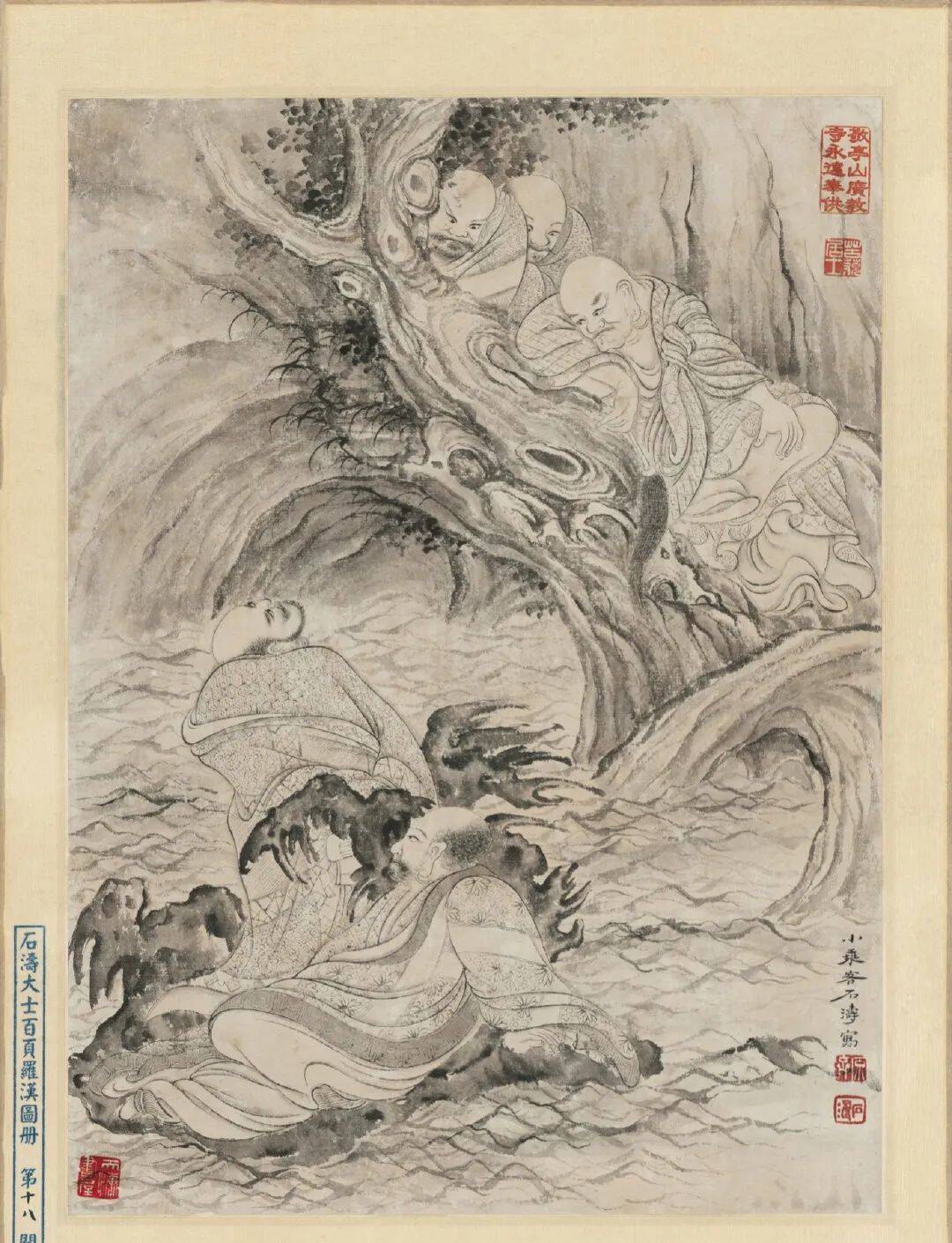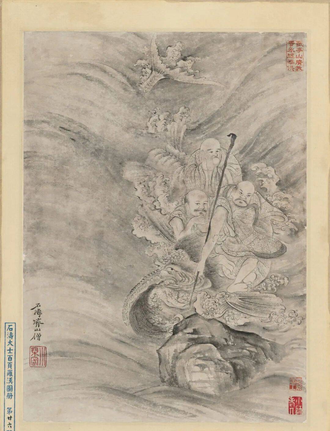 石涛《百开罗汉图册》是石涛青年时期绘制的工笔人物作品,为完整一百开册页,共画山水背景中的罗汉人物310位,各册页中罗汉左右分别陪饰众多人物及似龙、 虎、鹿、狮等神兽形象。根据石涛在画中自题,最早一开创作于“丁未” (1667 年),石涛时年26岁。整套册页作品分别作于1667年、1669年、1670年,1672年,即从石涛的26岁至31岁,历时6年之久,实为石涛倾力之作。
