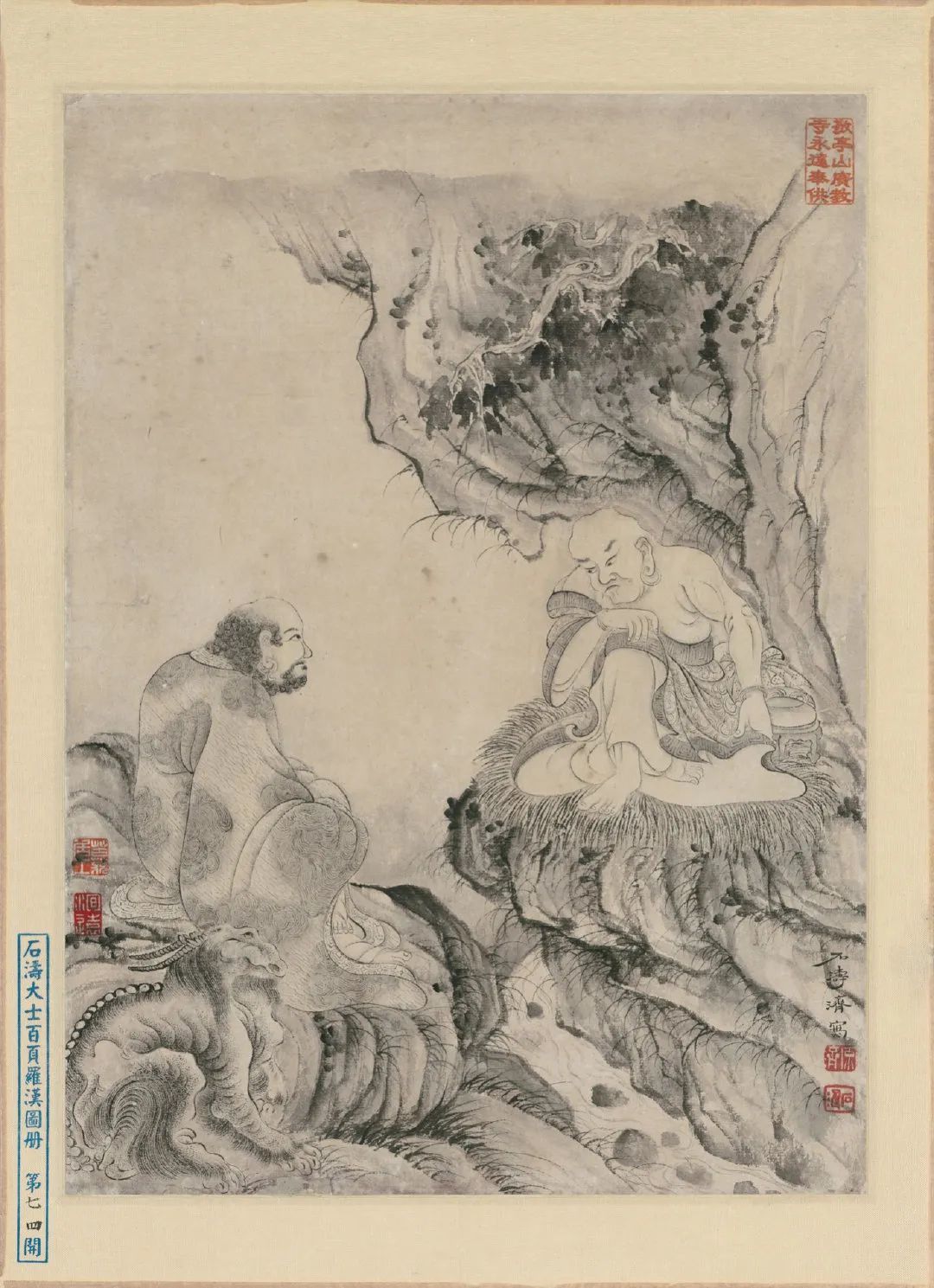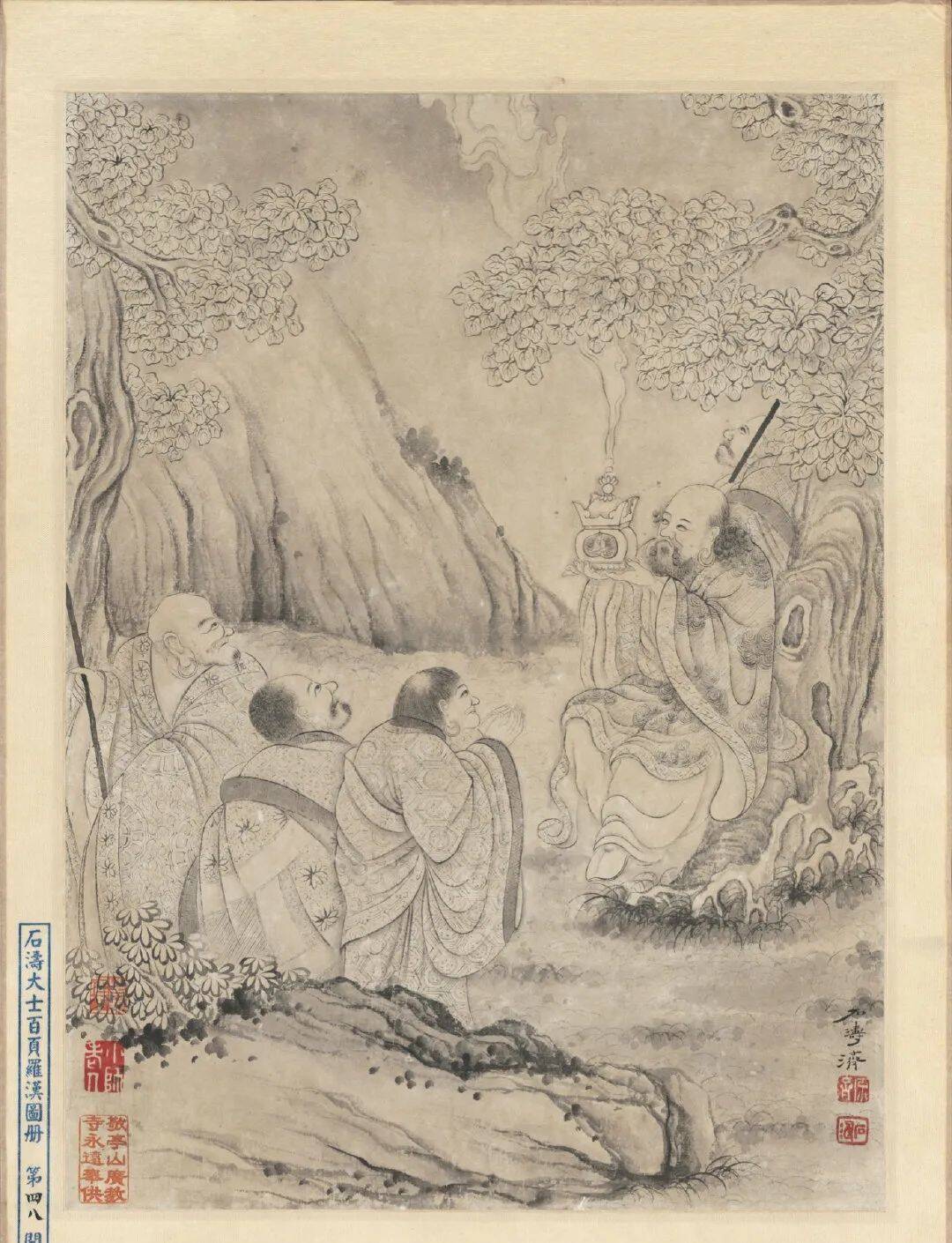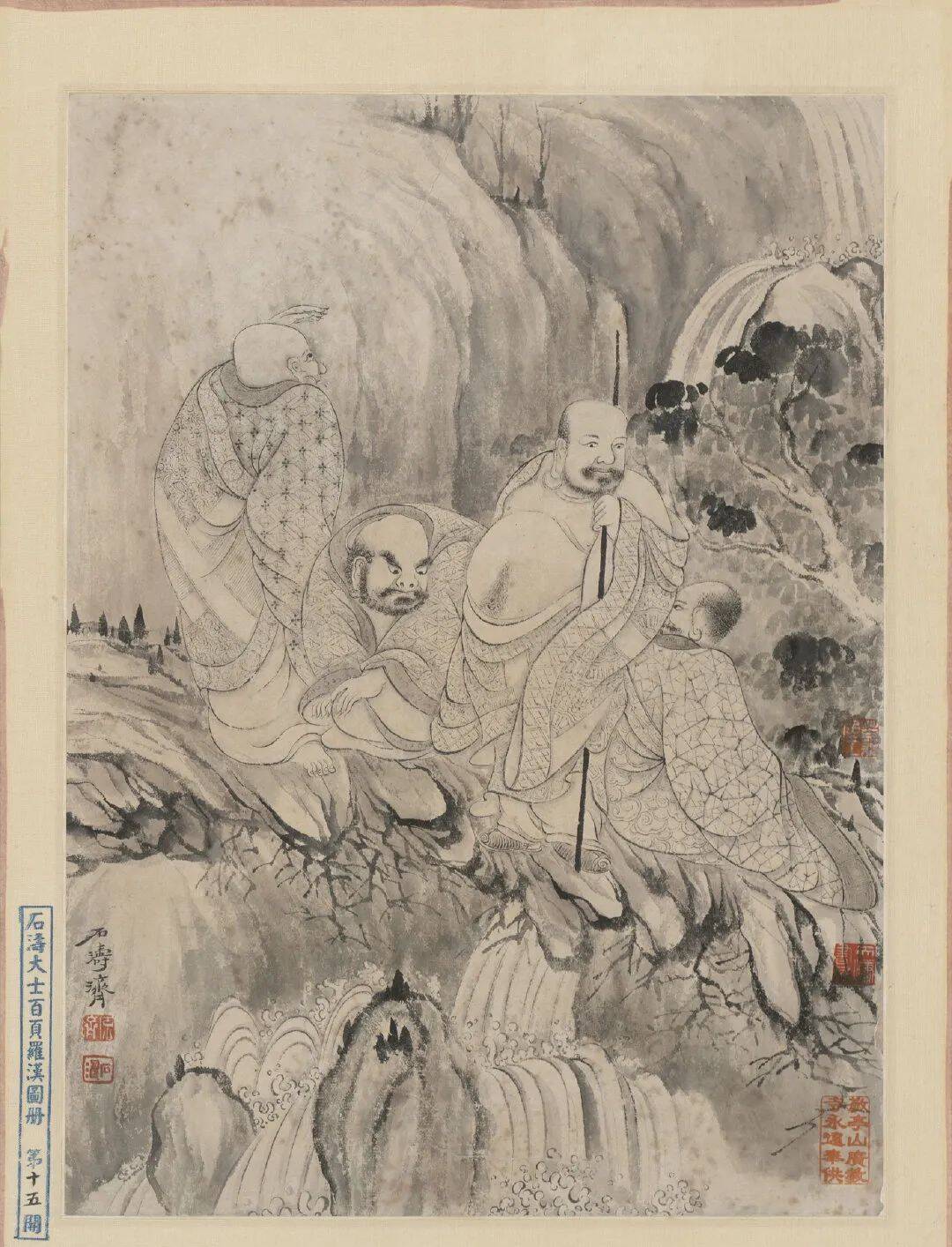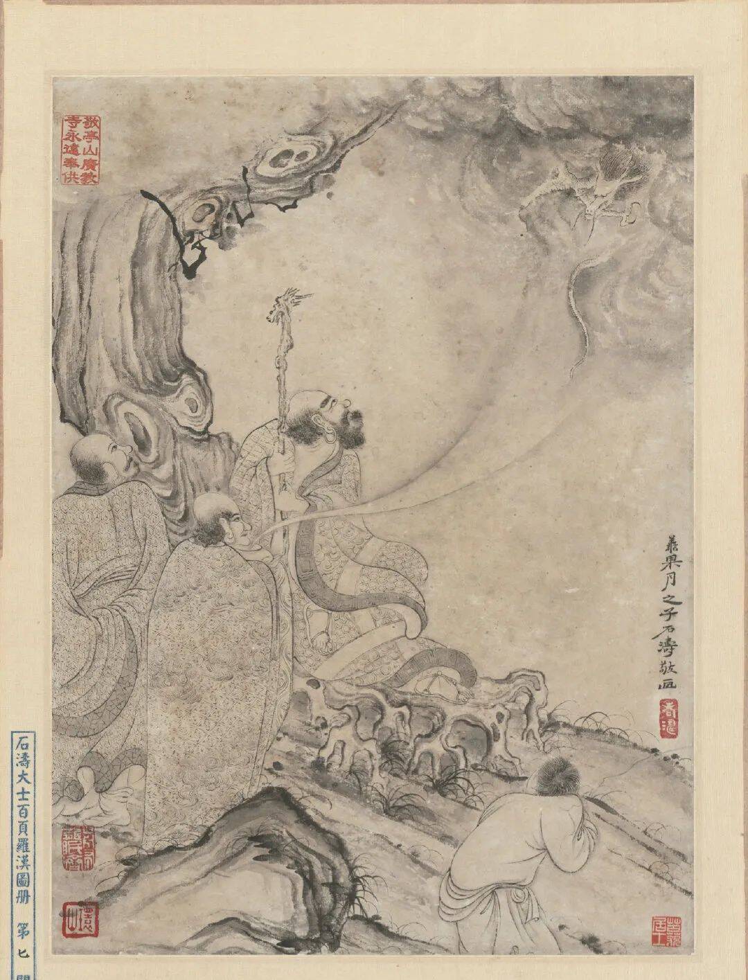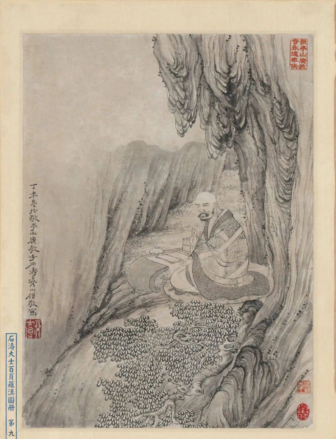 石涛《百开罗汉图册》是石涛青年时期绘制的工笔人物作品,为完整一百开册页,共画山水背景中的罗汉人物310位,各册页中罗汉左右分别陪饰众多人物及似龙、 虎、鹿、狮等神兽形象。根据石涛在画中自题,最早一开创作于“丁未” (1667 年),石涛时年26岁。整套册页作品分别作于1667年、1669年、1670年,1672年,即从石涛的26岁至31岁,历时6年之久,实为石涛倾力之作。