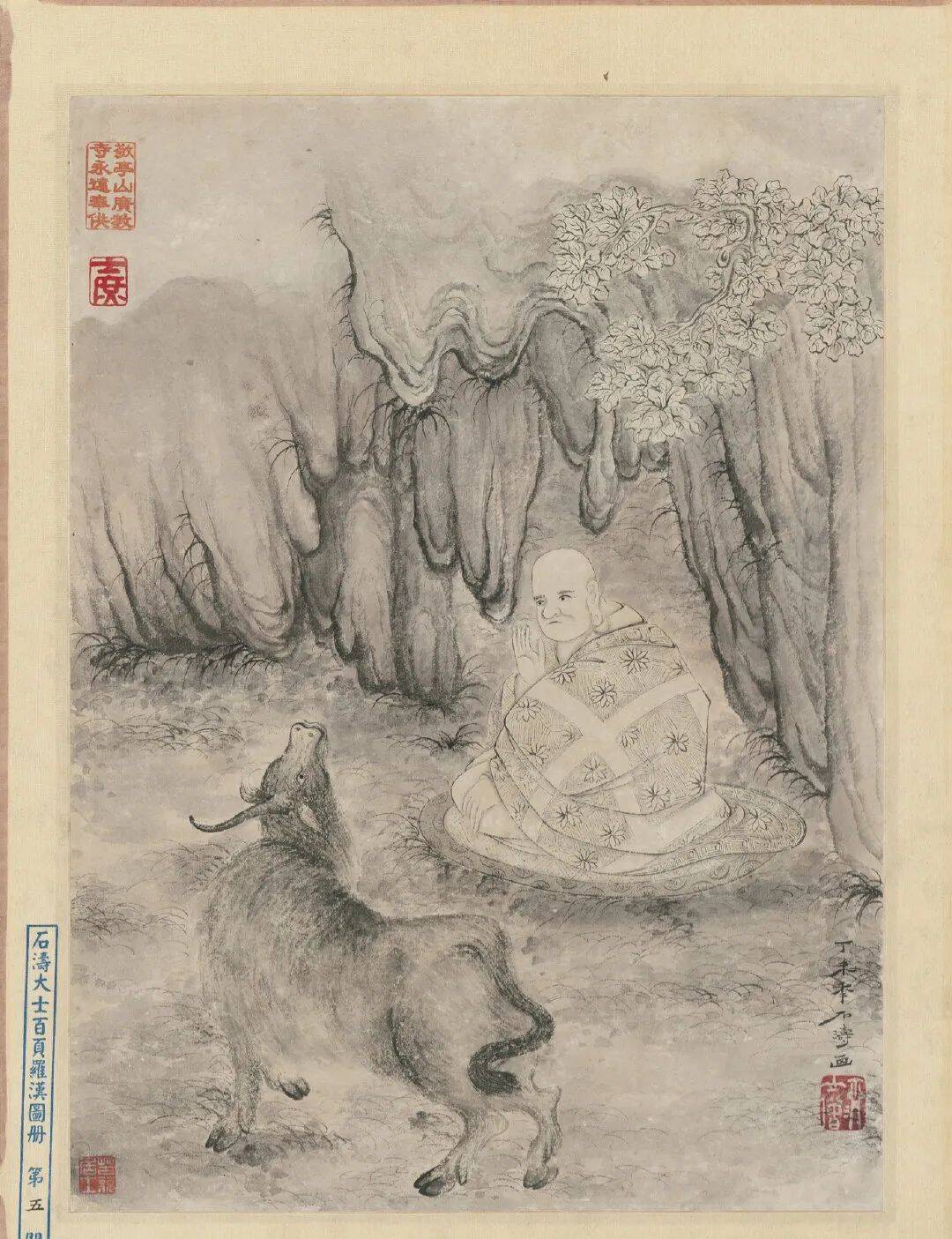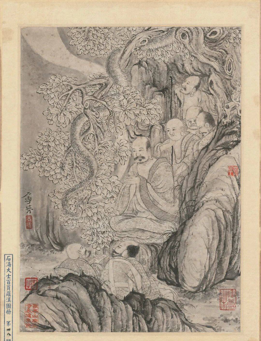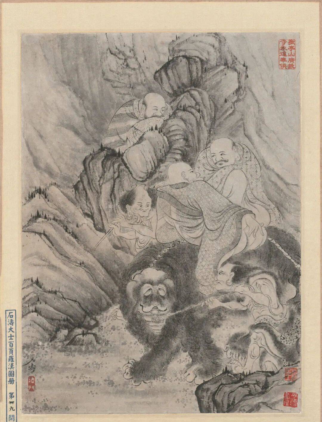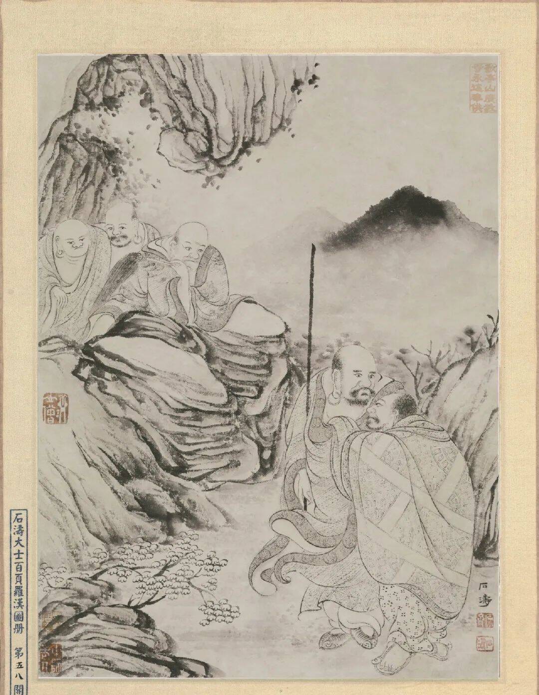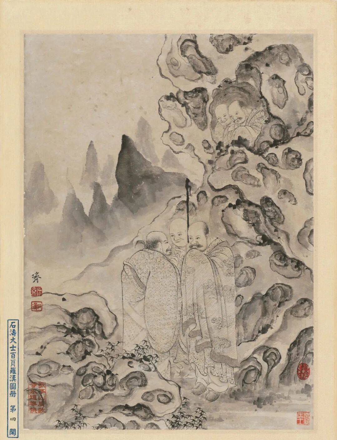 石涛《百开罗汉图册》是石涛青年时期绘制的工笔人物作品,为完整一百开册页,共画山水背景中的罗汉人物310位,各册页中罗汉左右分别陪饰众多人物及似龙、 虎、鹿、狮等神兽形象。根据石涛在画中自题,最早一开创作于“丁未” (1667 年),石涛时年26岁。整套册页作品分别作于1667年、1669年、1670年,1672年,即从石涛的26岁至31岁,历时6年之久,实为石涛倾力之作。
