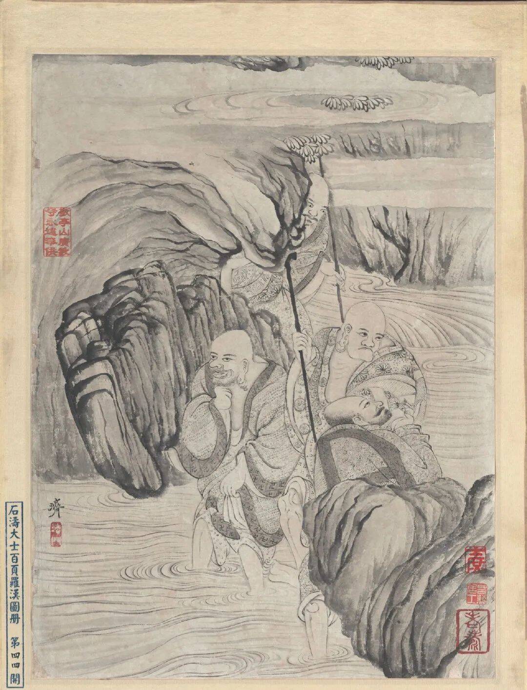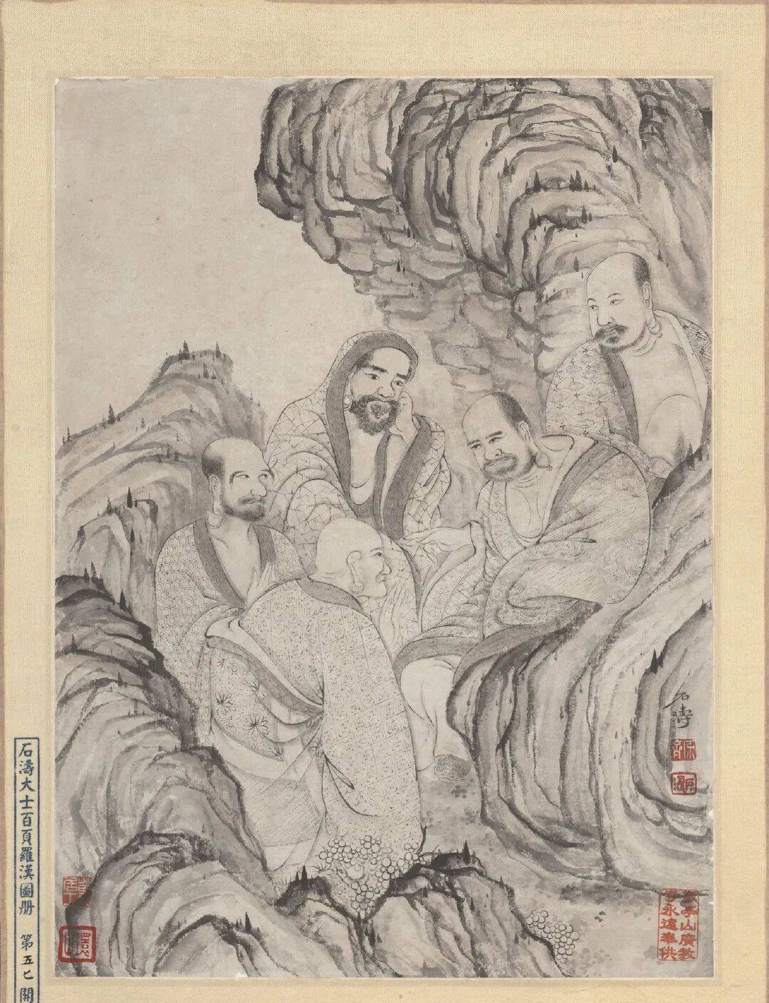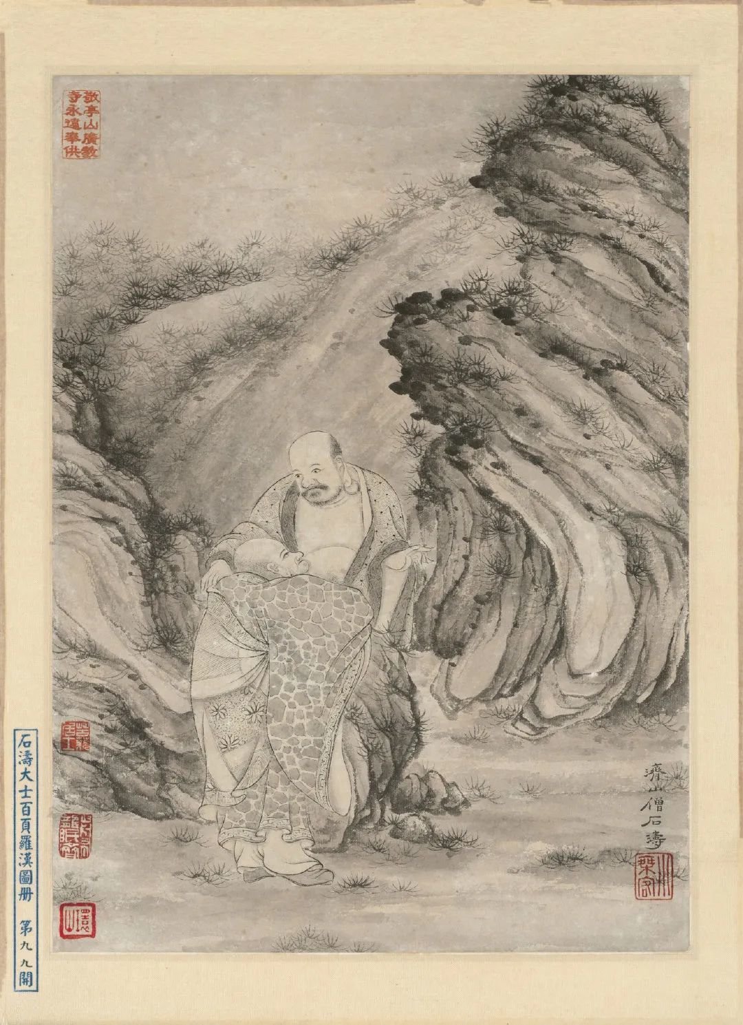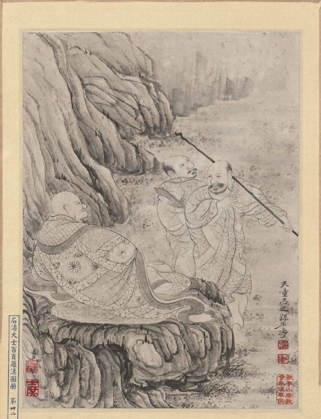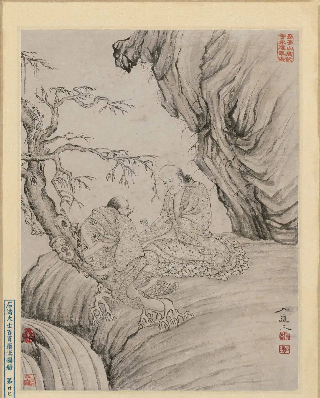 石涛《百开罗汉图册》是石涛青年时期绘制的工笔人物作品,为完整一百开册页,共画山水背景中的罗汉人物310位,各册页中罗汉左右分别陪饰众多人物及似龙、 虎、鹿、狮等神兽形象。根据石涛在画中自题,最早一开创作于“丁未” (1667 年),石涛时年26岁。整套册页作品分别作于1667年、1669年、1670年,1672年,即从石涛的26岁至31岁,历时6年之久,实为石涛倾力之作。