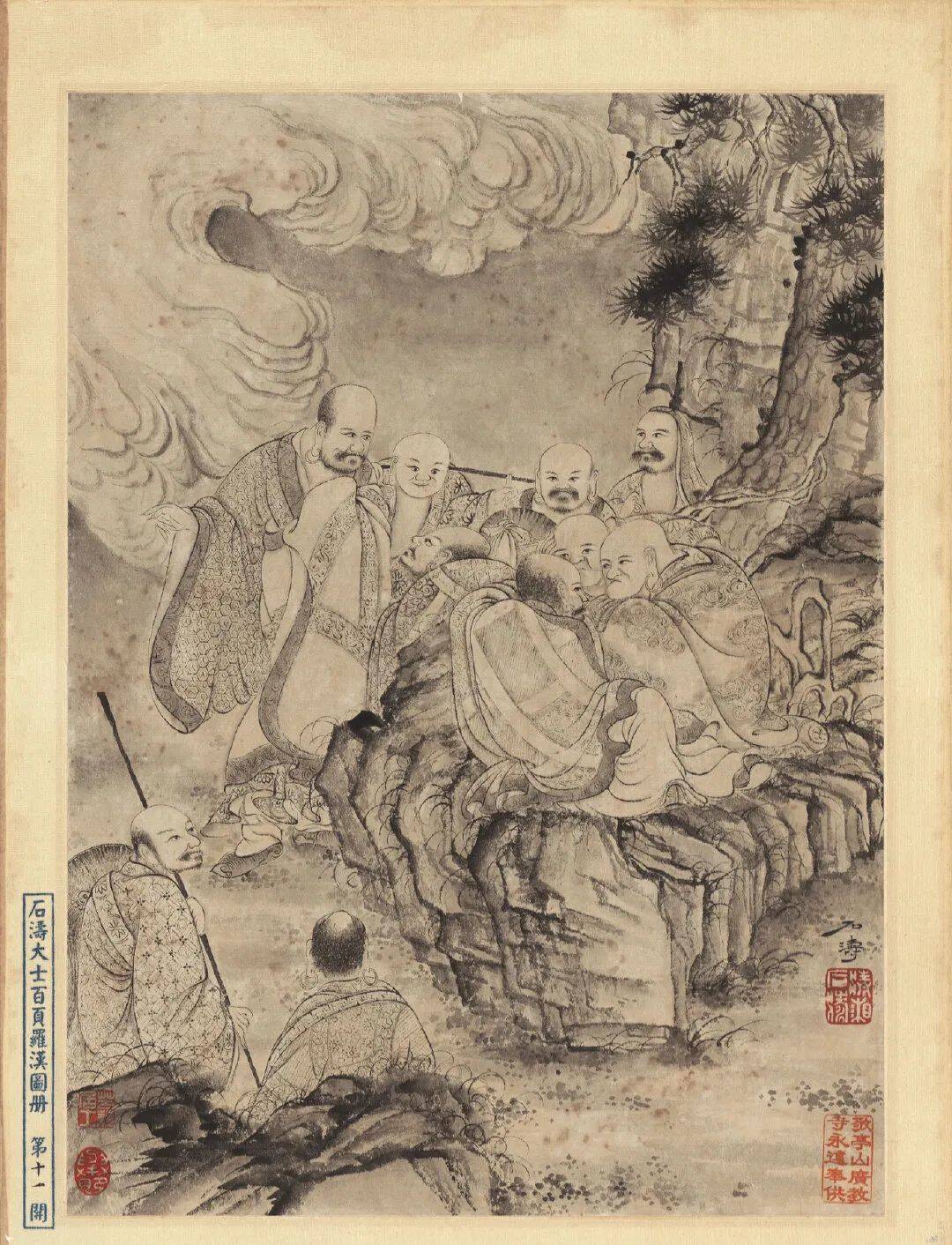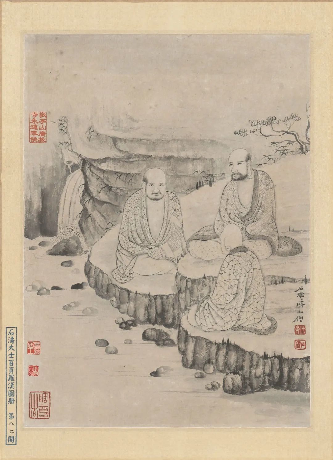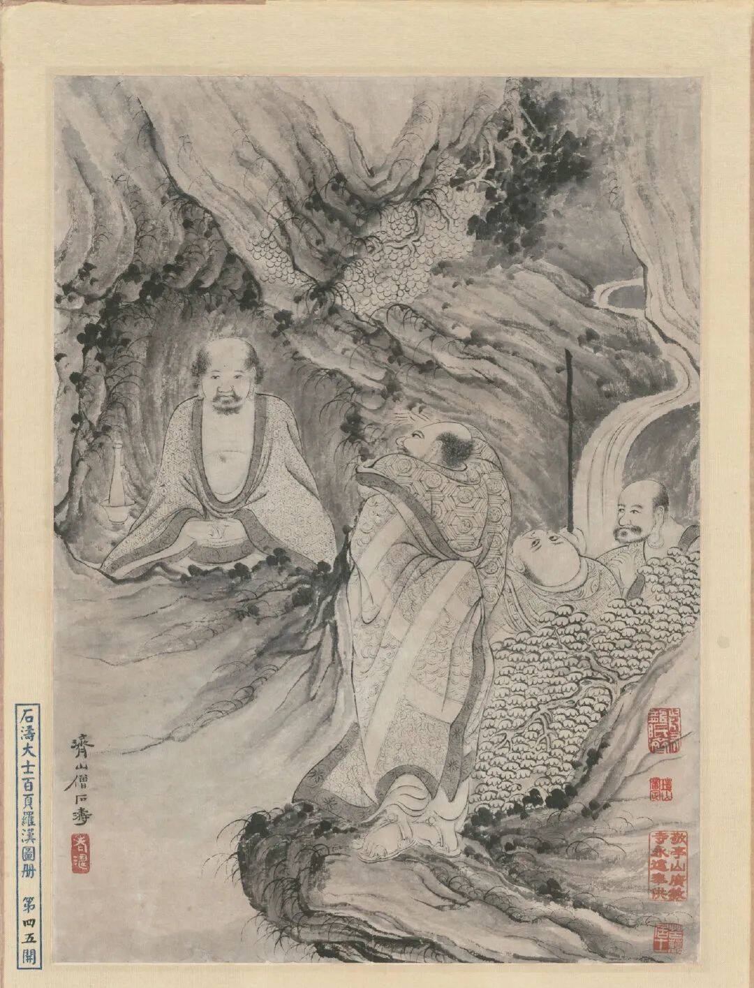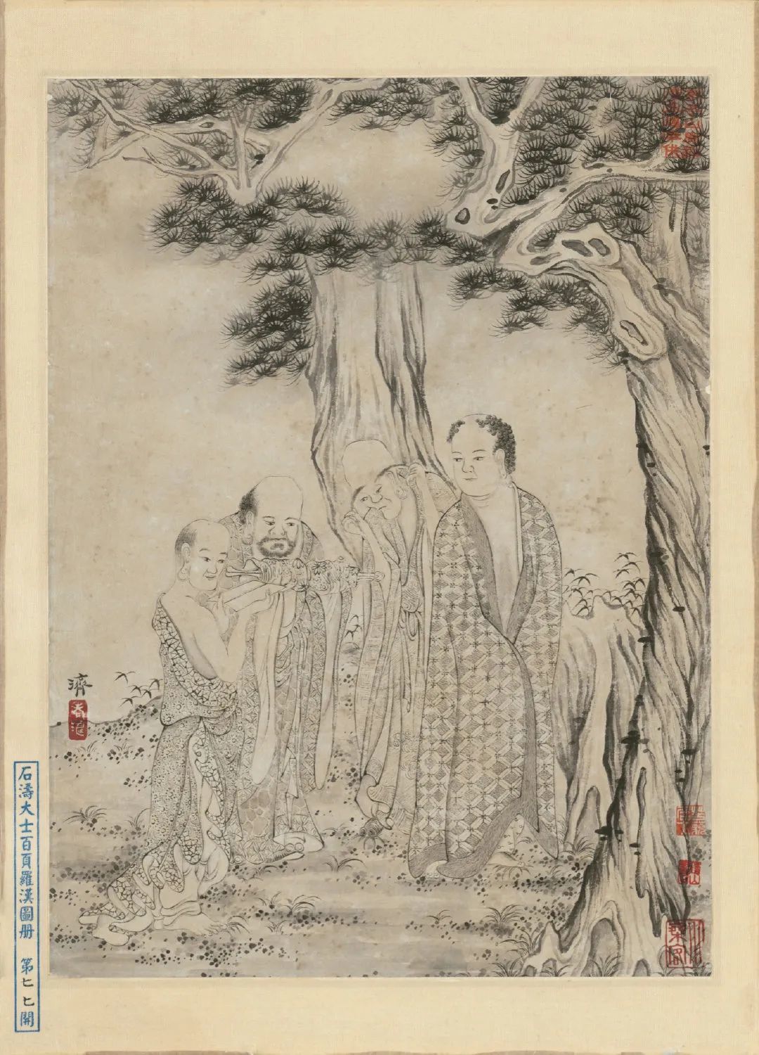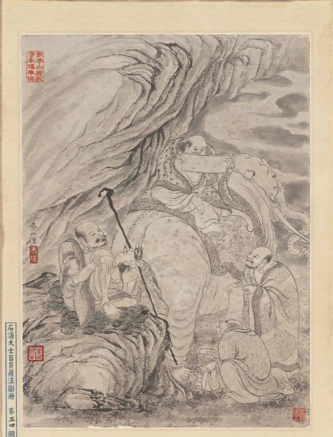石涛《百开罗汉图册》是石涛青年时期绘制的工笔人物作品,为完整一百开册页,共画山水背景中的罗汉人物310位,各册页中罗汉左右分别陪饰众多人物及似龙、 虎、鹿、狮等神兽形象。根据石涛在画中自题,最早一开创作于“丁未” (1667 年),石涛时年26岁。整套册页作品分别作于1667年、1669年、1670年,1672年,即从石涛的26岁至31岁,历时6年之久,实为石涛倾力之作。