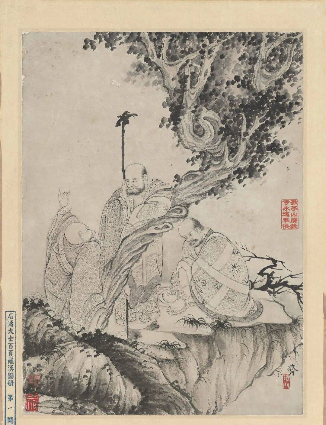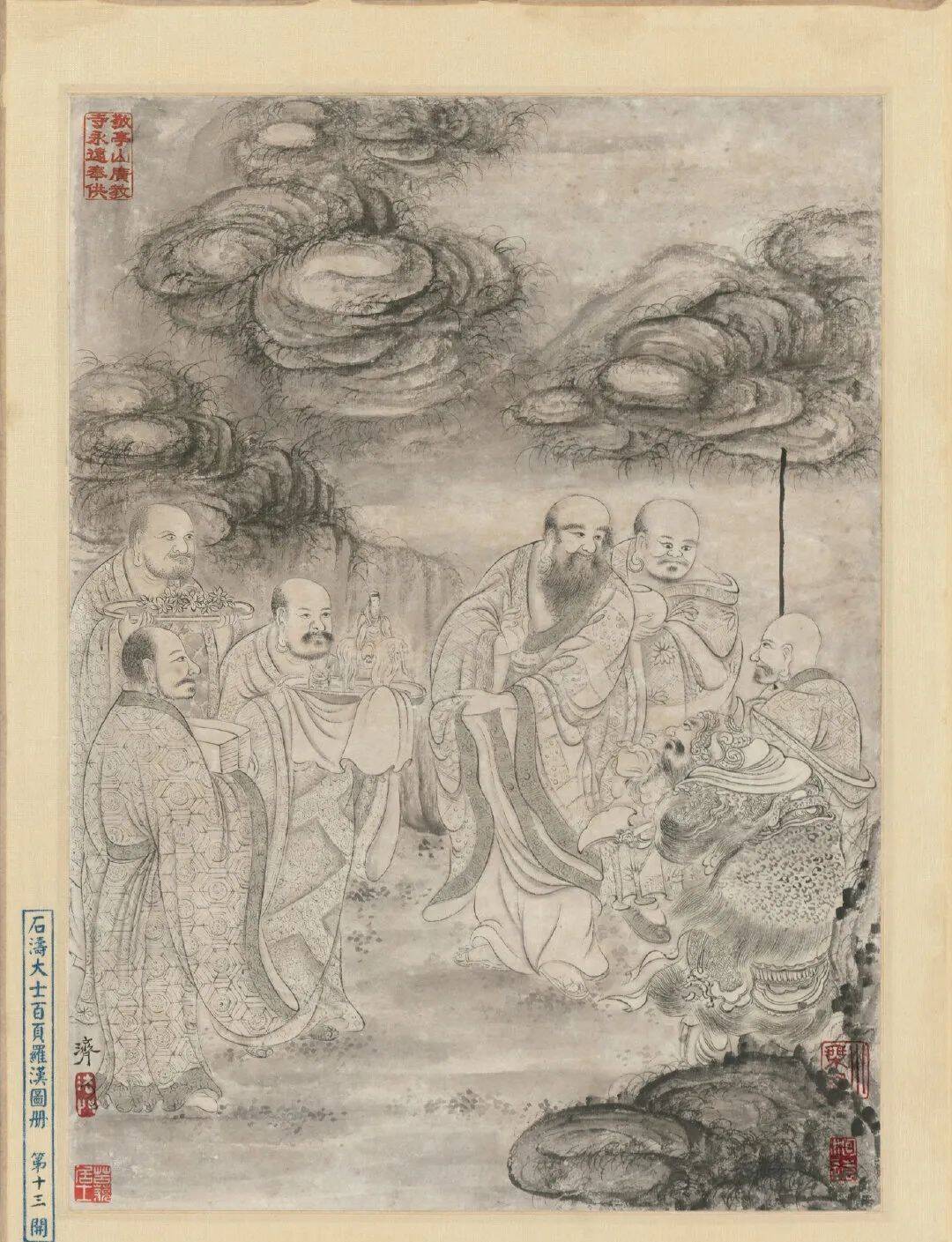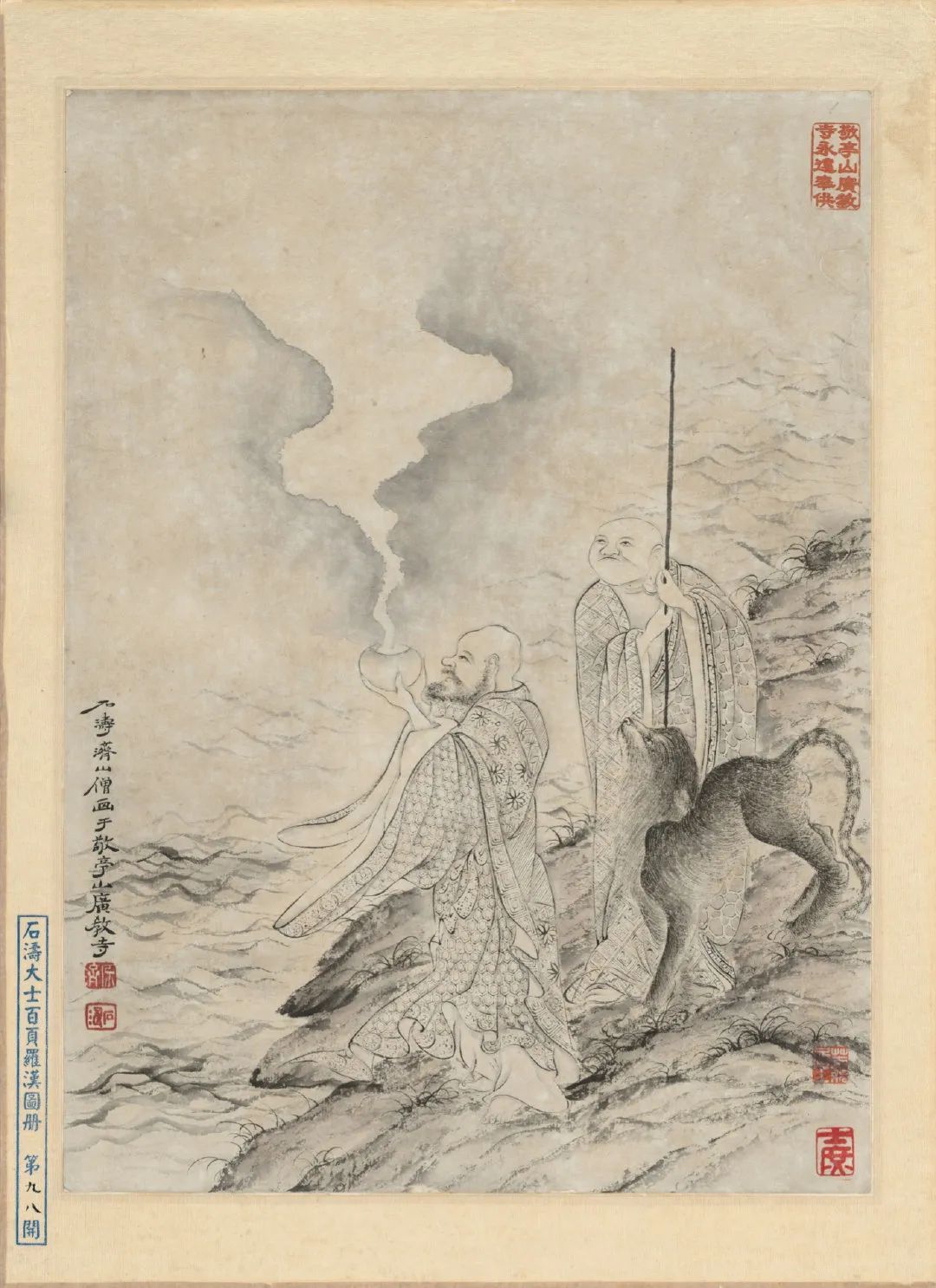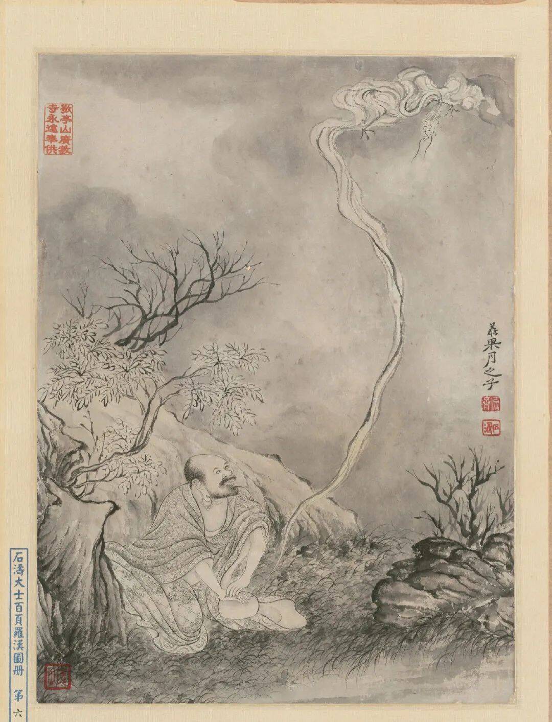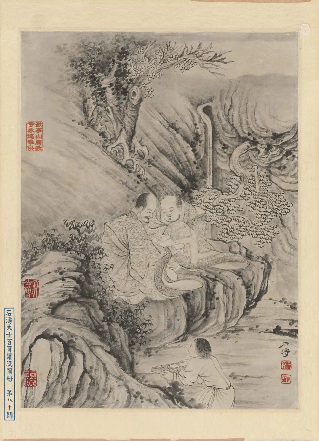 石涛《百开罗汉图册》是石涛青年时期绘制的工笔人物作品,为完整一百开册页,共画山水背景中的罗汉人物310位,各册页中罗汉左右分别陪饰众多人物及似龙、 虎、鹿、狮等神兽形象。根据石涛在画中自题,最早一开创作于“丁未” (1667 年),石涛时年26岁。整套册页作品分别作于1667年、1669年、1670年,1672年,即从石涛的26岁至31岁,历时6年之久,实为石涛倾力之作。
