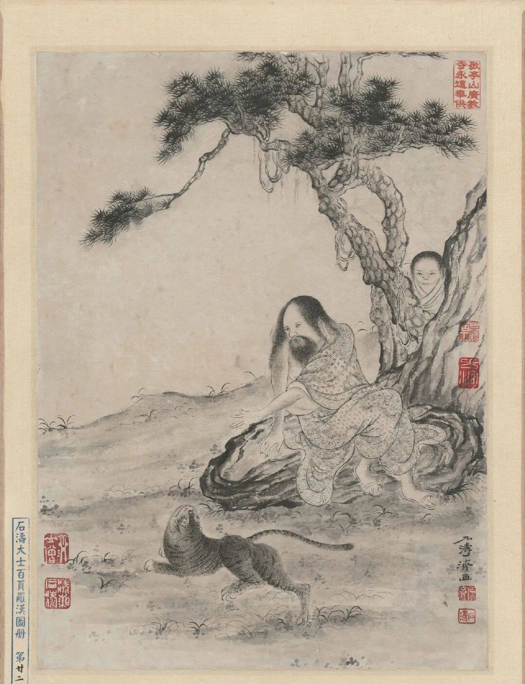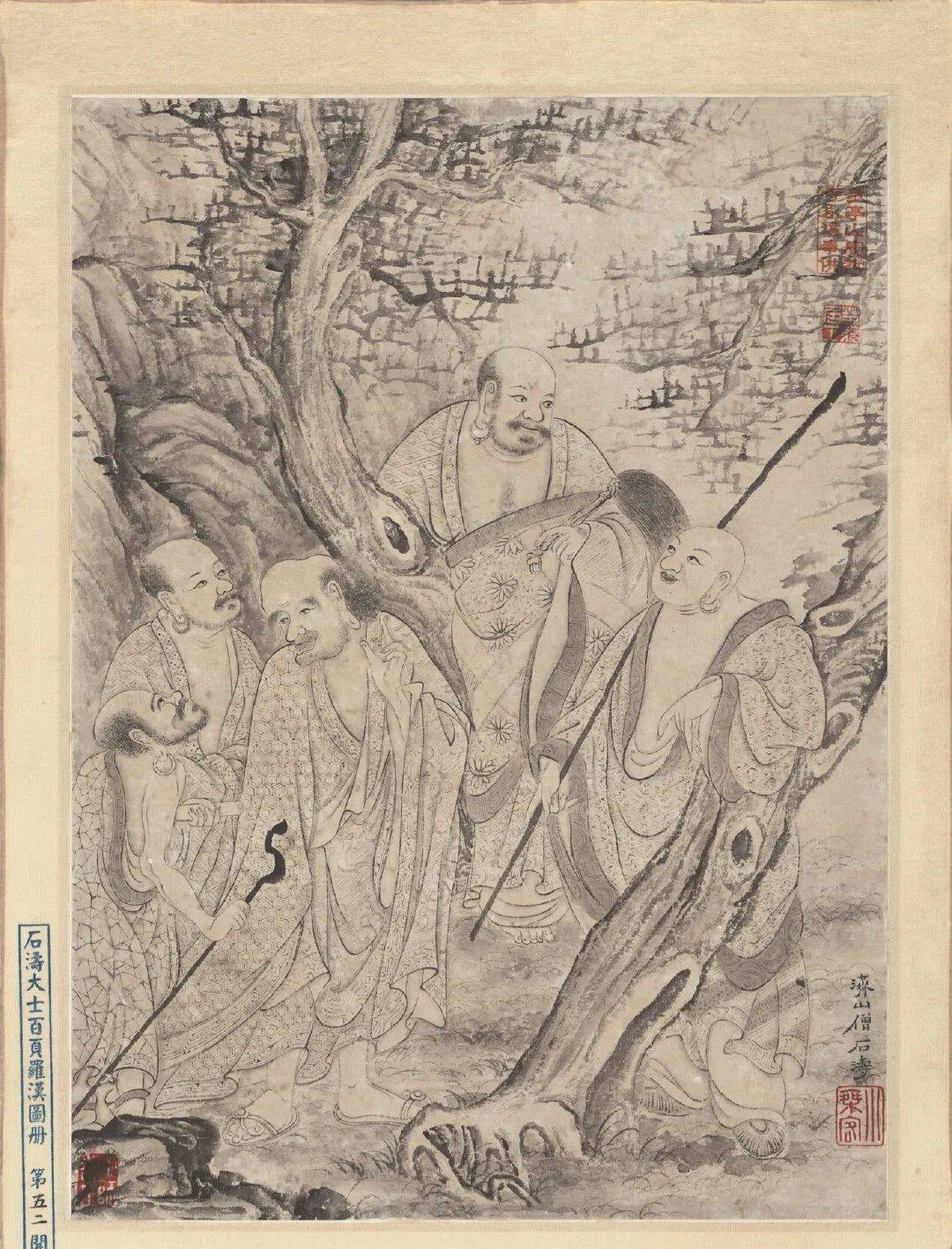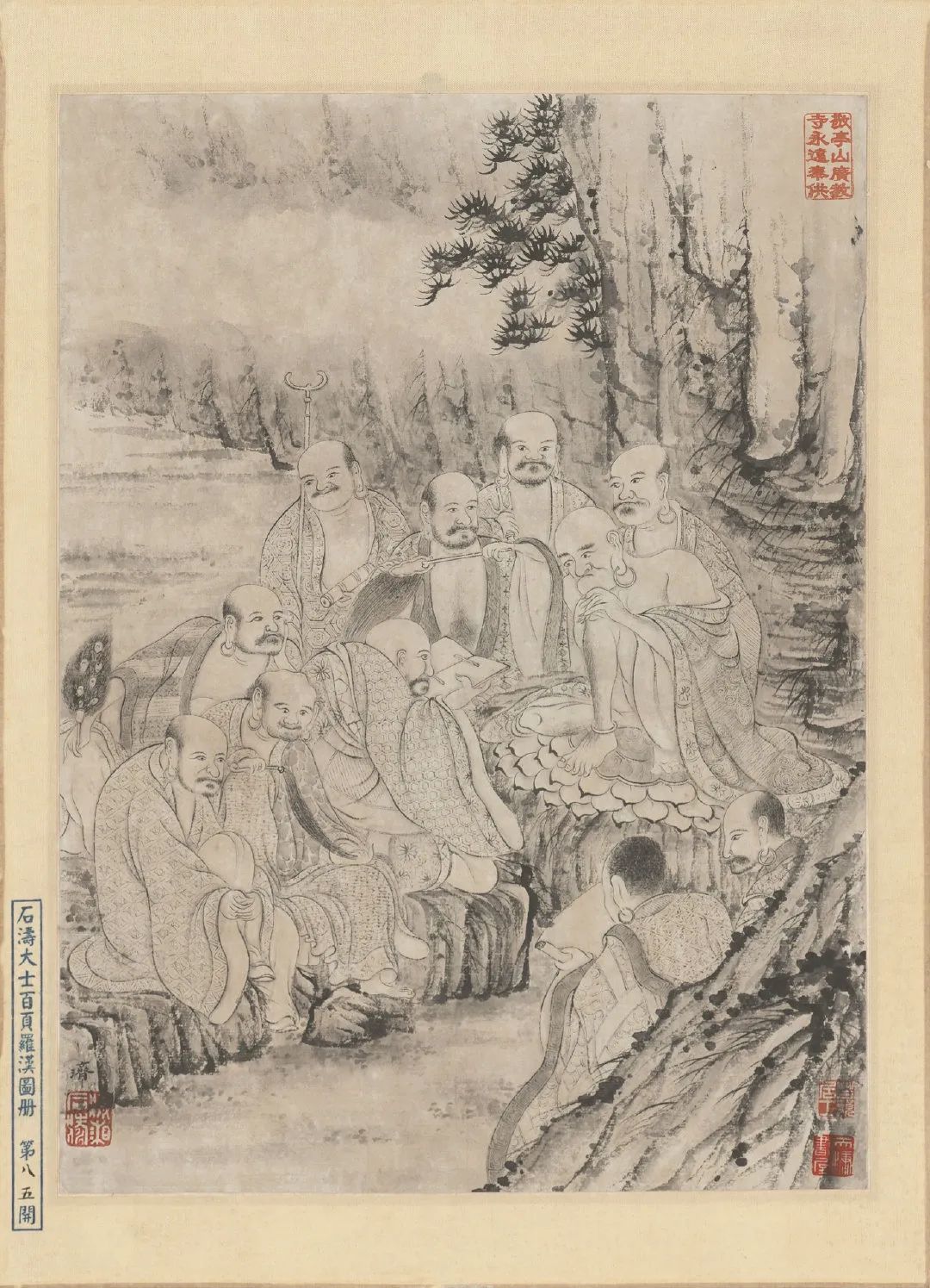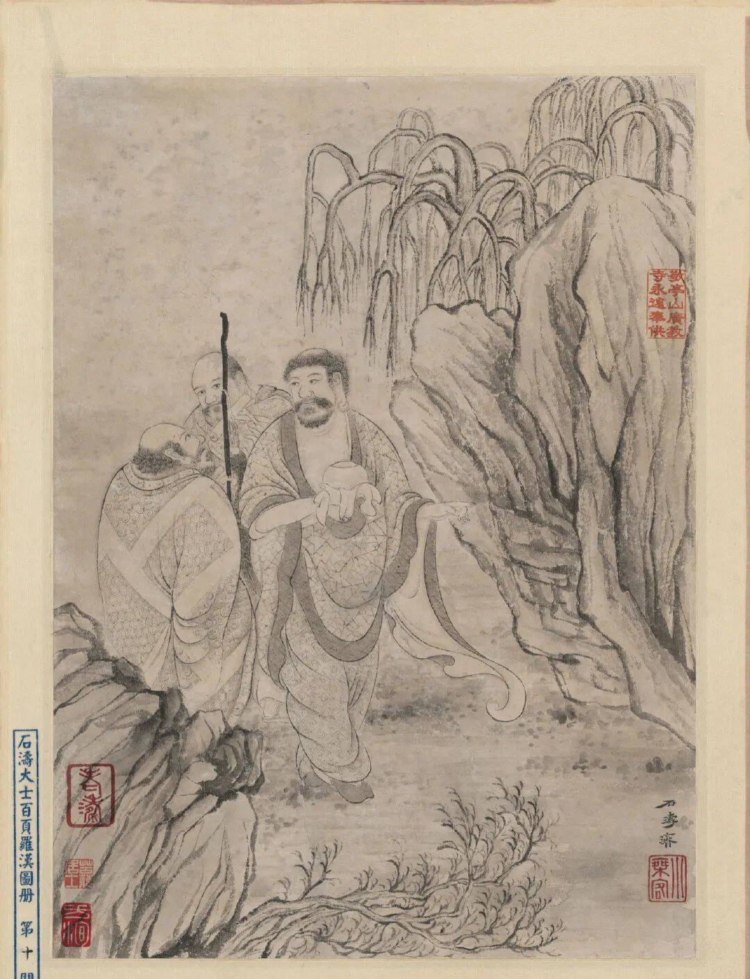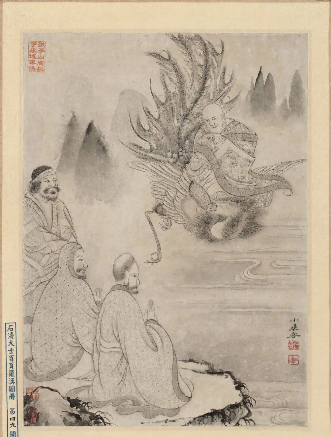 石涛《百开罗汉图册》是石涛青年时期绘制的工笔人物作品,为完整一百开册页,共画山水背景中的罗汉人物310位,各册页中罗汉左右分别陪饰众多人物及似龙、 虎、鹿、狮等神兽形象。根据石涛在画中自题,最早一开创作于“丁未” (1667 年),石涛时年26岁。整套册页作品分别作于1667年、1669年、1670年,1672年,即从石涛的26岁至31岁,历时6年之久,实为石涛倾力之作。