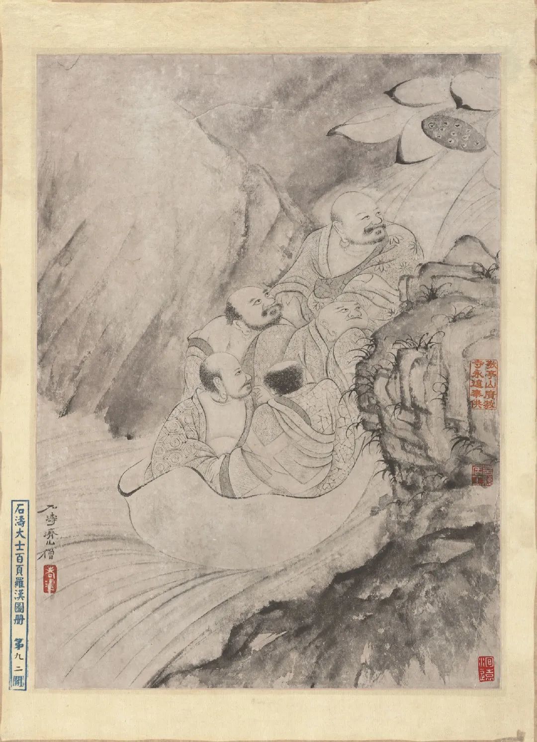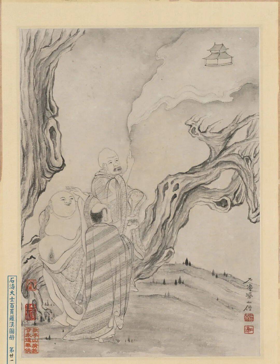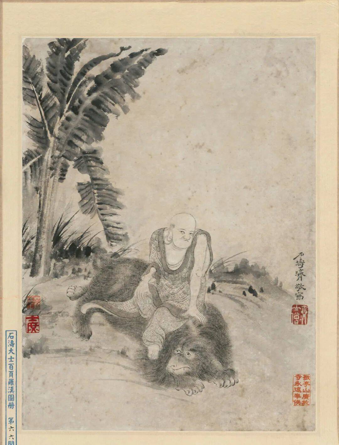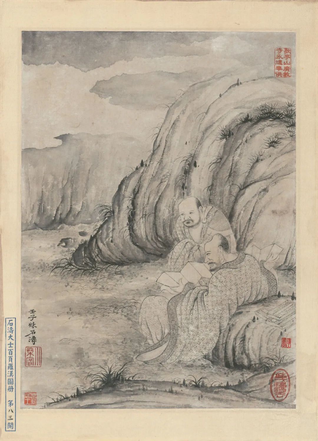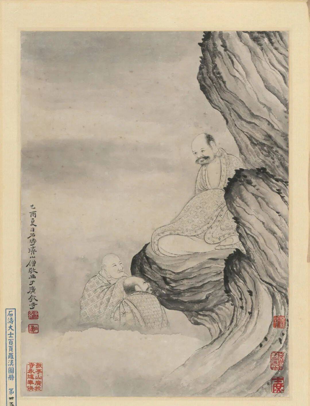 石涛《百开罗汉图册》是石涛青年时期绘制的工笔人物作品,为完整一百开册页,共画山水背景中的罗汉人物310位,各册页中罗汉左右分别陪饰众多人物及似龙、 虎、鹿、狮等神兽形象。根据石涛在画中自题,最早一开创作于“丁未” (1667 年),石涛时年26岁。整套册页作品分别作于1667年、1669年、1670年,1672年,即从石涛的26岁至31岁,历时6年之久,实为石涛倾力之作。