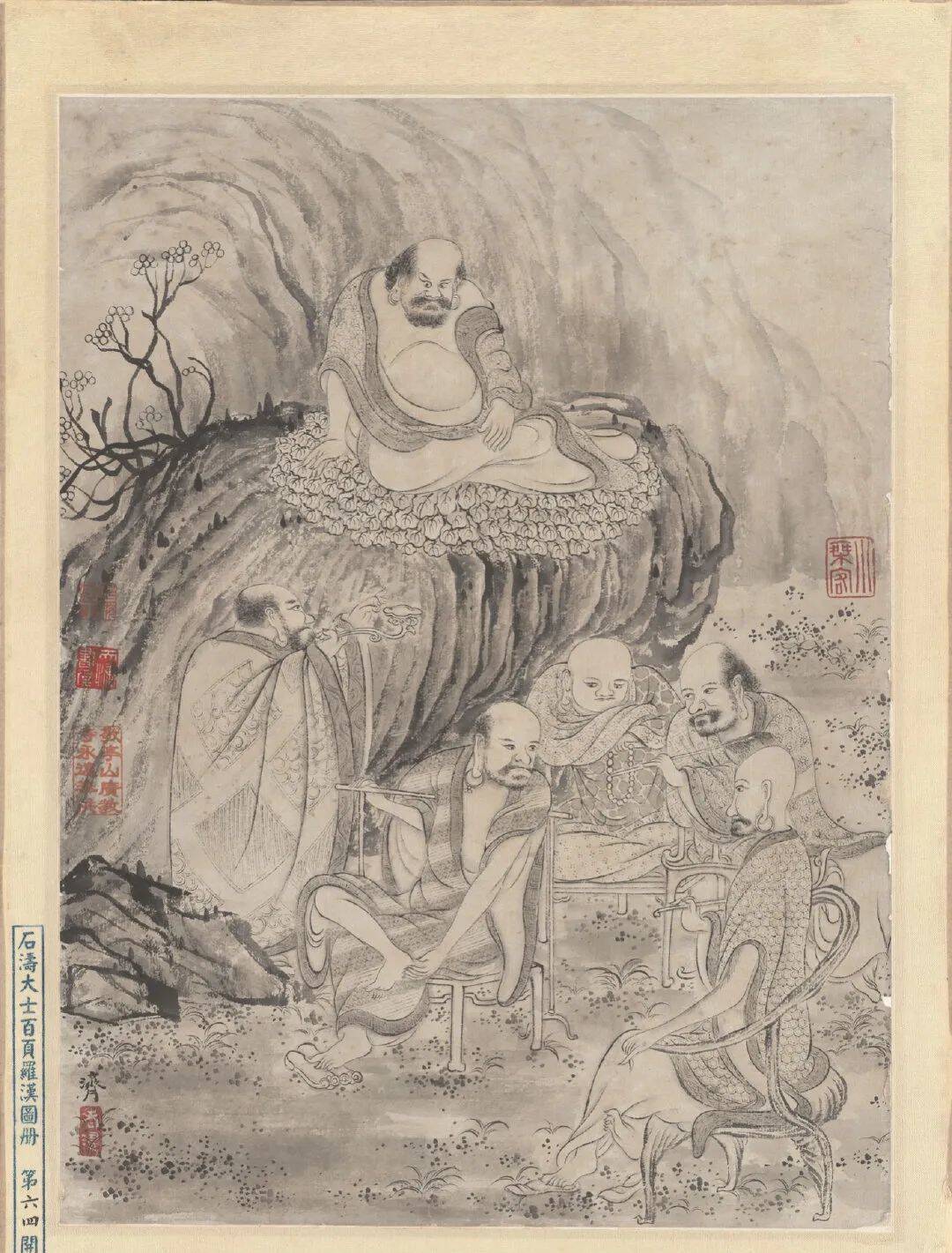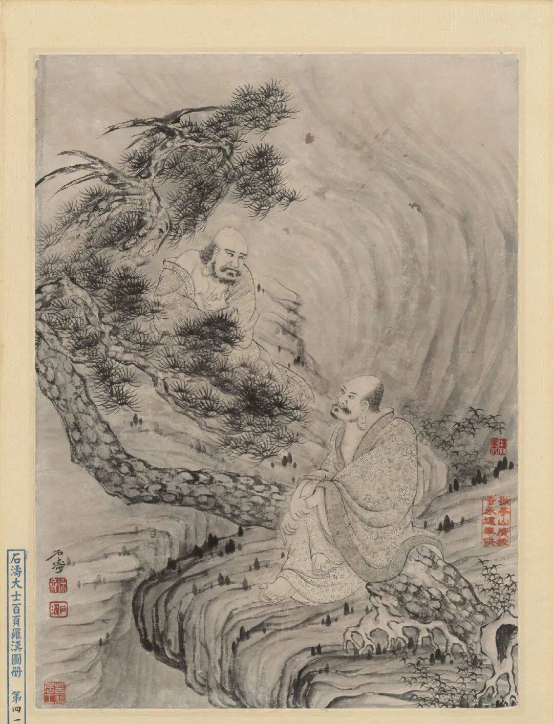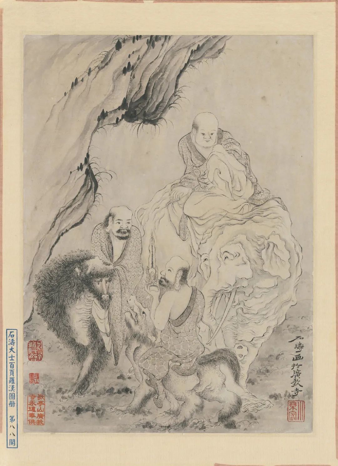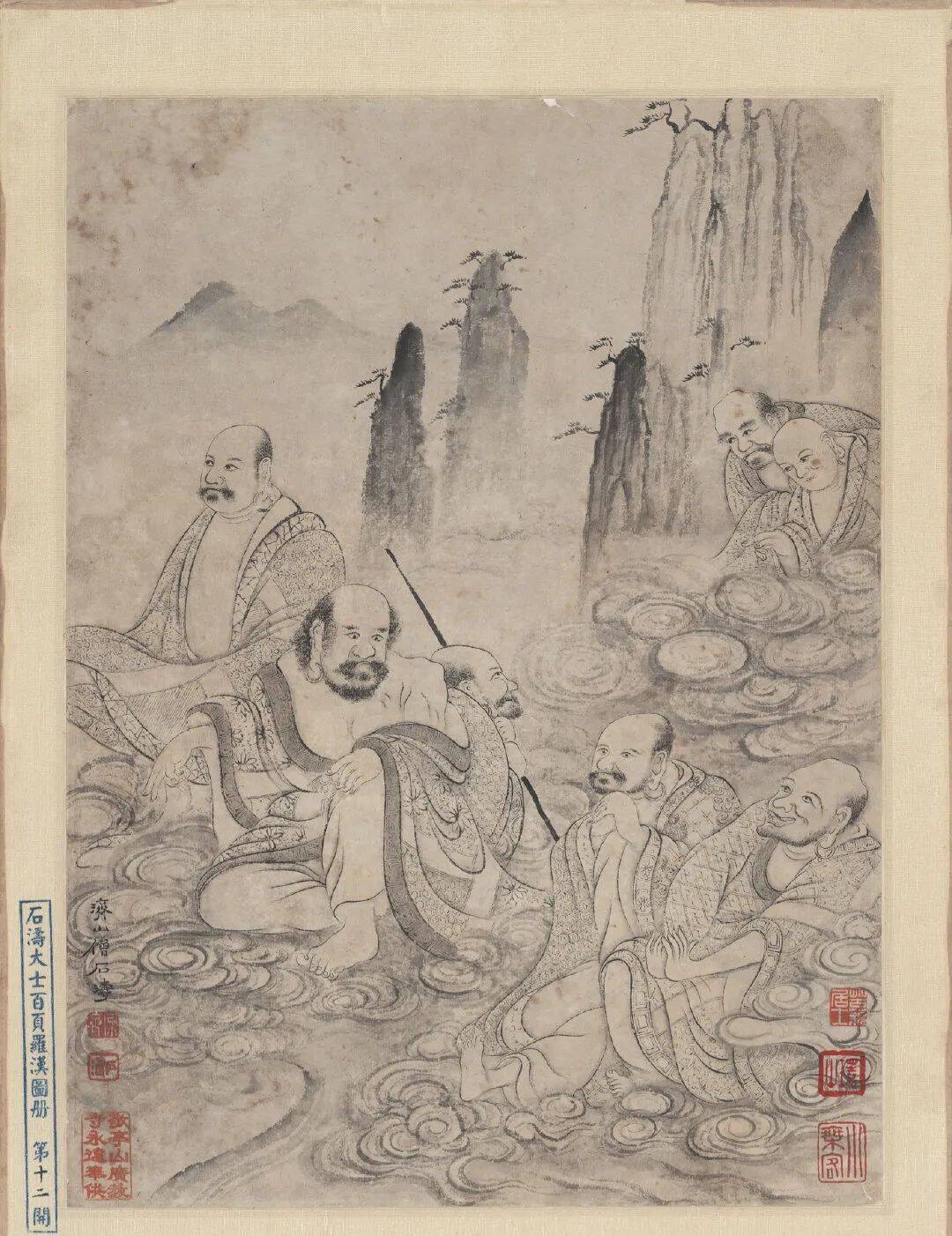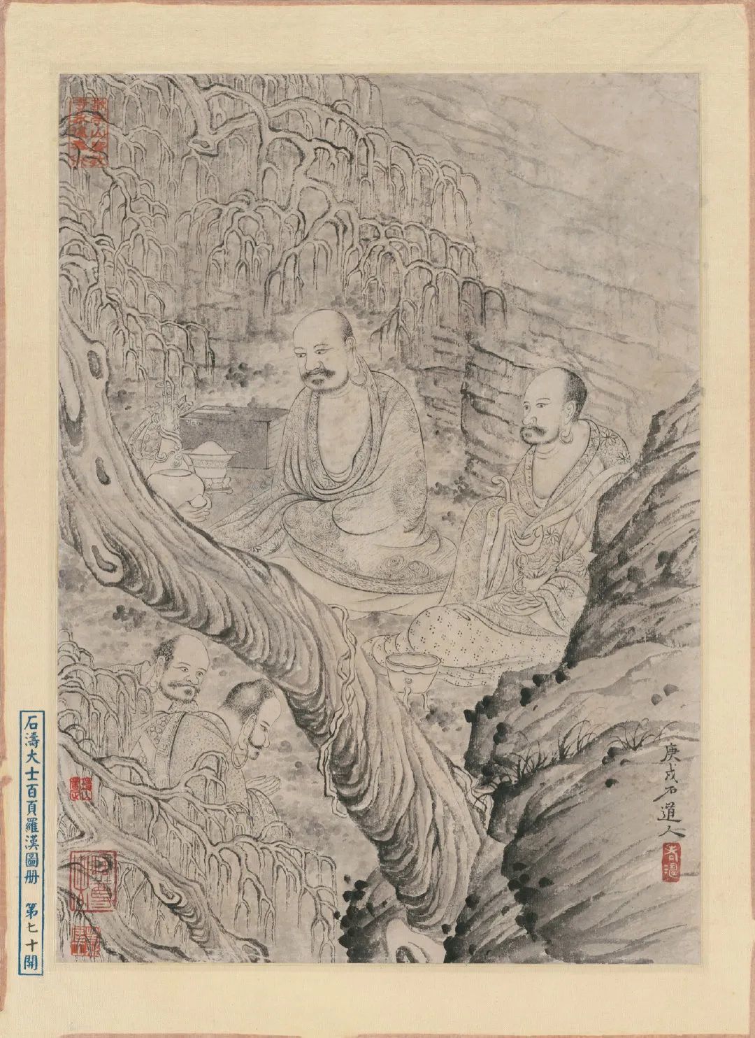 石涛《百开罗汉图册》是石涛青年时期绘制的工笔人物作品,为完整一百开册页,共画山水背景中的罗汉人物310位,各册页中罗汉左右分别陪饰众多人物及似龙、 虎、鹿、狮等神兽形象。根据石涛在画中自题,最早一开创作于“丁未” (1667 年),石涛时年26岁。整套册页作品分别作于1667年、1669年、1670年,1672年,即从石涛的26岁至31岁,历时6年之久,实为石涛倾力之作。