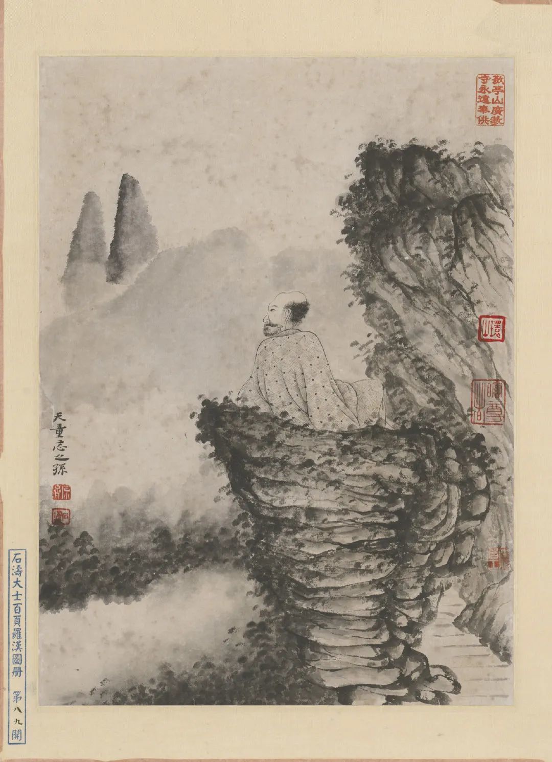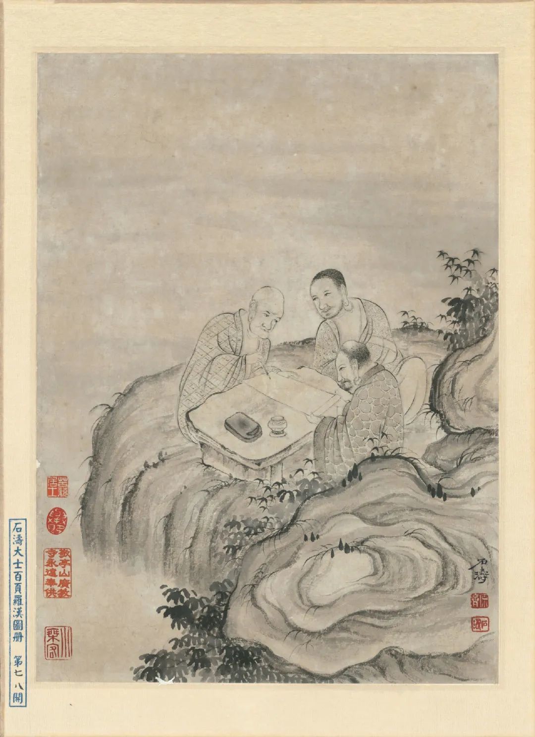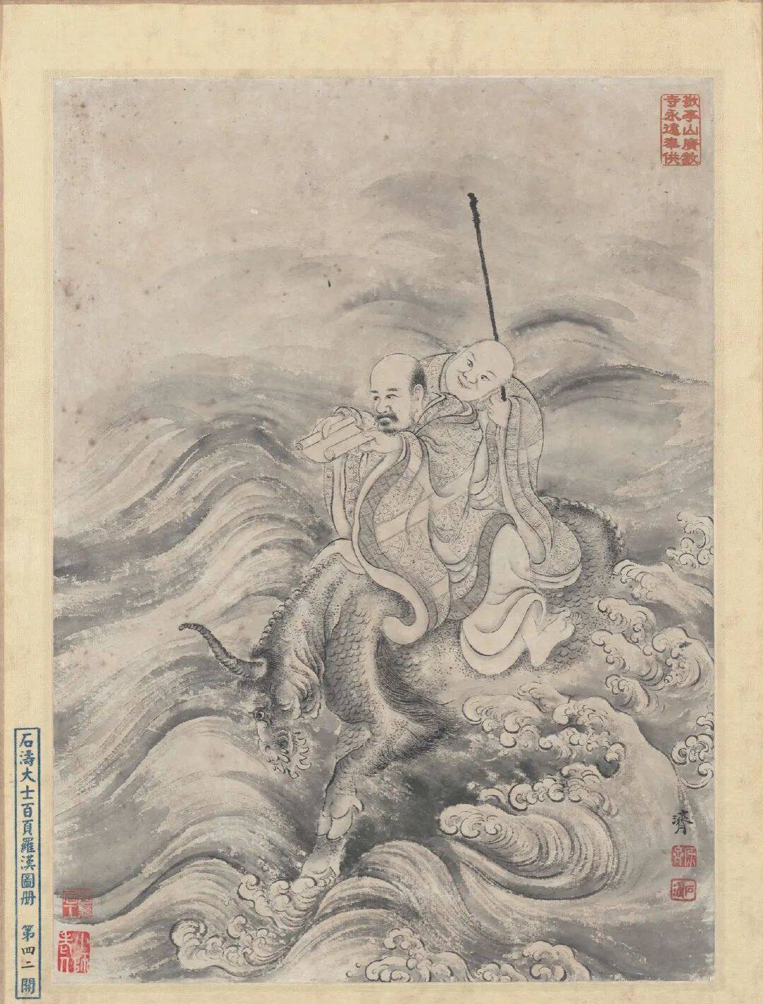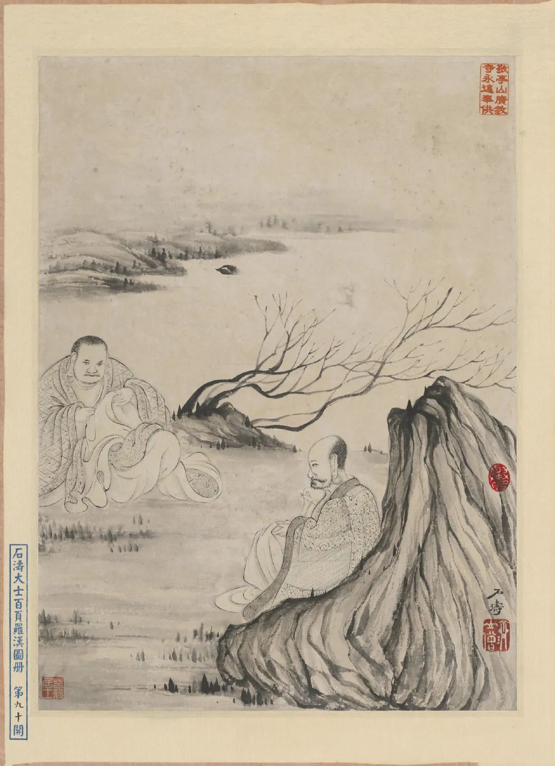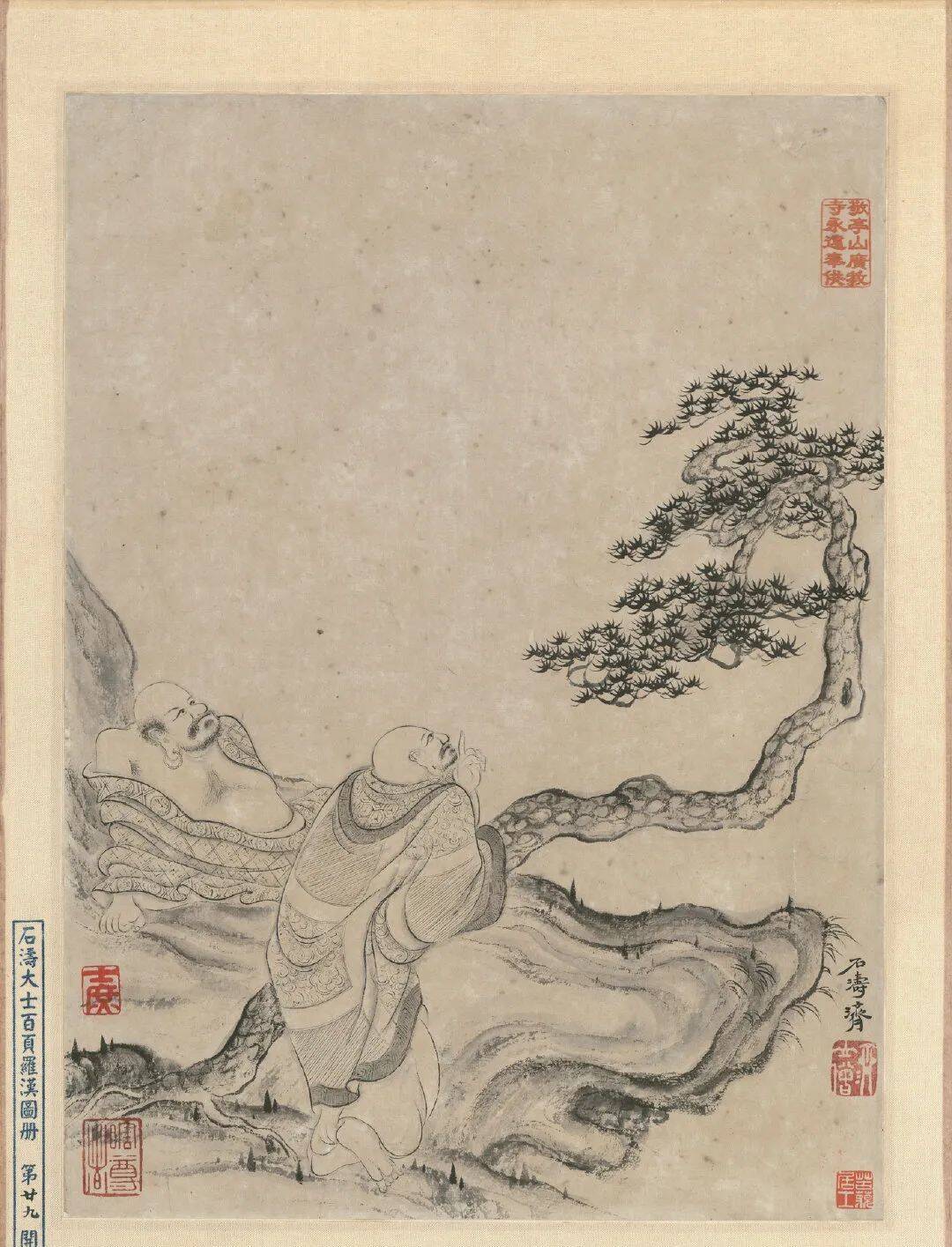 石涛《百开罗汉图册》是石涛青年时期绘制的工笔人物作品,为完整一百开册页,共画山水背景中的罗汉人物310位,各册页中罗汉左右分别陪饰众多人物及似龙、 虎、鹿、狮等神兽形象。根据石涛在画中自题,最早一开创作于“丁未” (1667 年),石涛时年26岁。整套册页作品分别作于1667年、1669年、1670年,1672年,即从石涛的26岁至31岁,历时6年之久,实为石涛倾力之作。