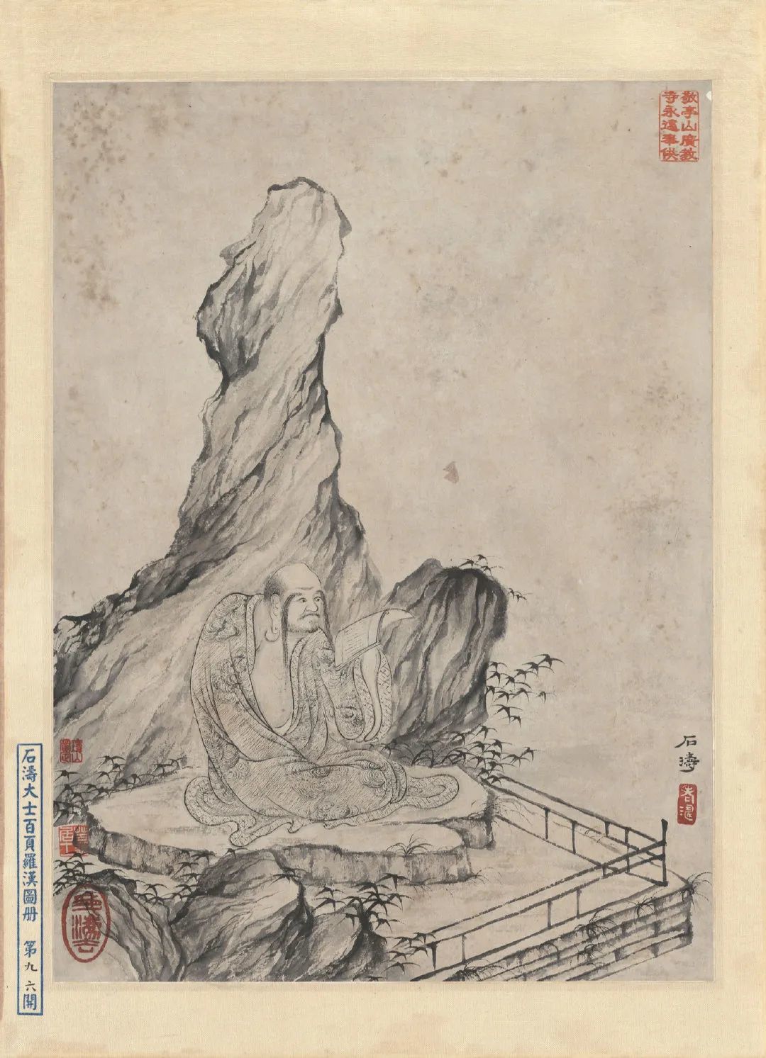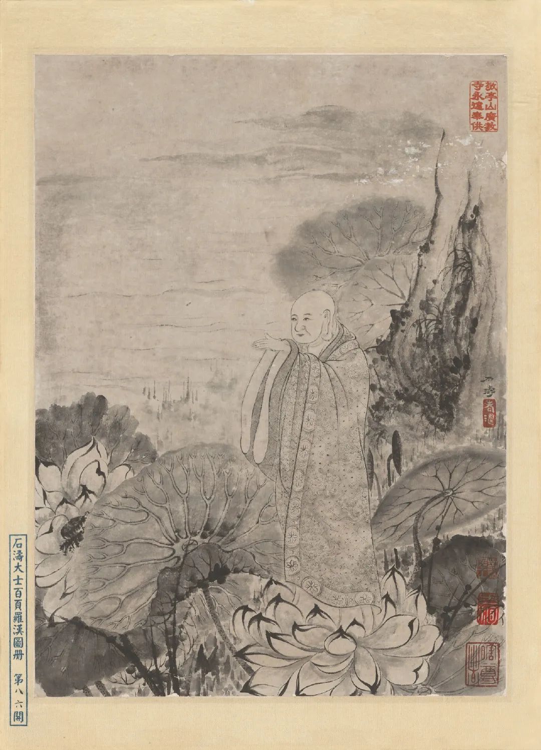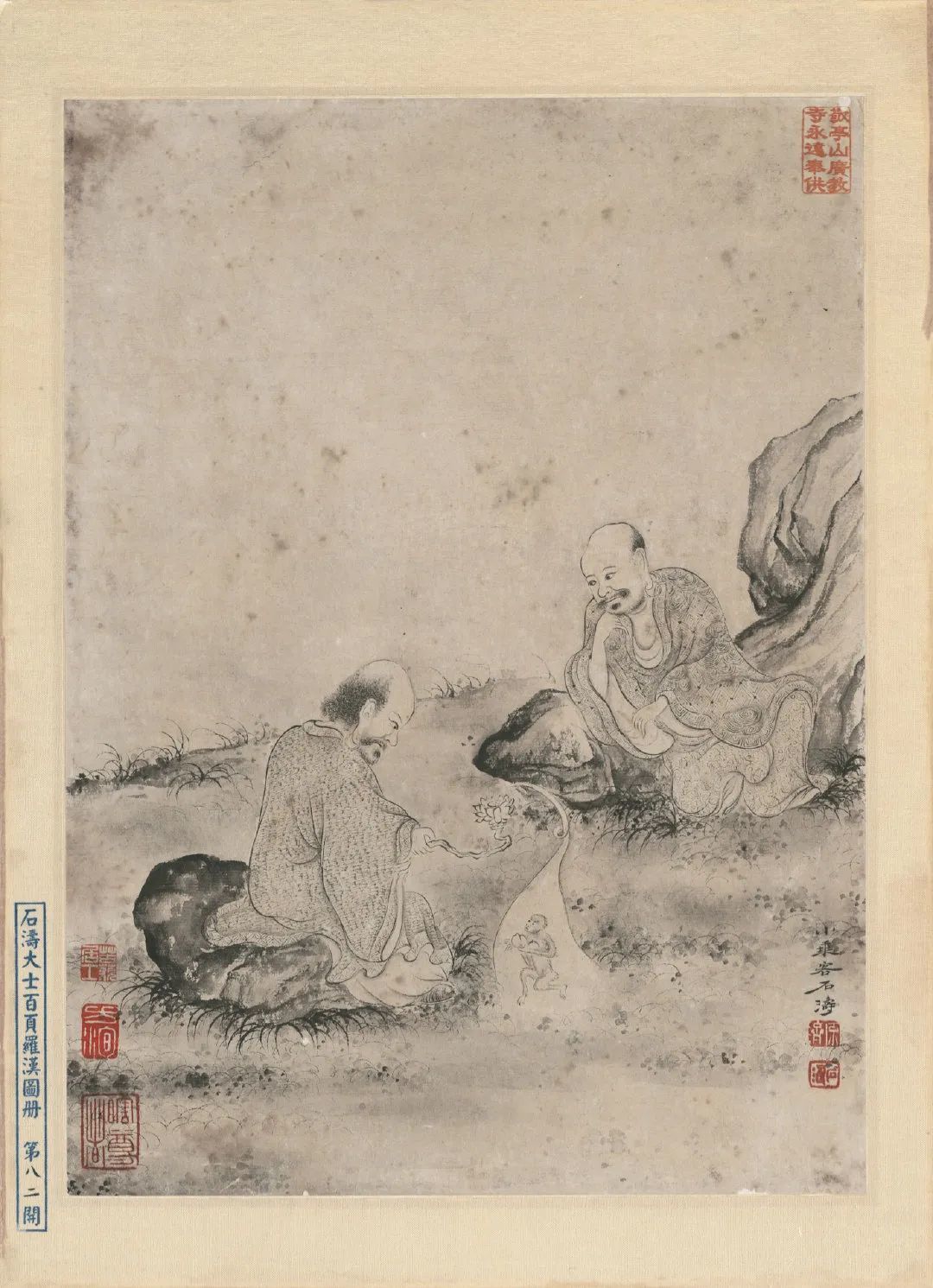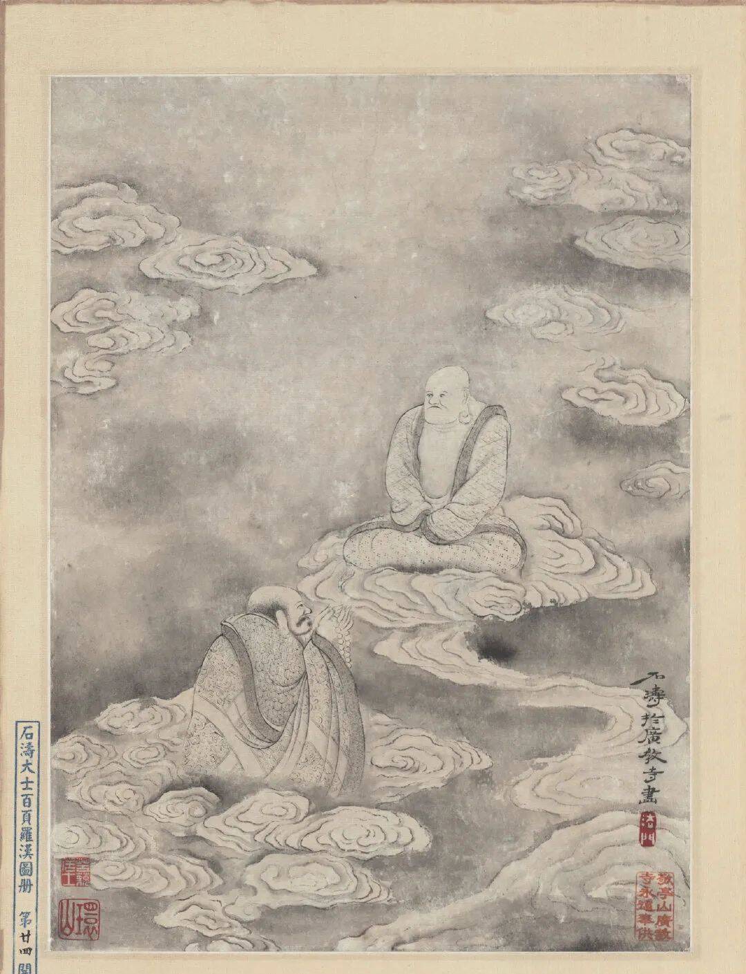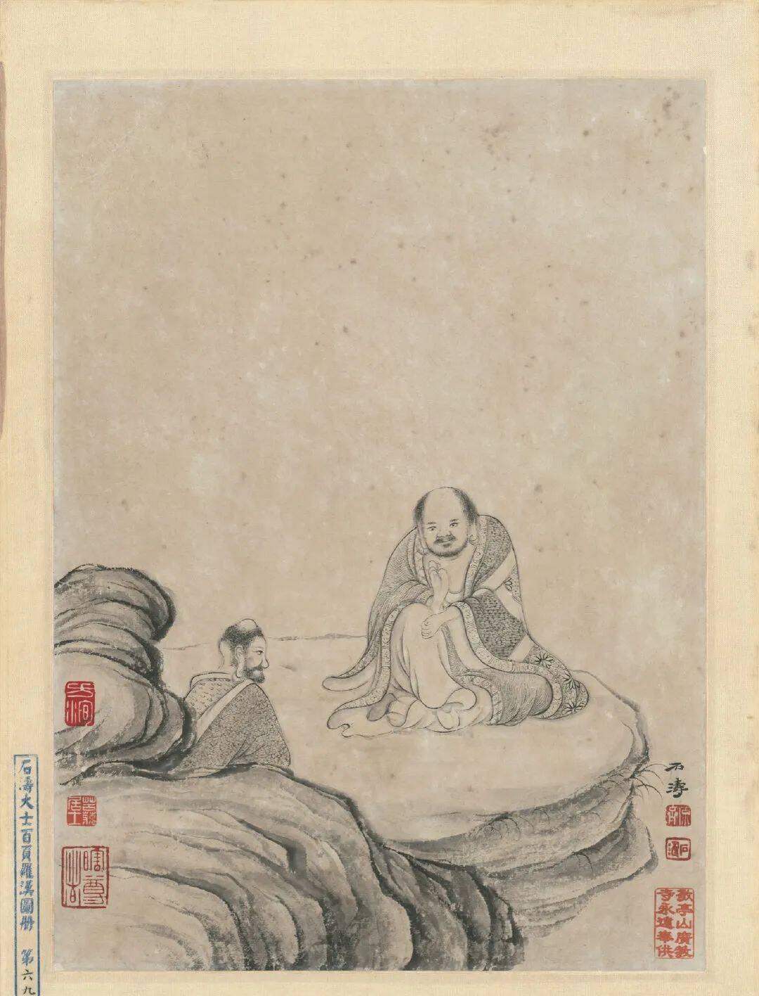 石涛《百开罗汉图册》是石涛青年时期绘制的工笔人物作品,为完整一百开册页,共画山水背景中的罗汉人物310位,各册页中罗汉左右分别陪饰众多人物及似龙、 虎、鹿、狮等神兽形象。根据石涛在画中自题,最早一开创作于“丁未” (1667 年),石涛时年26岁。整套册页作品分别作于1667年、1669年、1670年,1672年,即从石涛的26岁至31岁,历时6年之久,实为石涛倾力之作。
