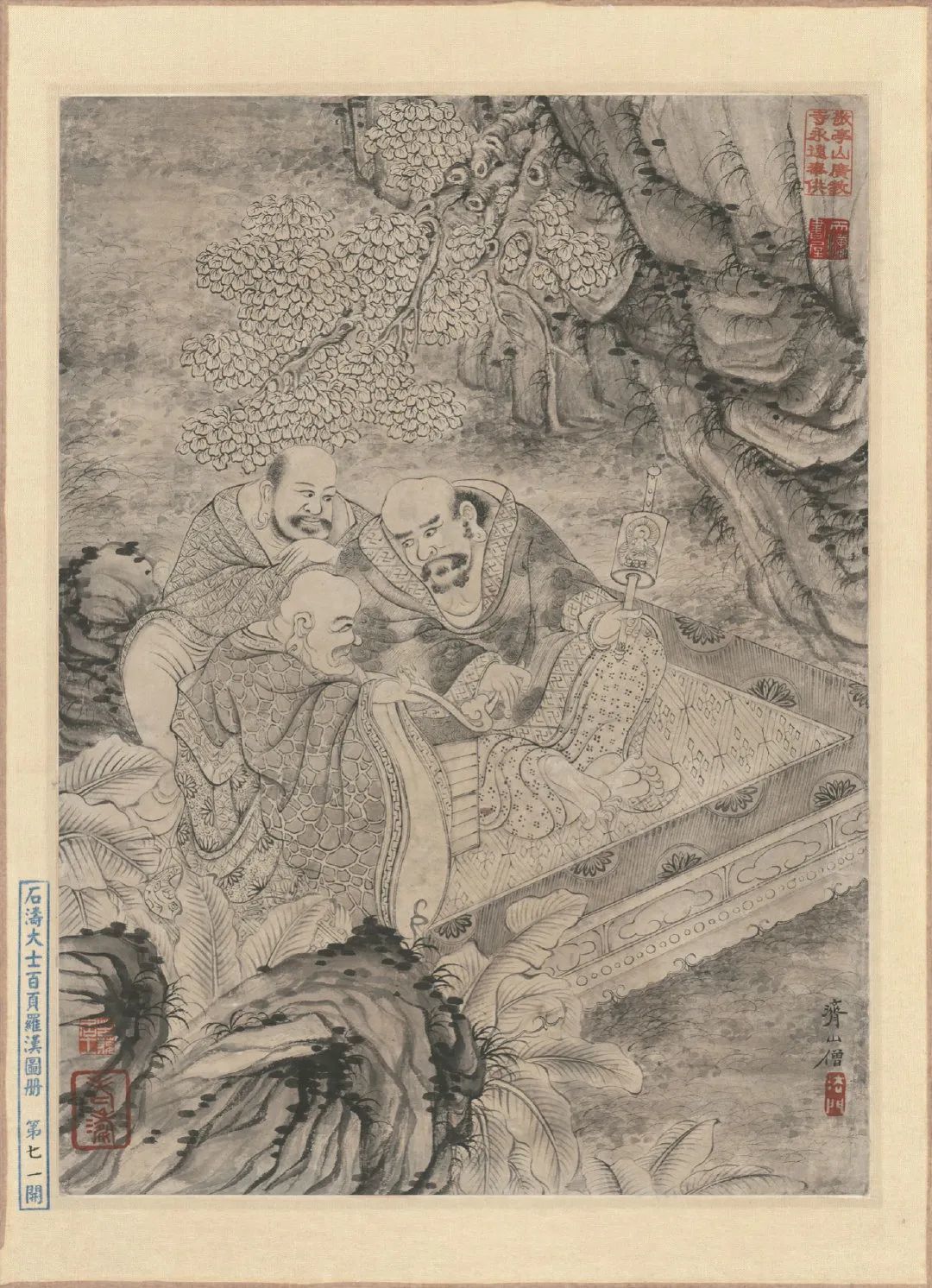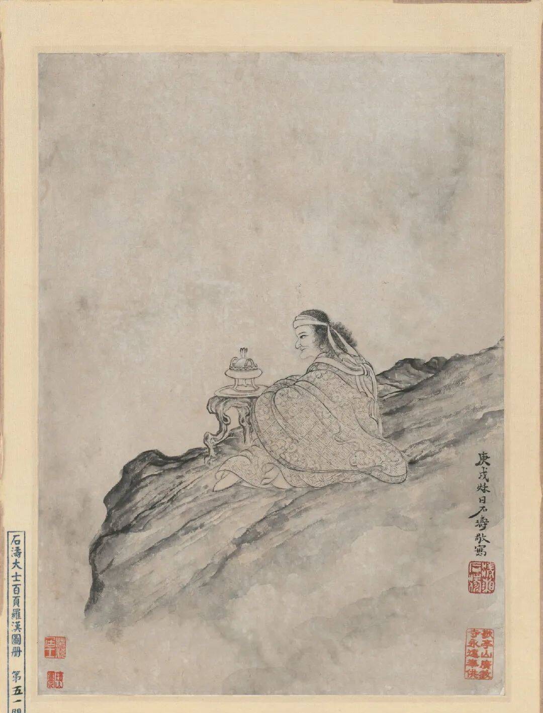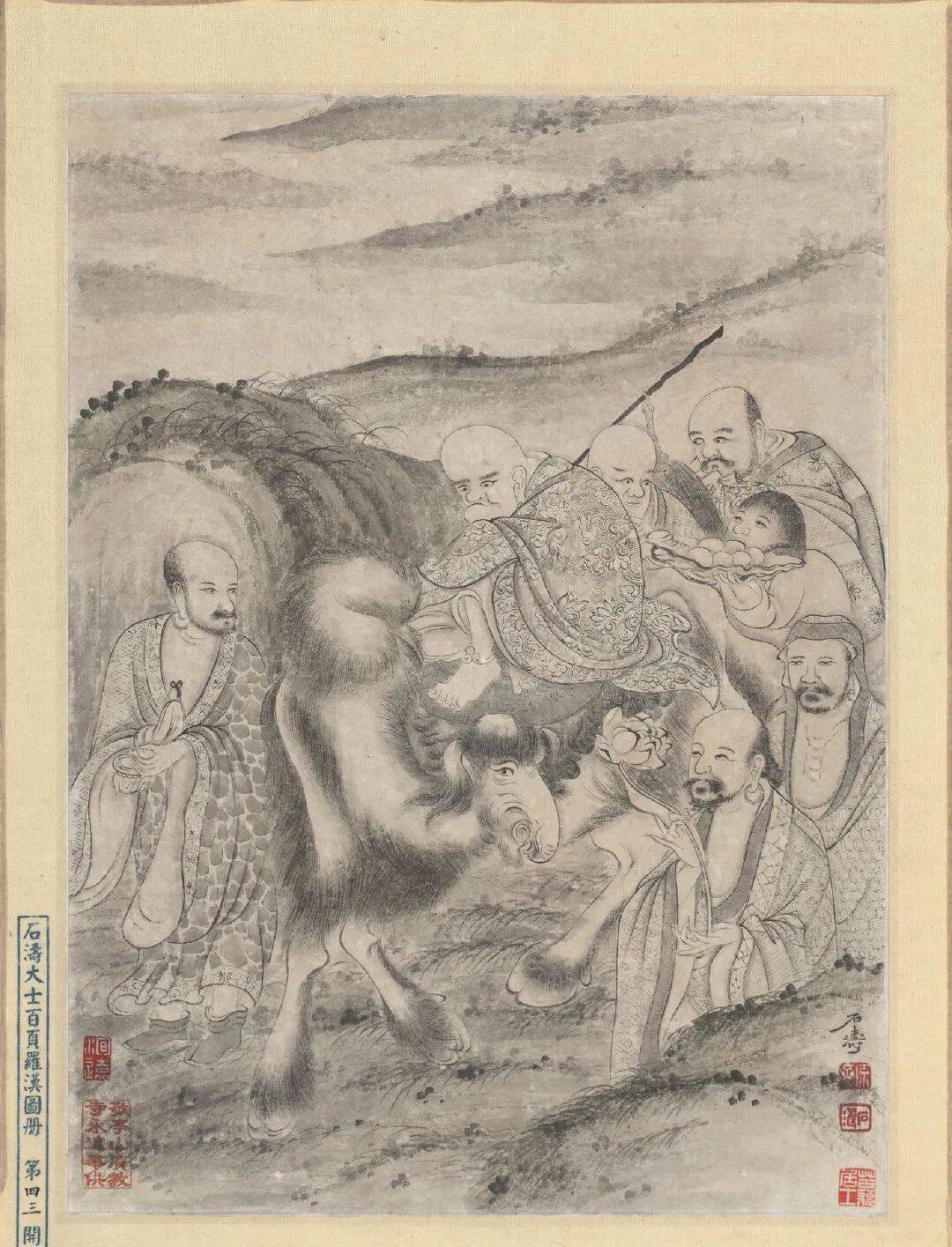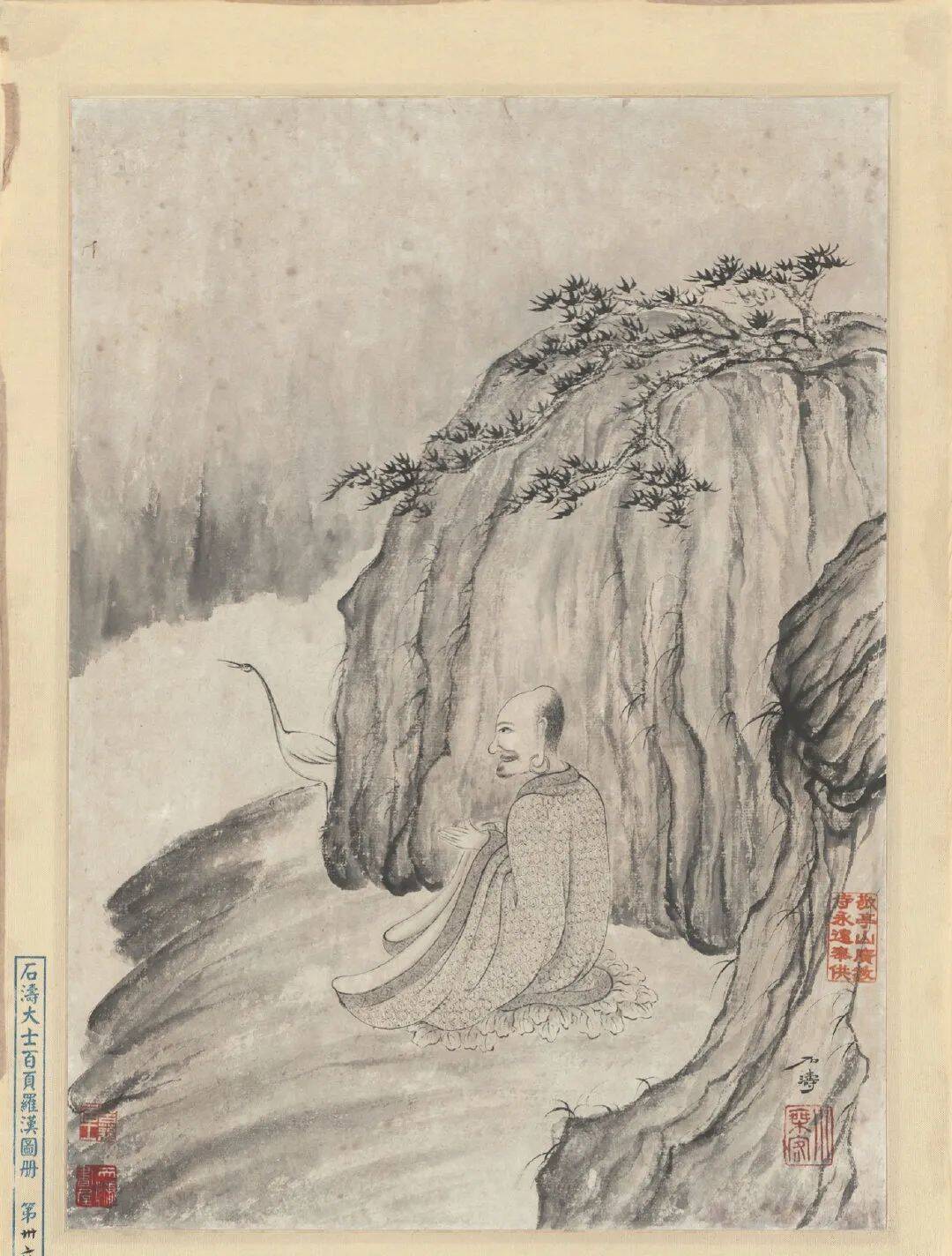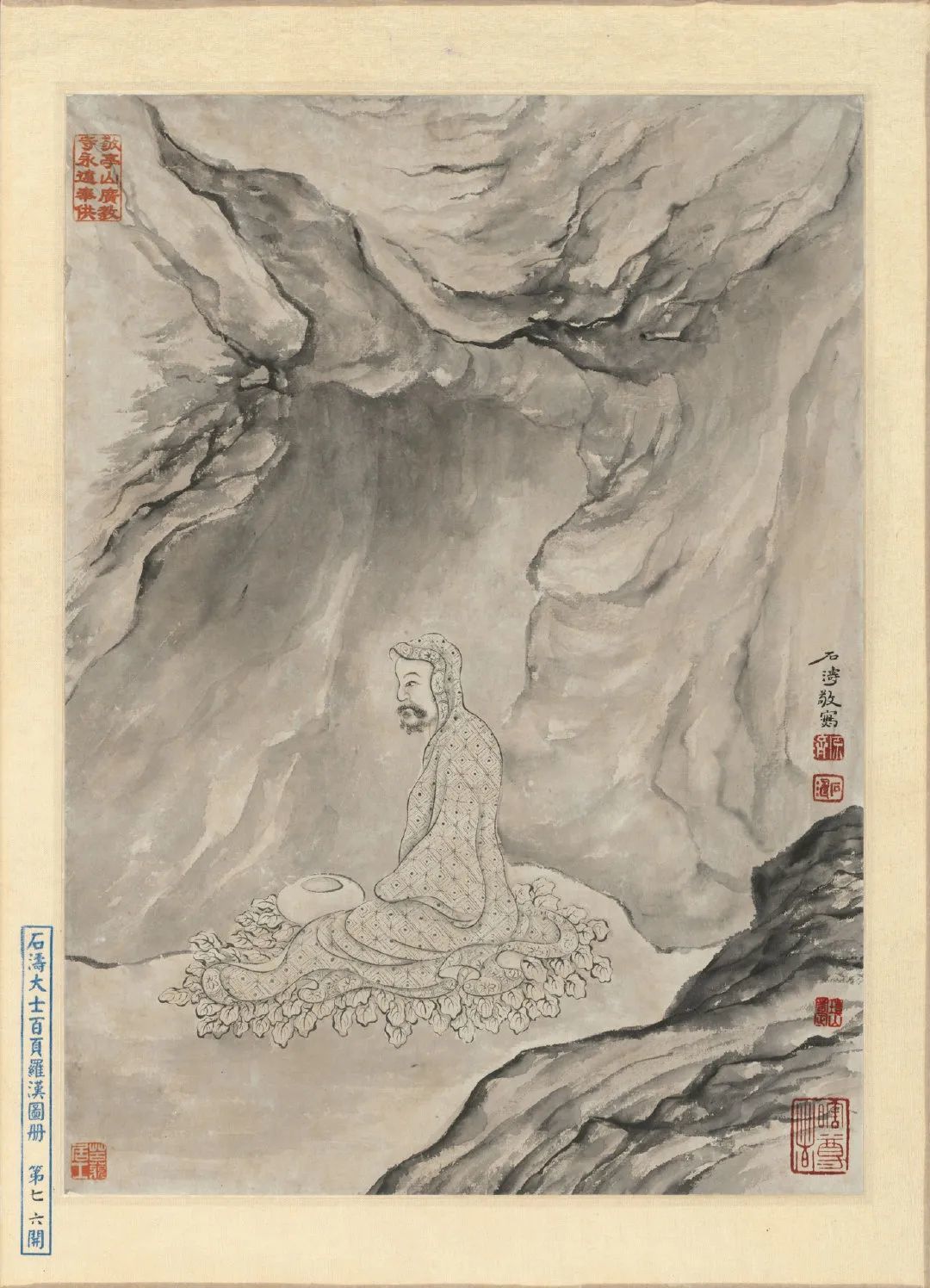 石涛《百开罗汉图册》是石涛青年时期绘制的工笔人物作品,为完整一百开册页,共画山水背景中的罗汉人物310位,各册页中罗汉左右分别陪饰众多人物及似龙、 虎、鹿、狮等神兽形象。根据石涛在画中自题,最早一开创作于“丁未” (1667 年),石涛时年26岁。整套册页作品分别作于1667年、1669年、1670年,1672年,即从石涛的26岁至31岁,历时6年之久,实为石涛倾力之作。
