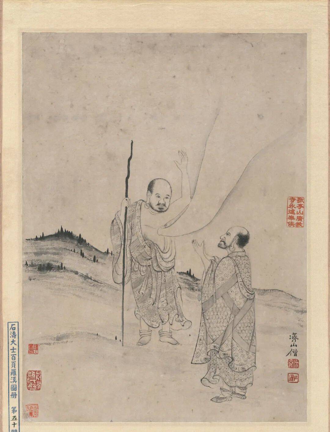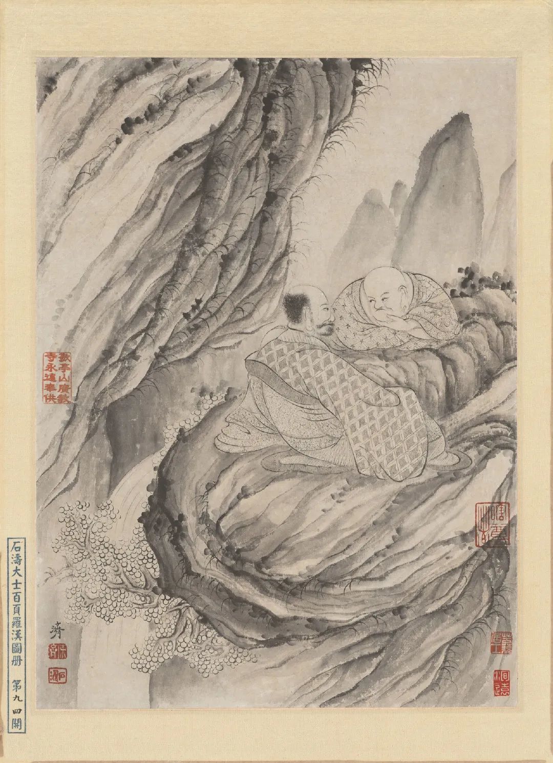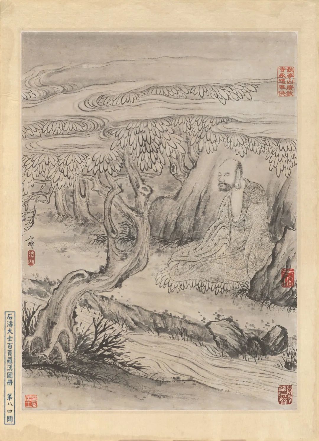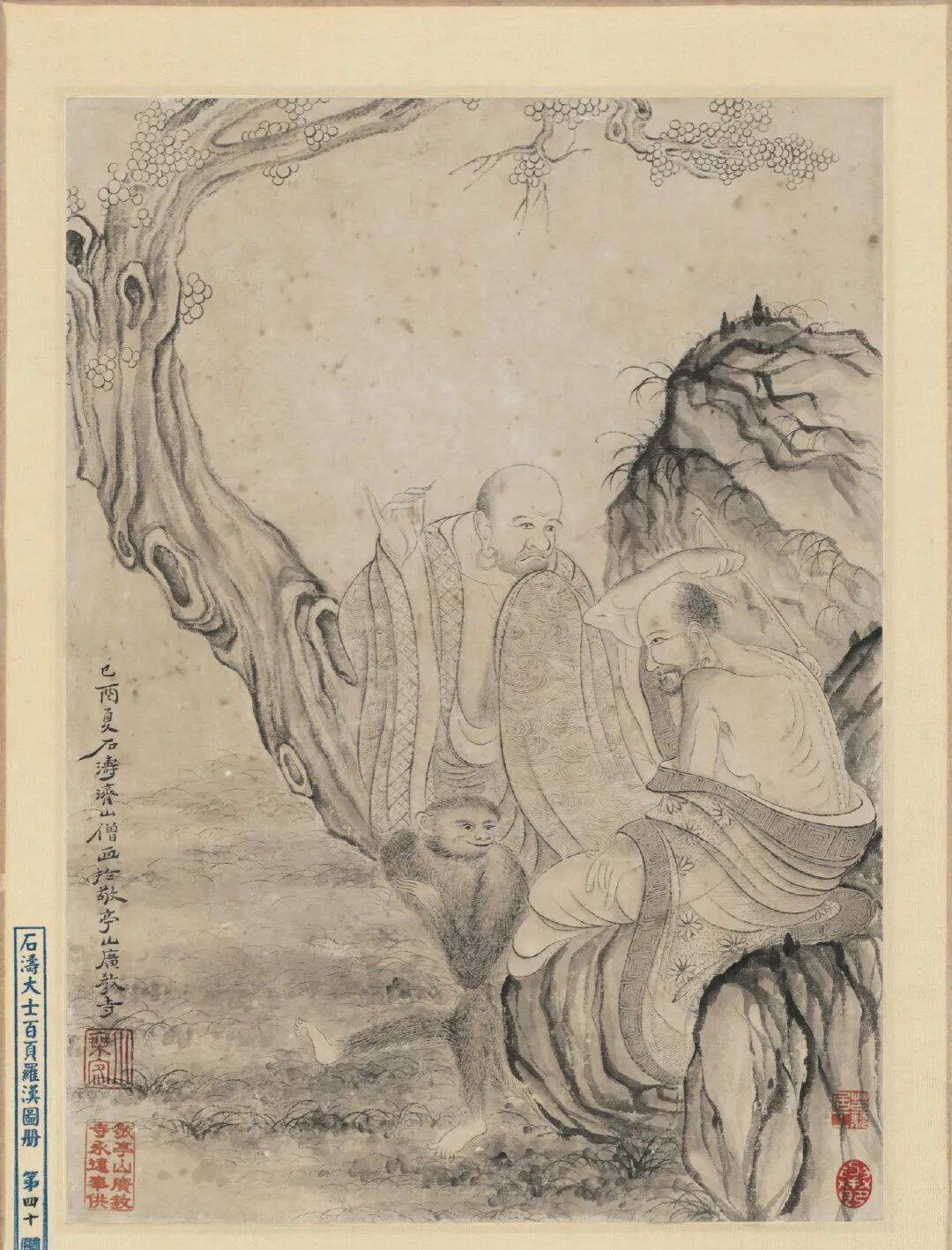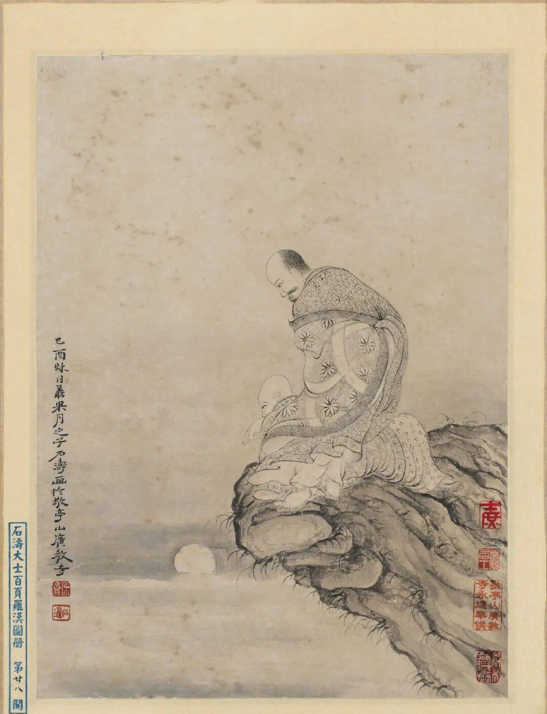 石涛《百开罗汉图册》是石涛青年时期绘制的工笔人物作品,为完整一百开册页,共画山水背景中的罗汉人物310位,各册页中罗汉左右分别陪饰众多人物及似龙、 虎、鹿、狮等神兽形象。根据石涛在画中自题,最早一开创作于“丁未” (1667 年),石涛时年26岁。整套册页作品分别作于1667年、1669年、1670年,1672年,即从石涛的26岁至31岁,历时6年之久,实为石涛倾力之作。