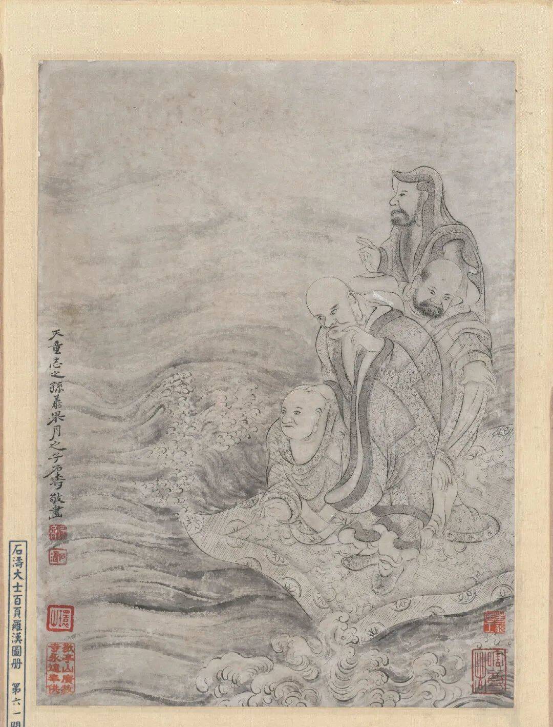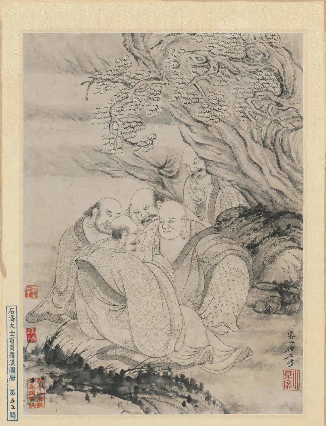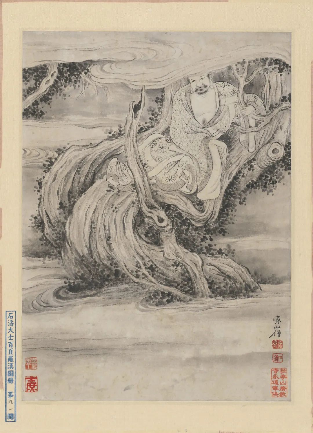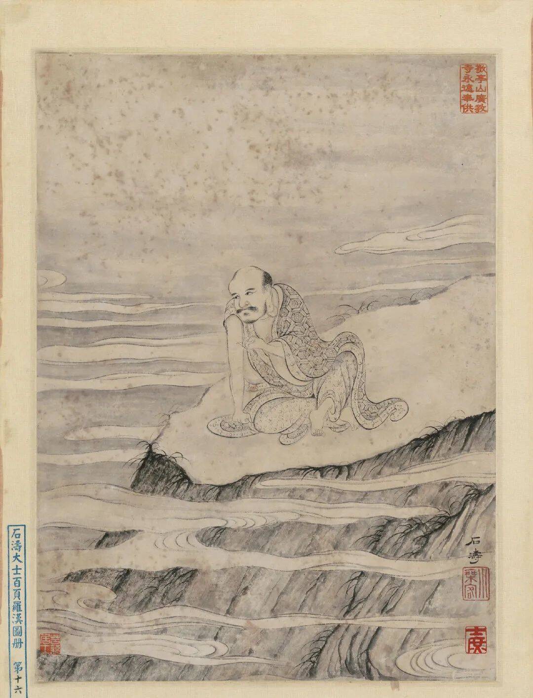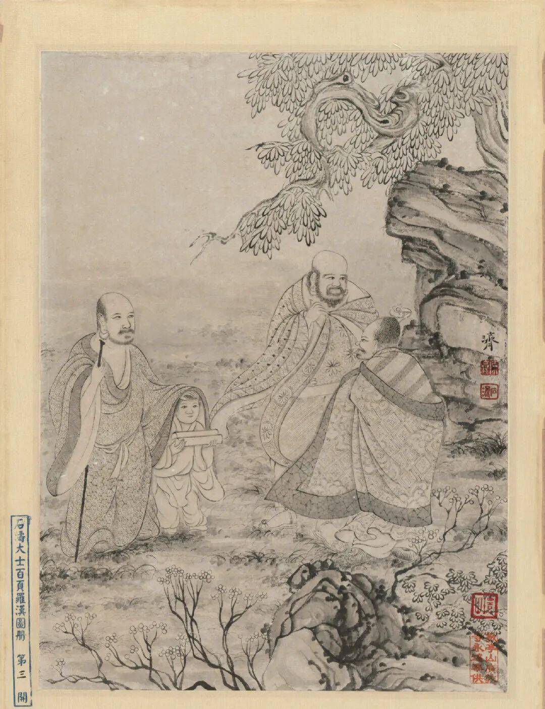 石涛《百开罗汉图册》是石涛青年时期绘制的工笔人物作品,为完整一百开册页,共画山水背景中的罗汉人物310位,各册页中罗汉左右分别陪饰众多人物及似龙、 虎、鹿、狮等神兽形象。根据石涛在画中自题,最早一开创作于“丁未” (1667 年),石涛时年26岁。整套册页作品分别作于1667年、1669年、1670年,1672年,即从石涛的26岁至31岁,历时6年之久,实为石涛倾力之作。