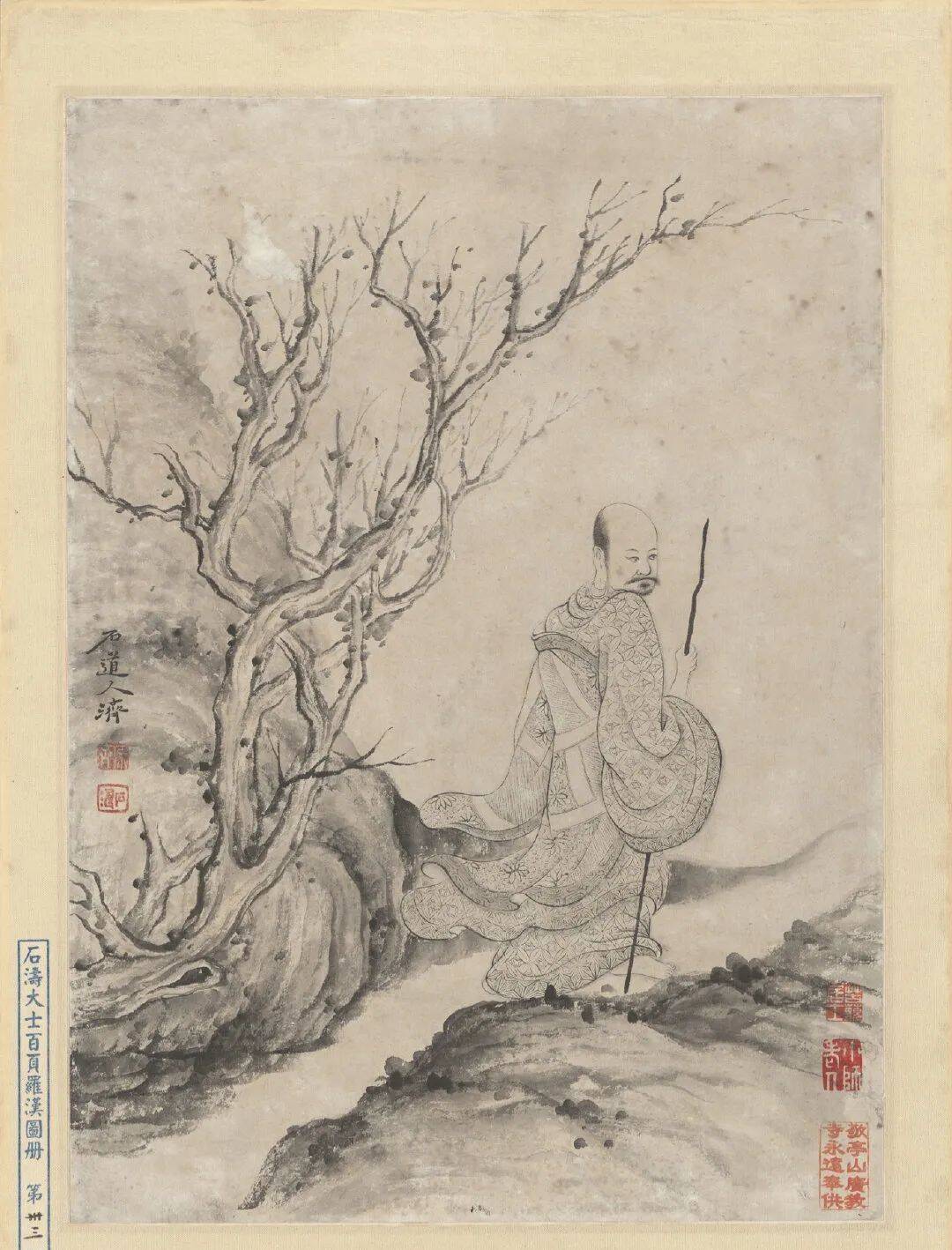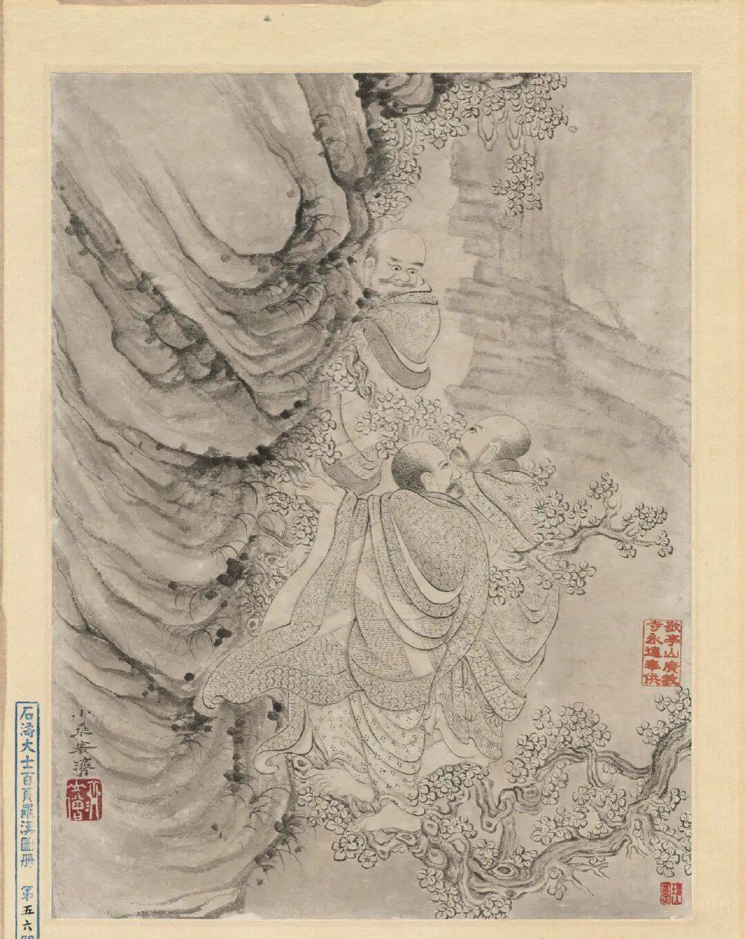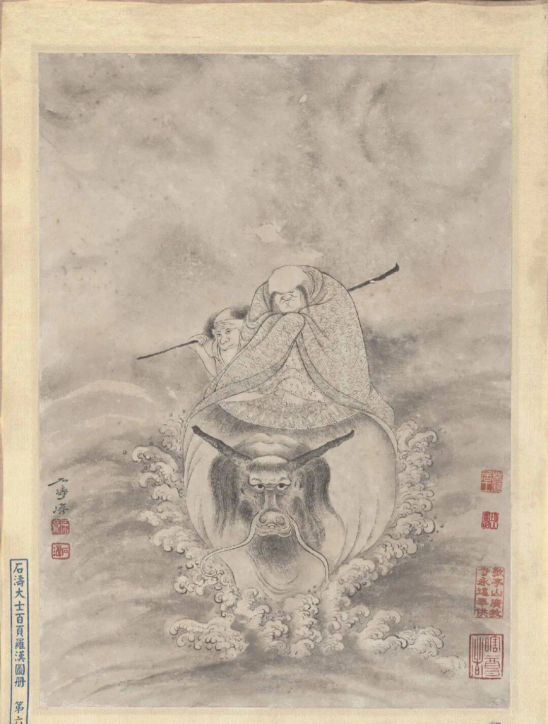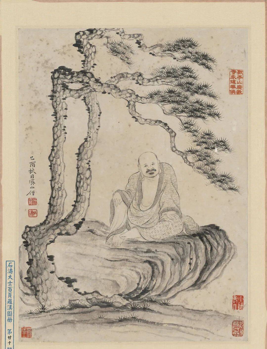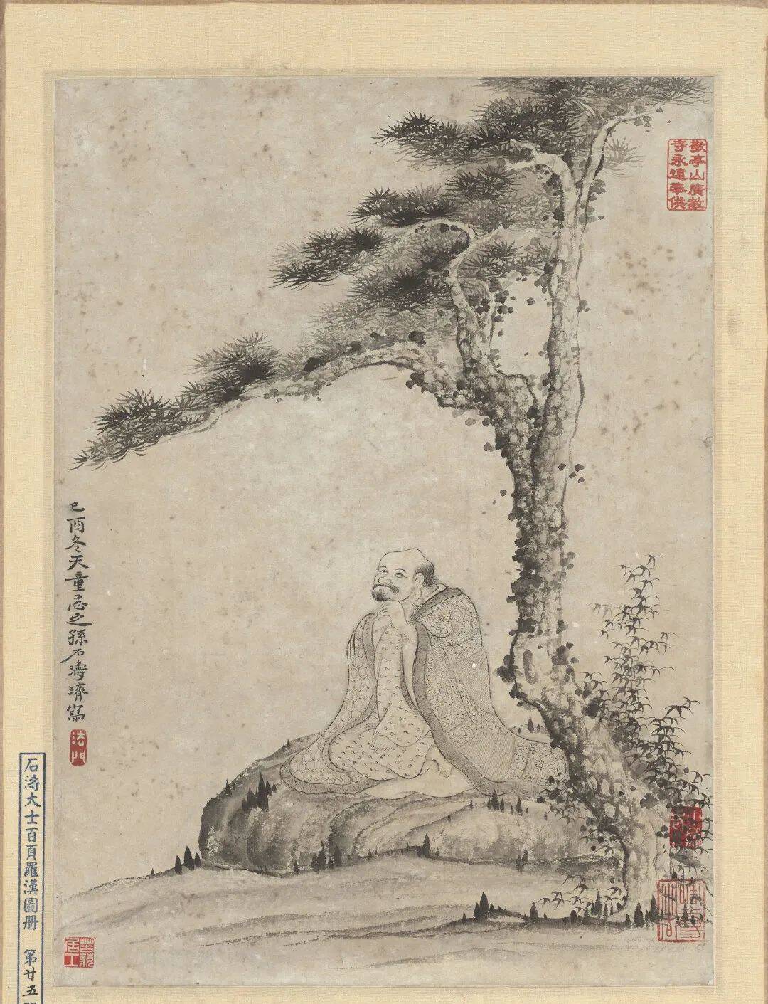 石涛《百开罗汉图册》是石涛青年时期绘制的工笔人物作品,为完整一百开册页,共画山水背景中的罗汉人物310位,各册页中罗汉左右分别陪饰众多人物及似龙、 虎、鹿、狮等神兽形象。根据石涛在画中自题,最早一开创作于“丁未” (1667 年),石涛时年26岁。整套册页作品分别作于1667年、1669年、1670年,1672年,即从石涛的26岁至31岁,历时6年之久,实为石涛倾力之作。